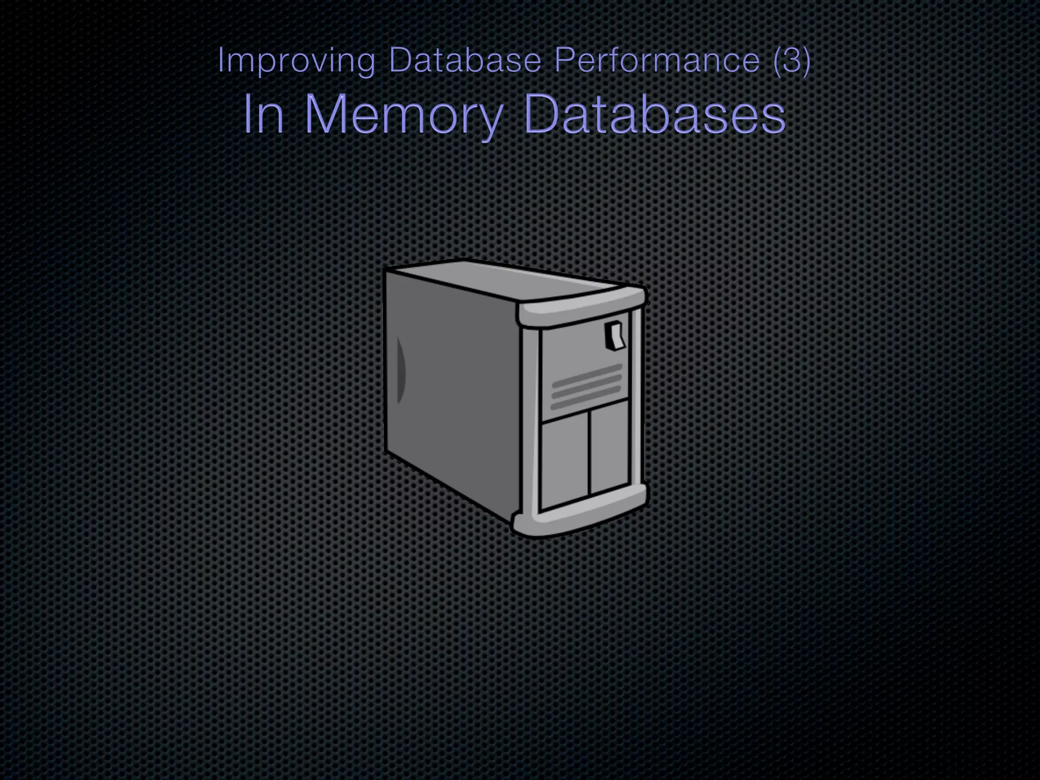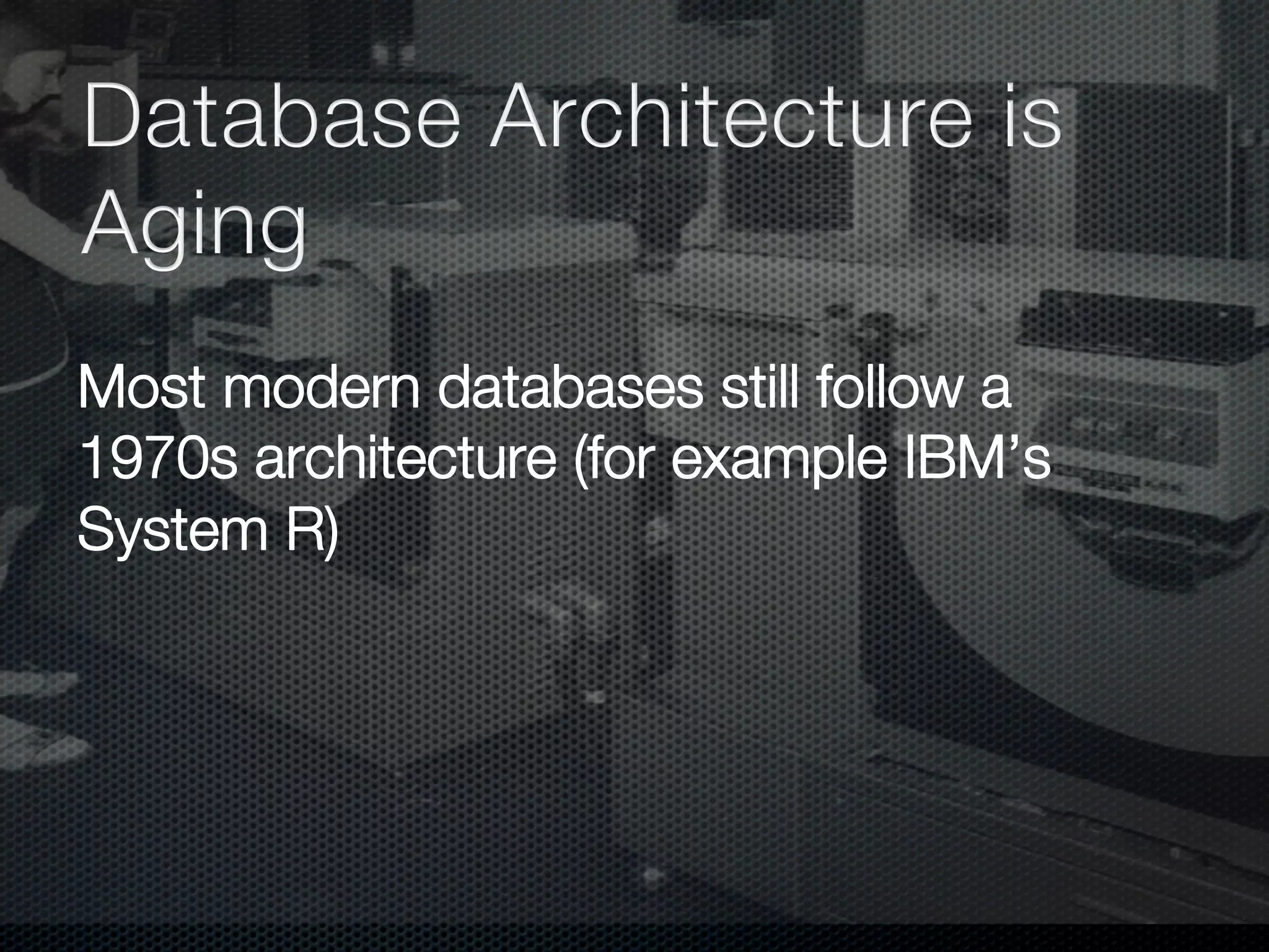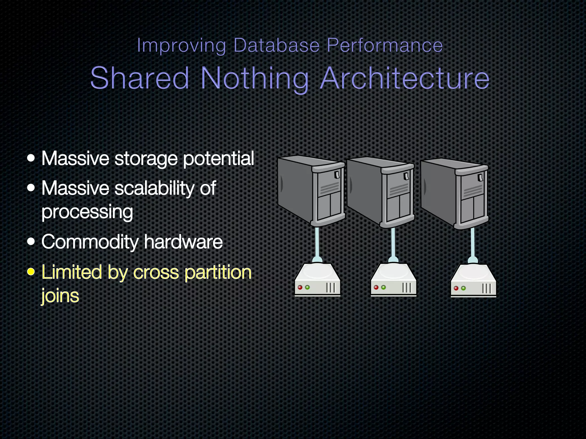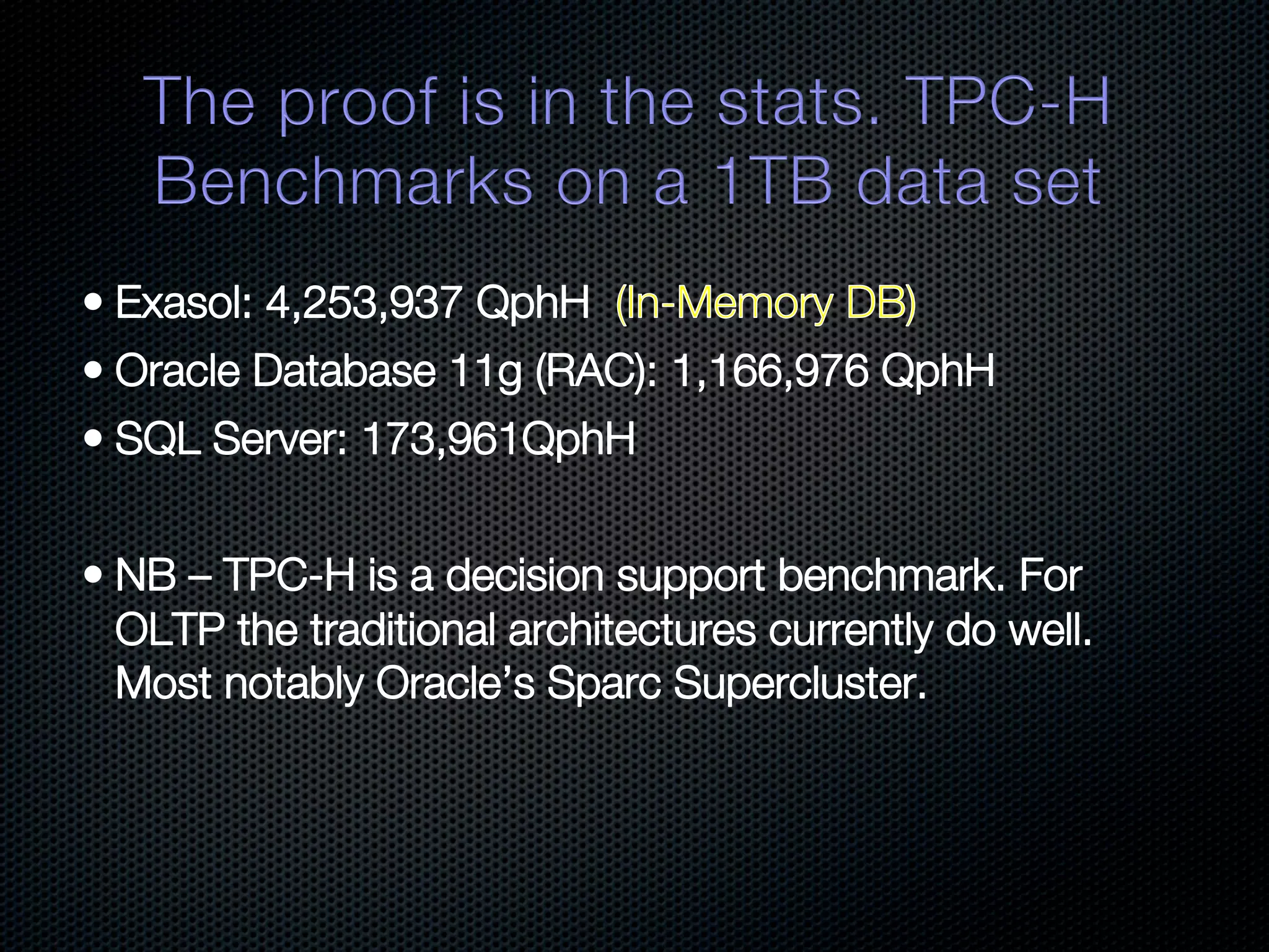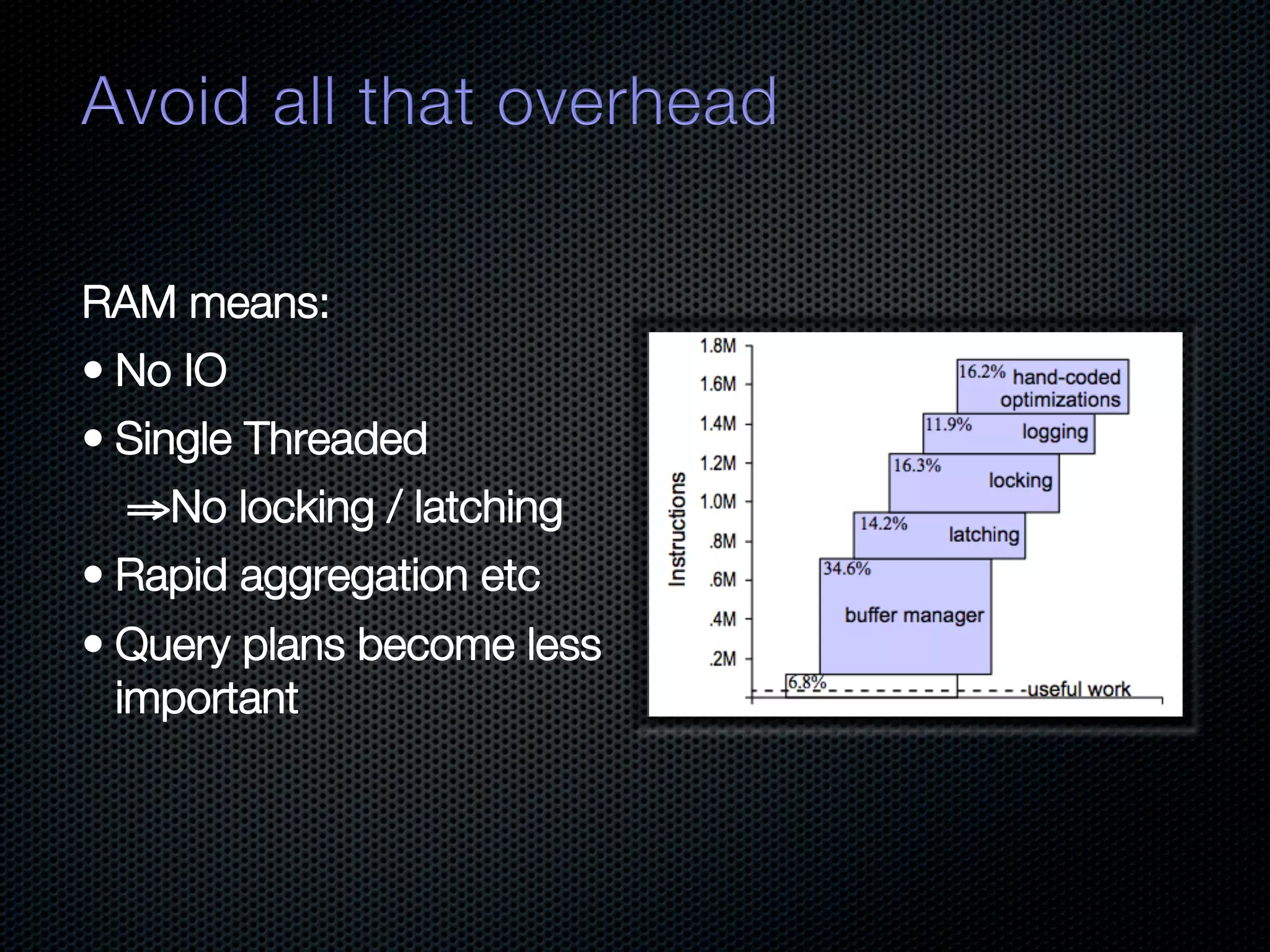 In-memory databases enhance performance but face challenges with data durability and complexity due to traditional disk-based architectures. The document discusses how techniques like partitioning and connected replication can alleviate issues related to joins across distributed systems while maintaining efficient data access. It emphasizes the use of snowflake schemas and caching strategies to optimize data processing in a multi-node environment.
