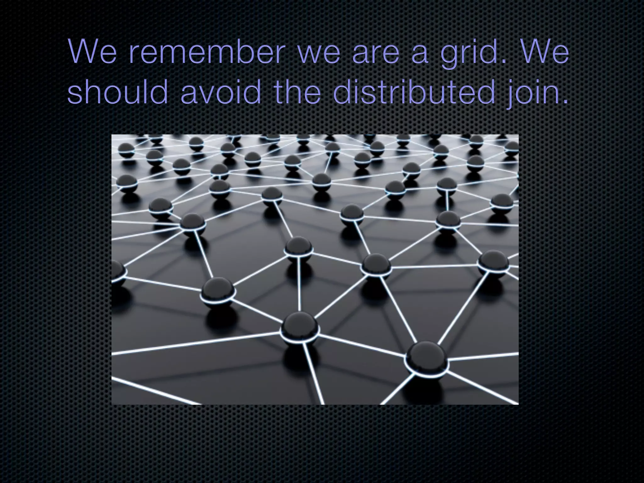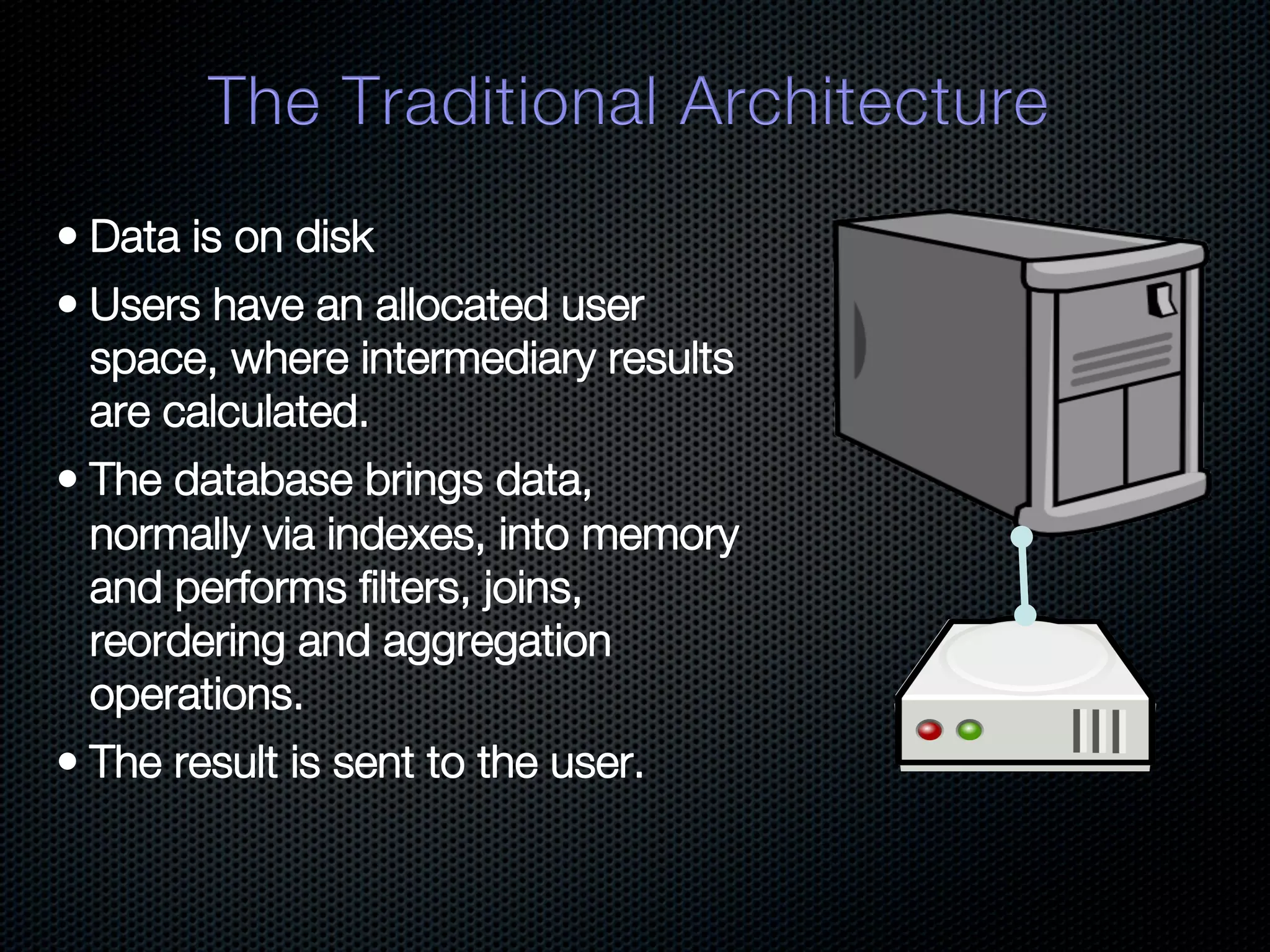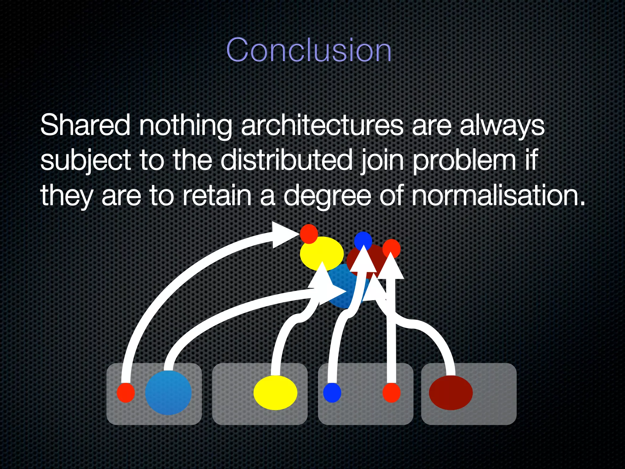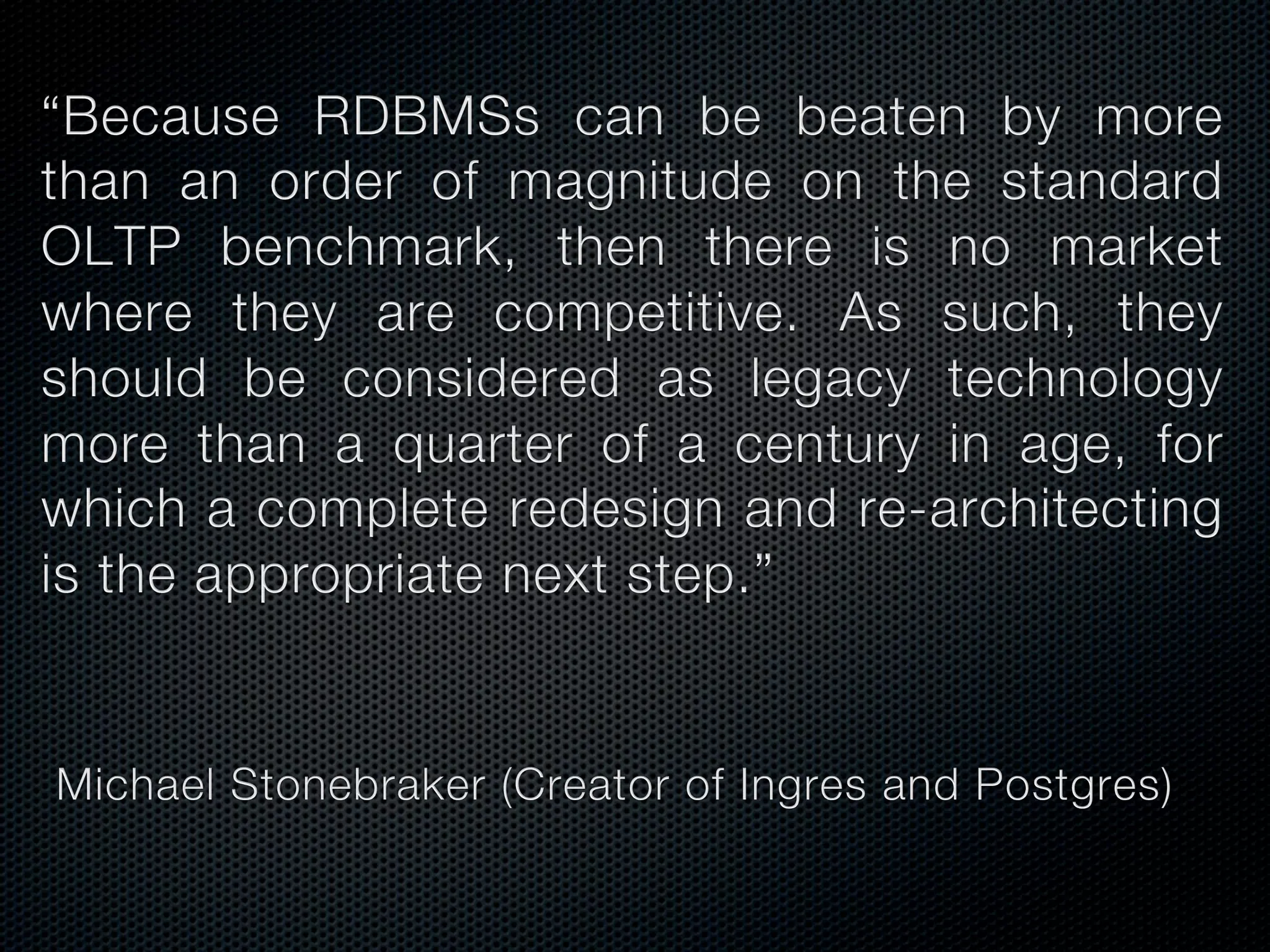 In-memory databases enhance performance but face challenges with data durability and complexity due to traditional disk-based architectures. The document discusses how techniques like partitioning and connected replication can alleviate issues related to joins across distributed systems while maintaining efficient data access. It emphasizes the use of snowflake schemas and caching strategies to optimize data processing in a multi-node environment.
