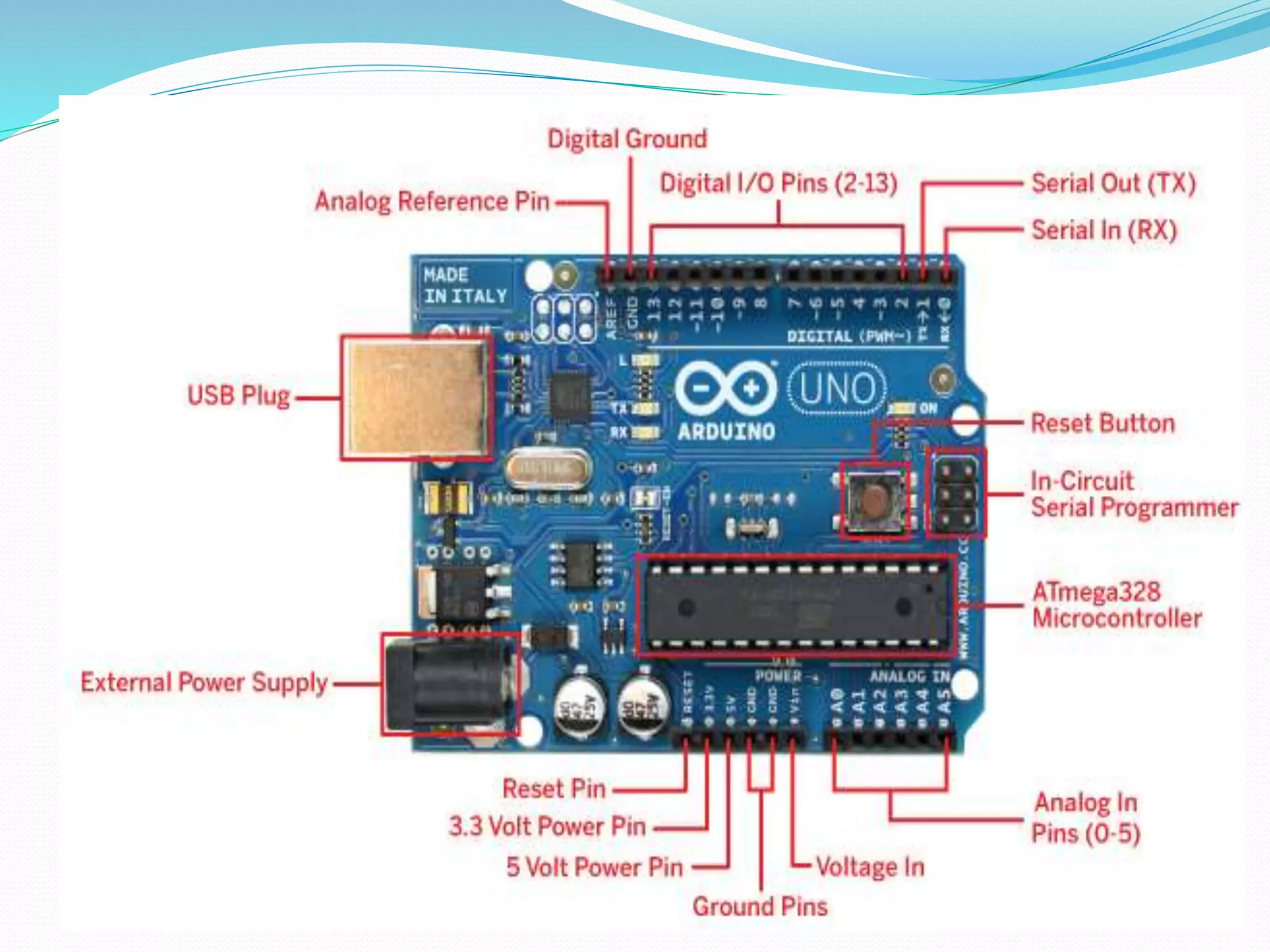 A microcontroller is a computer on a single integrated chip that contains a processor, memory, and input/output ports. Common microcontroller families include Intel, Atmel, Microchip, and ARM. Microcontrollers are used in devices like cellphones, toys, appliances, cars, and cameras. The Arduino is an open-source hardware and software platform for building electronics projects. It consists of a microcontroller board, which can be programmed using the Arduino programming language, which is based on C/C++. The Arduino Uno is a popular Arduino board that uses the ATmega328P microcontroller. Accessories called shields can be added to Arduino boards to expand their functionality. The