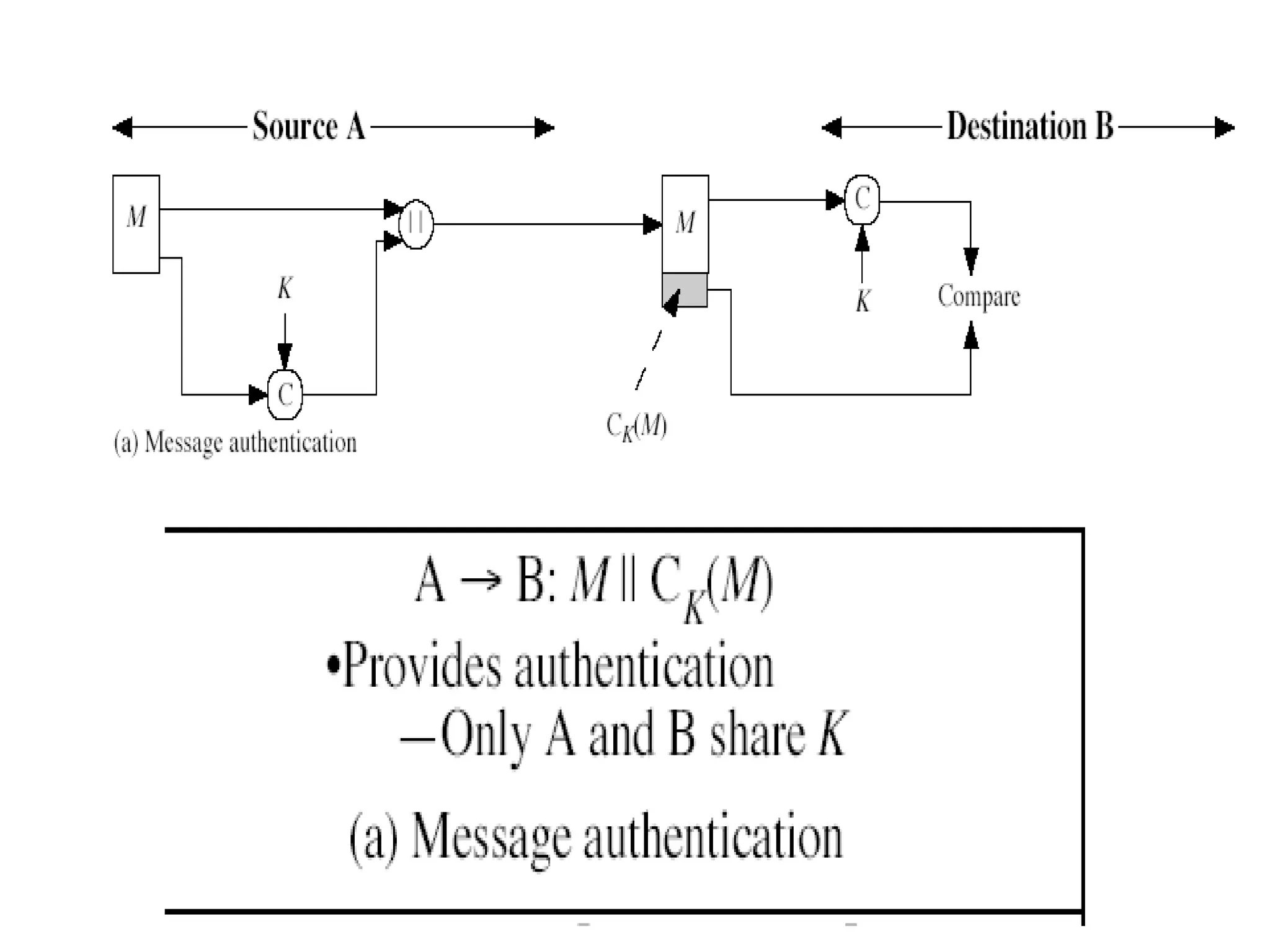 Message Authentication messageauthentication is concerned with: protecting the integrity of a message validating identity of originator non-repudiation of origin (dispute resolution) will consider the security requirements then three alternative functions used: message encryption message authentication code (MAC) hash function