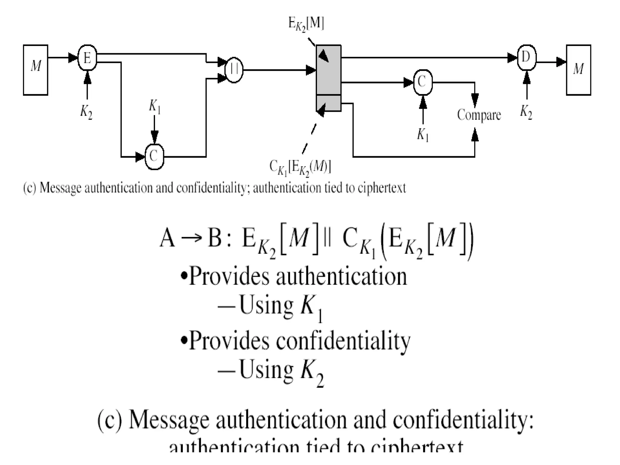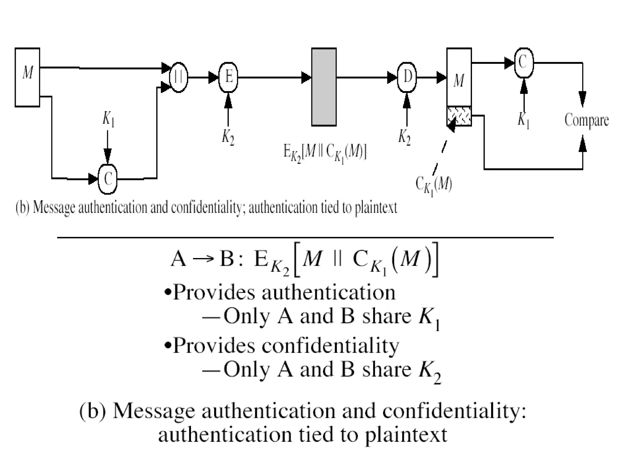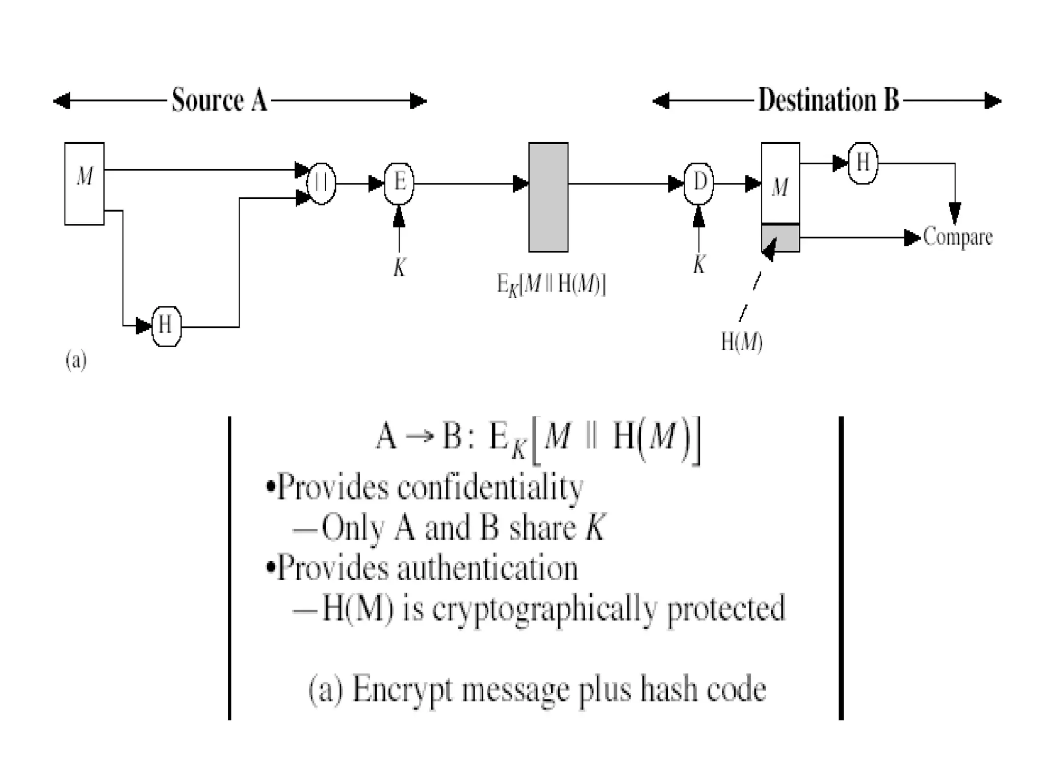 Message Encryption messageencryption by itself also provides a measure of authentication if symmetric encryption is used then: receiver know sender must have created it since only sender and receiver now key used know content cannot of been altered if message has suitable structure, redundancy or a checksum to detect any changes
