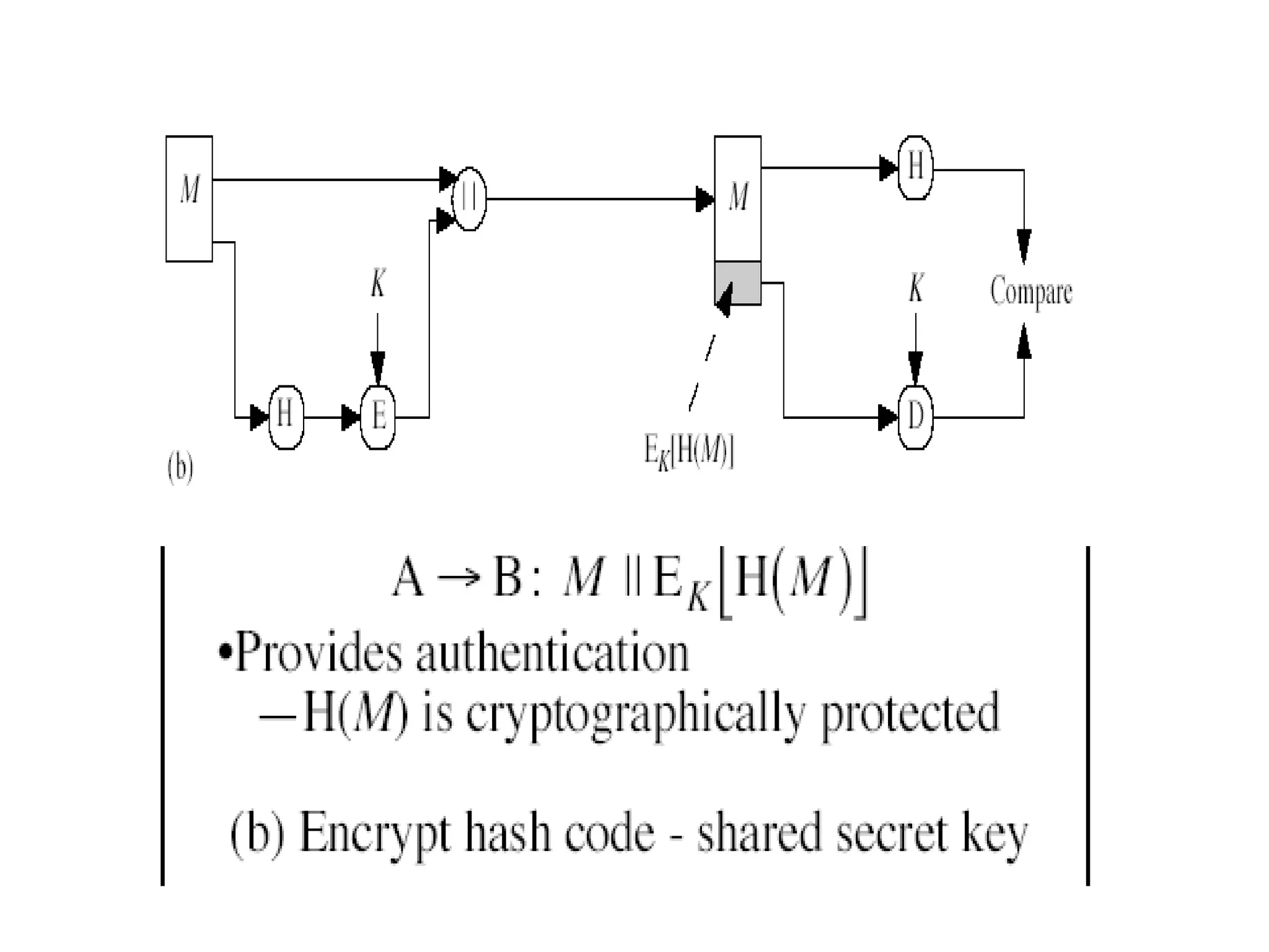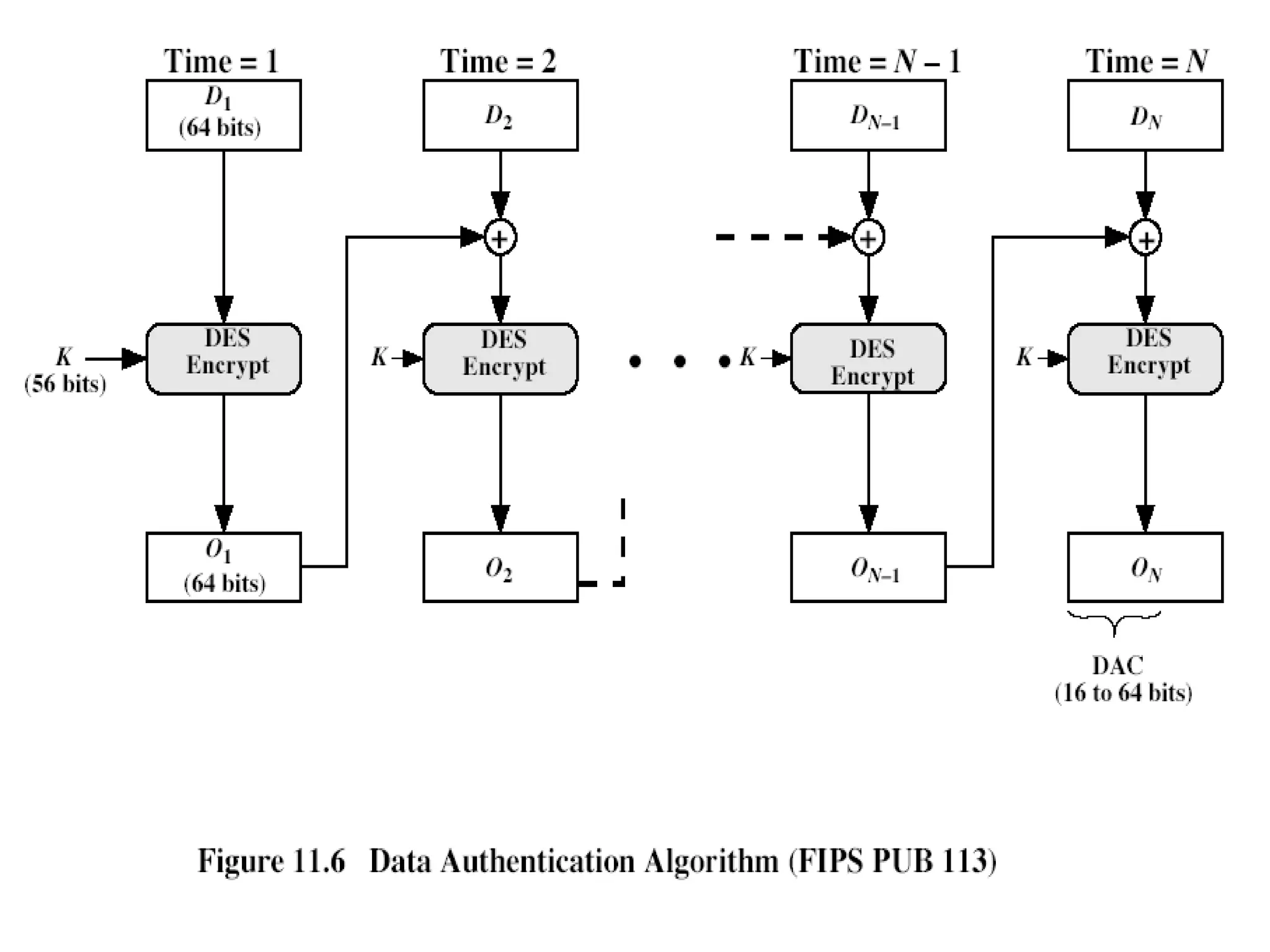 Using Symmetric Ciphersfor MACs can use any block cipher chaining mode and use final block as a MAC Data Authentication Algorithm (DAA) is a widely used MAC based on DES-CBC using IV=0 and zero-pad of final block encrypt message using DES in CBC mode and send just the final block as the MAC or the leftmost M bits (16 M 64) of final block ≤ ≤ but final MAC is now too small for security