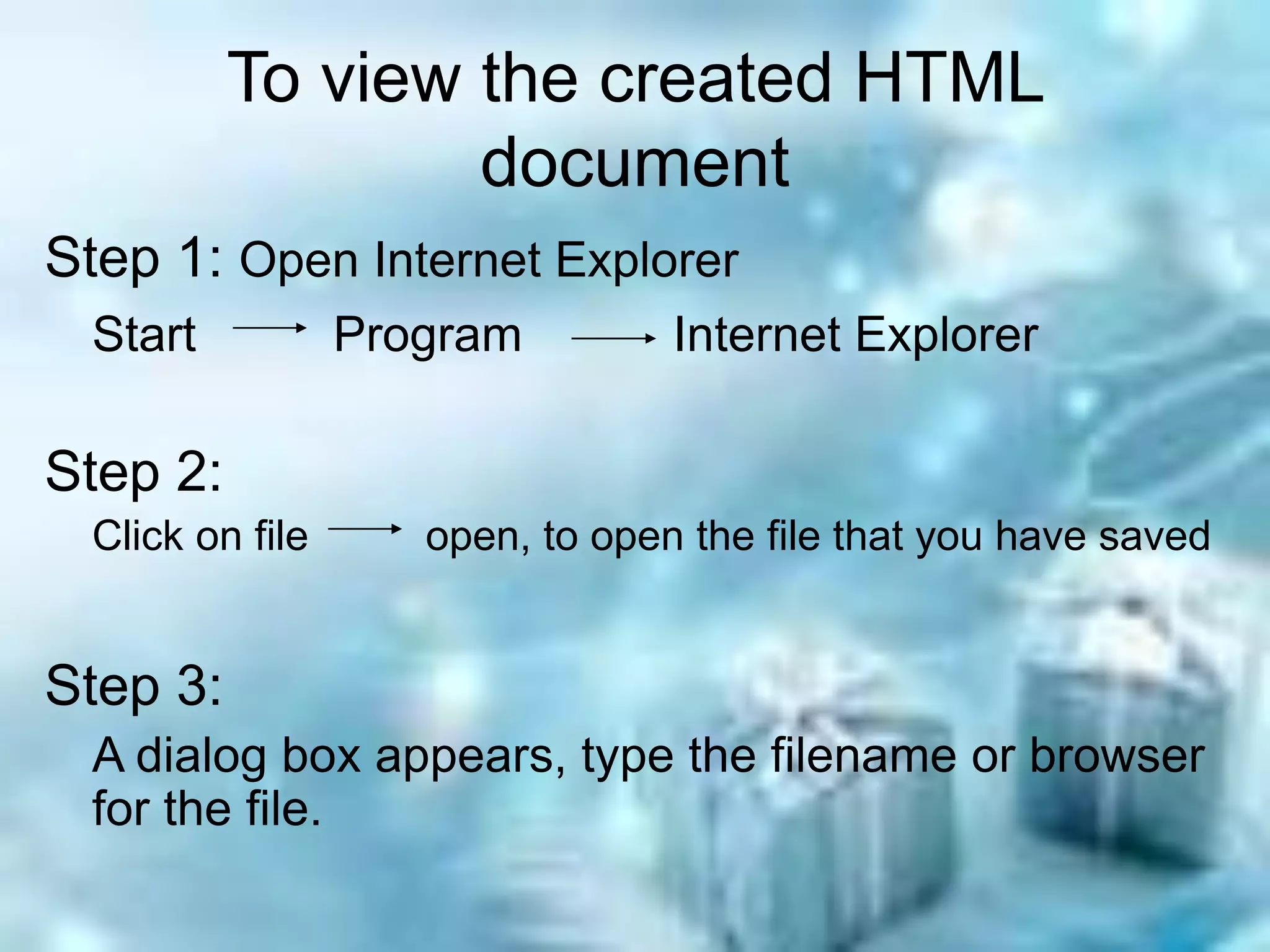 This document provides an introduction to HTML (Hyper Text Markup Language). It discusses that HTML was created in 1989 by Tim Berners-Lee to link related information stored on computers that could be accessed worldwide. The document outlines the tools needed to create and view HTML documents, including a text editor, web browser, graphics tool, and optionally a web server. Steps are provided for starting an HTML document, viewing the created document, and modifying existing HTML code.