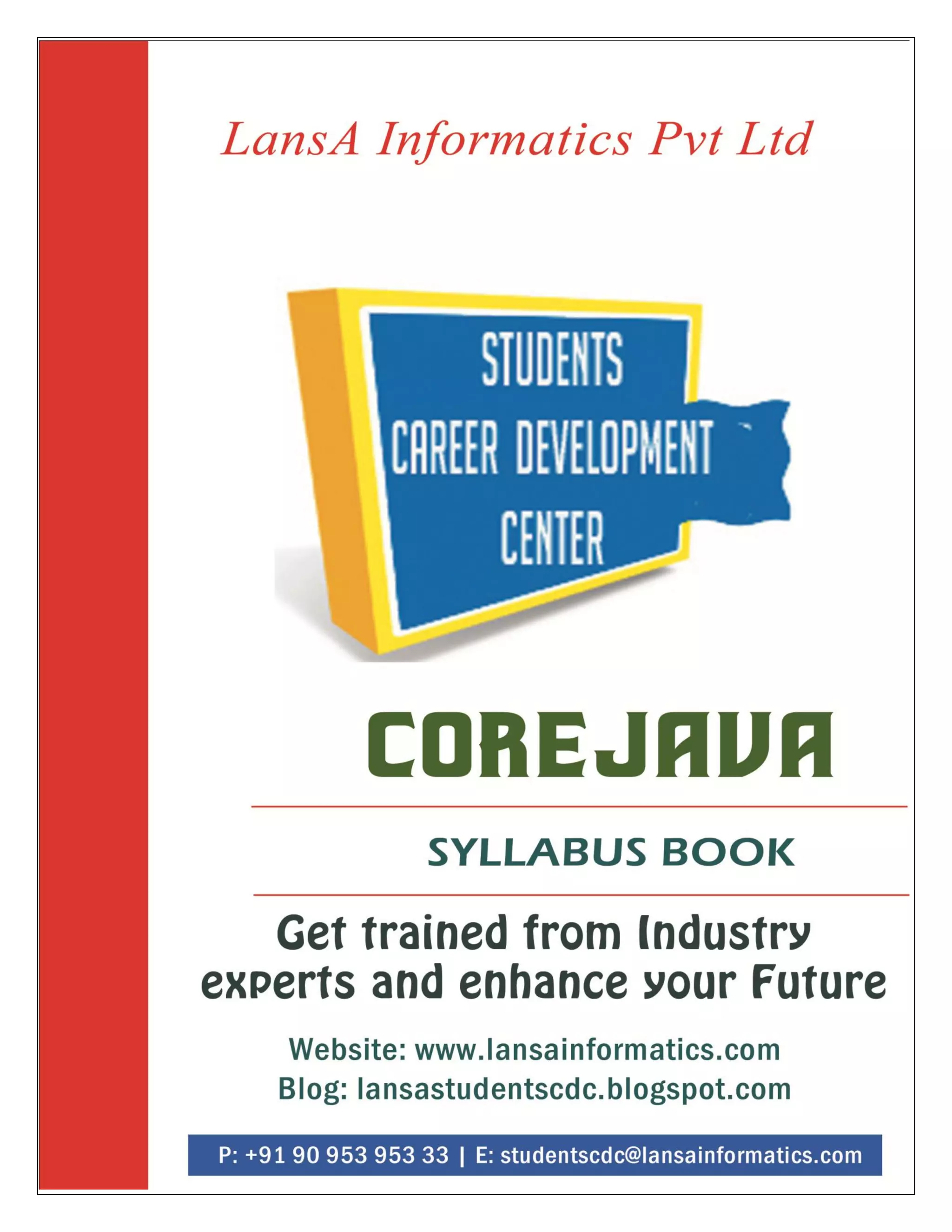 CORE JAVA SYLLABUS MODULE1: INTRODUCTION TO JAVA What is java? Object oriented programming Internet programming Platform Independency Internet Security C,C++ VS Java MODULE 2: OOPS CONCEPTS AND THEIR IMPLEMENTATION IN JAVA OOPs concept , its properties and uses Defining methods and variables in java Class Member and instance members Java First Program Role of Constructor Use of Final Keywords Memory Management Using Garbage collector Overloading and Overriding Use of this and supper Keywords Inheritance Dynamic Binding and Static Binding Runtime Polymorphism and its Power Abstract class and Interfaces Inner / Nested classes and its uses MODULE 3: PACKAGES Introduction of Package Programs related to Packages Scope of Access Modifiers MODULE 4: EXCEPTION HANDLING Introduction of exception and Error Throwable class Try, catch and finally blocks Throw and throws Keywords Checked and Unchecked Exception User Define Exception MODULE 5: MULTITHREADING What is Program, Process, Thread Multiprocessing, multithreading and Multitasking Use of sleep() and suspend Methods Integrated Thread Synchronization Use of wait(), noitify() and notifyAll() Mwthods What Is the JDBC API? Driver Types Two-tier and Three-tier Models Connection Overview Statement Overview Sending Batch Updates ResultSet Overview Concurrency Types PreparedStatement Overview CallableStatement Overview