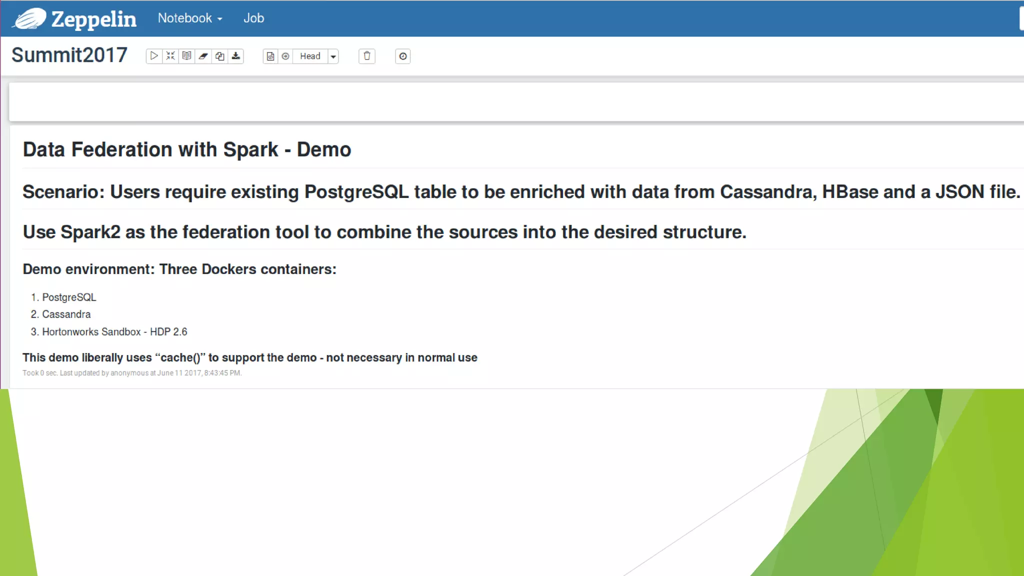 The document details the process of data federation using Apache Spark with multiple data sources including PostgreSQL, HBase, and Cassandra. It includes SQL commands for creating tables and inserting data across these platforms, as well as examples of querying and joining data. The objective of the project is to demonstrate how to combine data from different storage systems into a cohesive analysis framework.