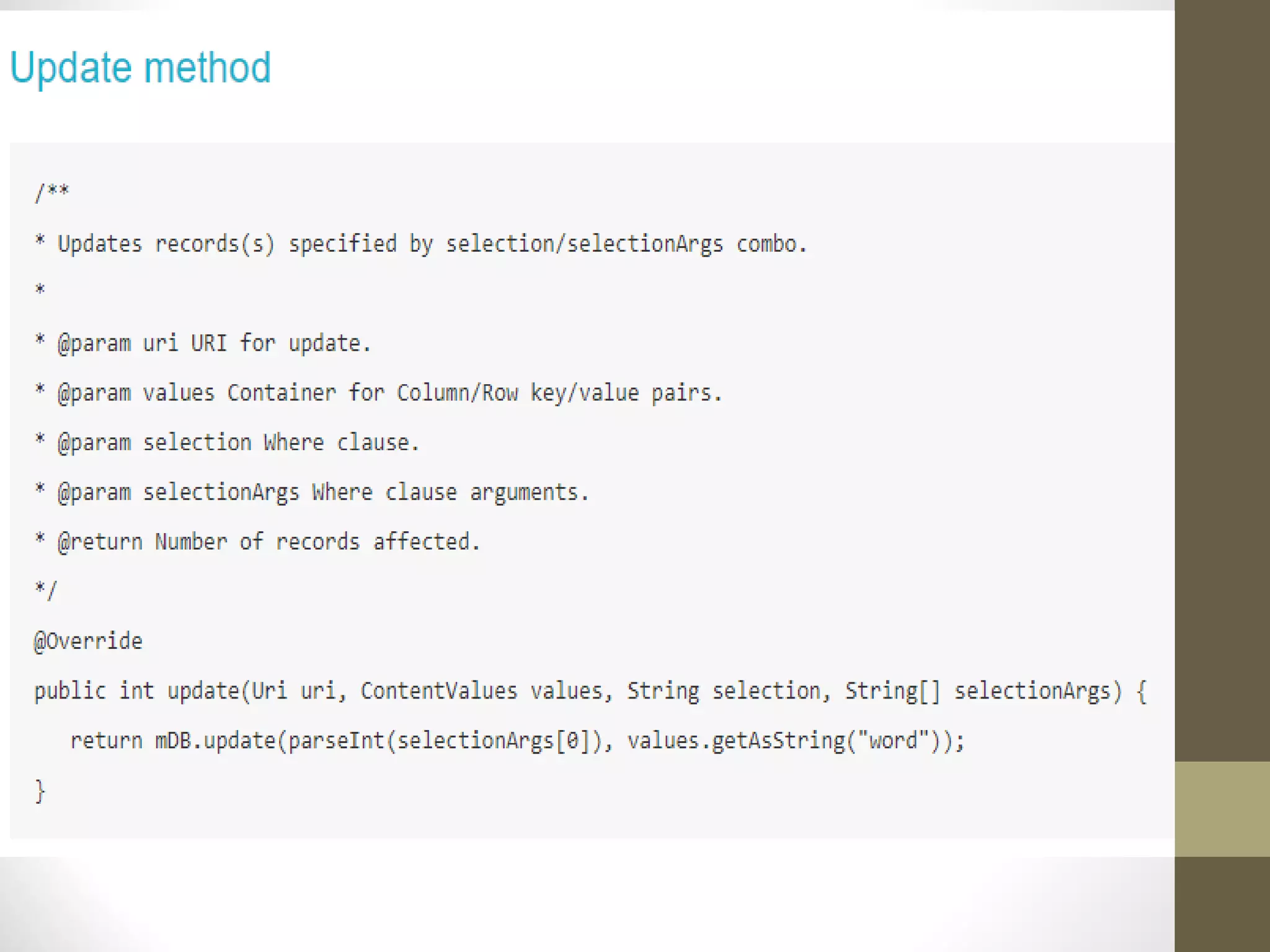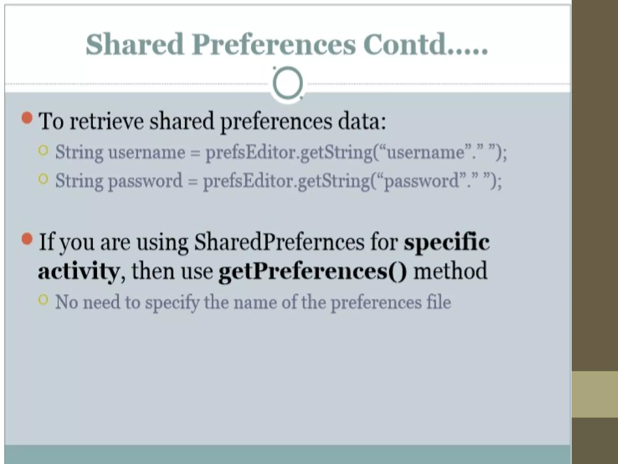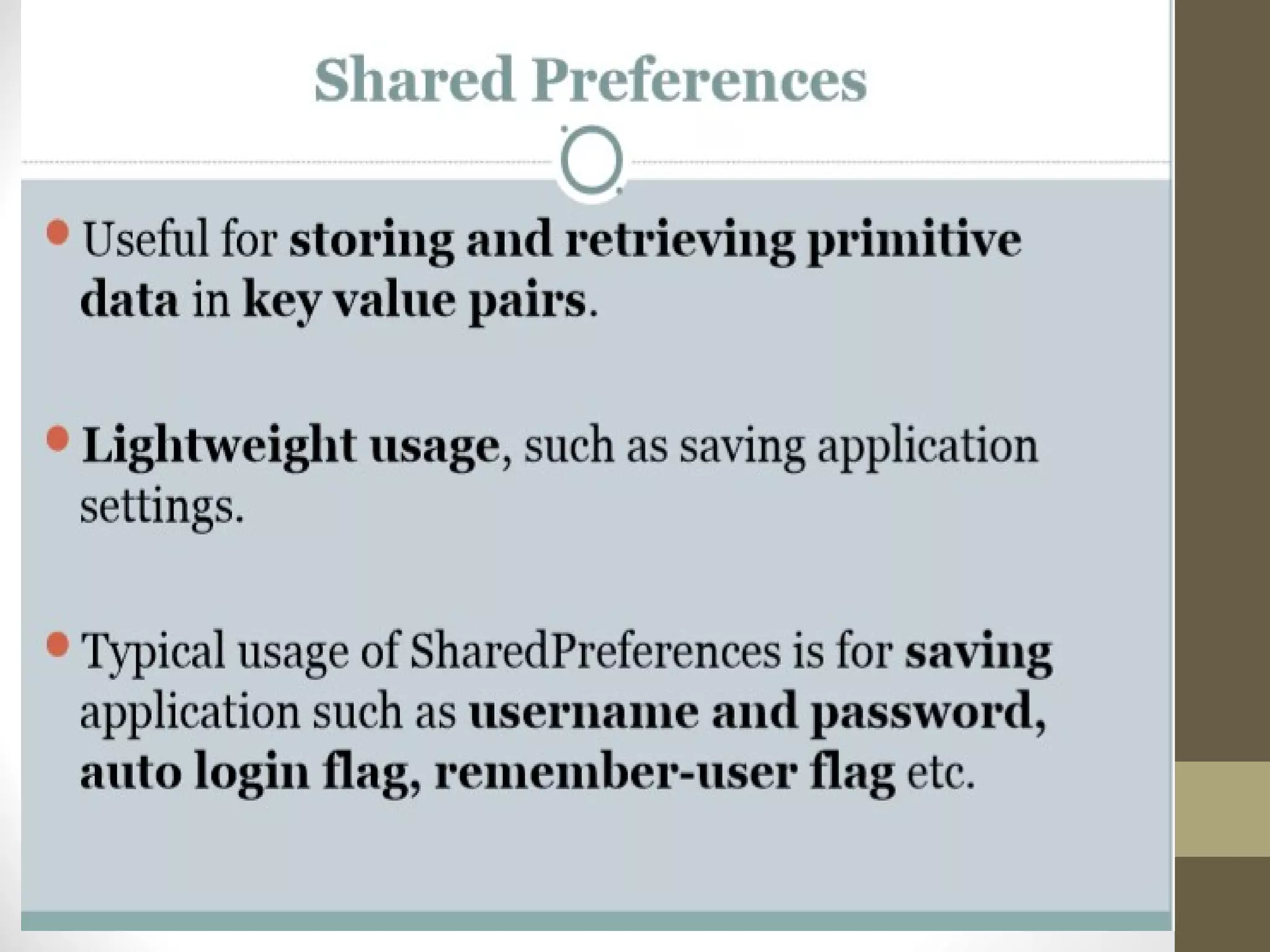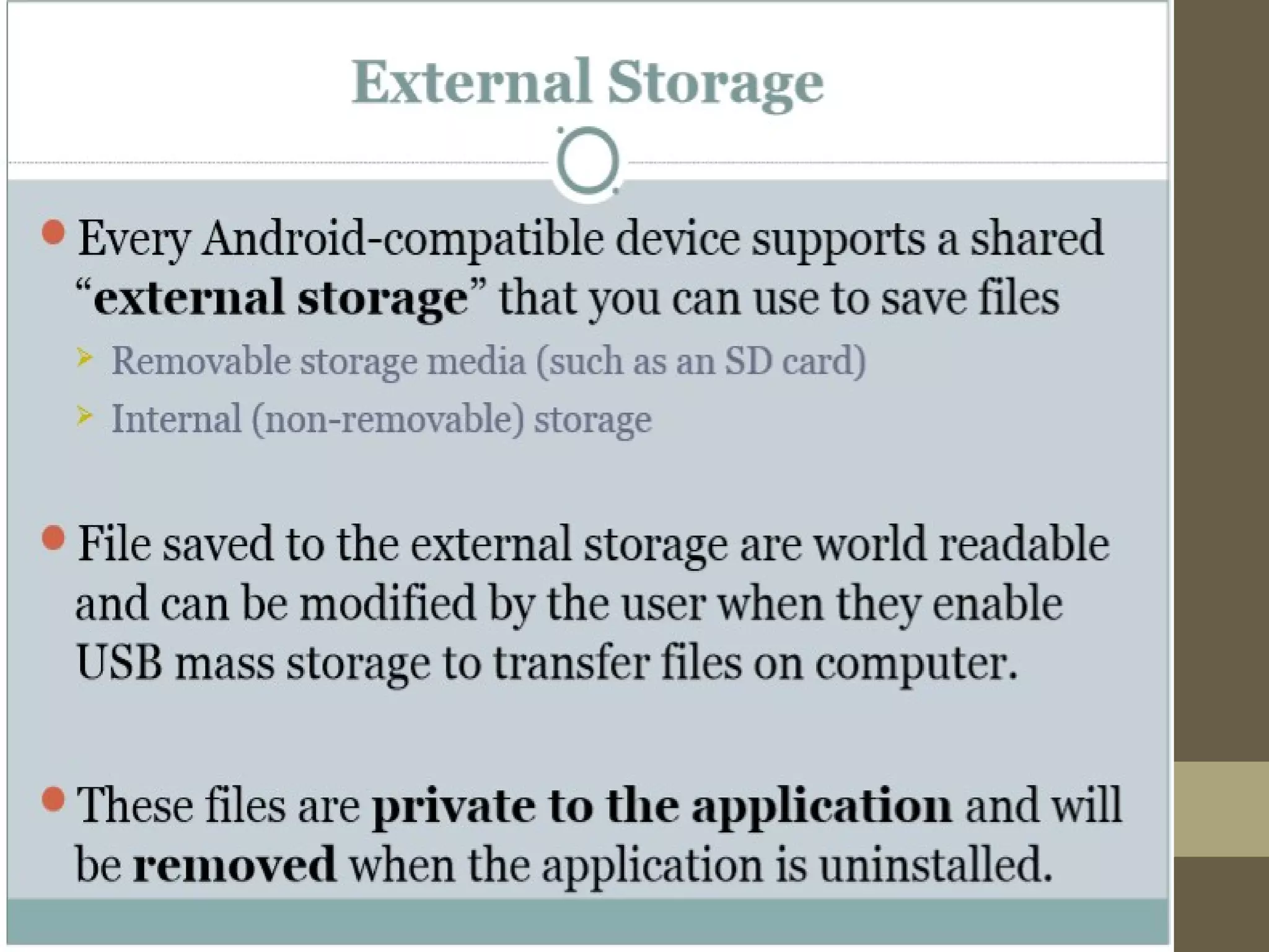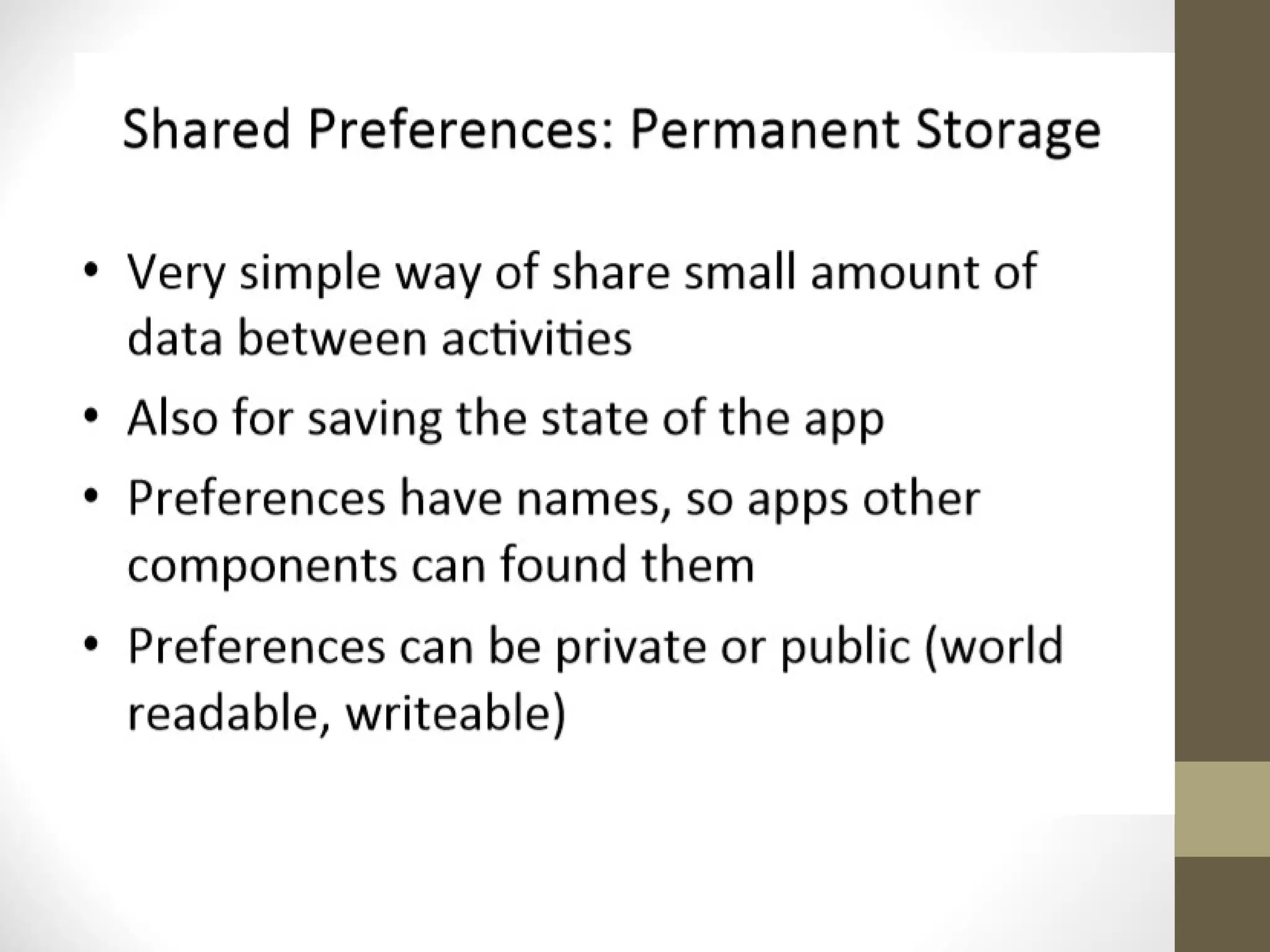 This document discusses different options for data persistence in Android applications. It explains that persistence allows data to survive after the creating process ends by writing to non-volatile storage. The main options covered are shared preferences for small chunks of data, file systems for internal and external storage, and SQLite databases to allow relational data through a database management system. Code examples are provided for shared preferences and content providers.
