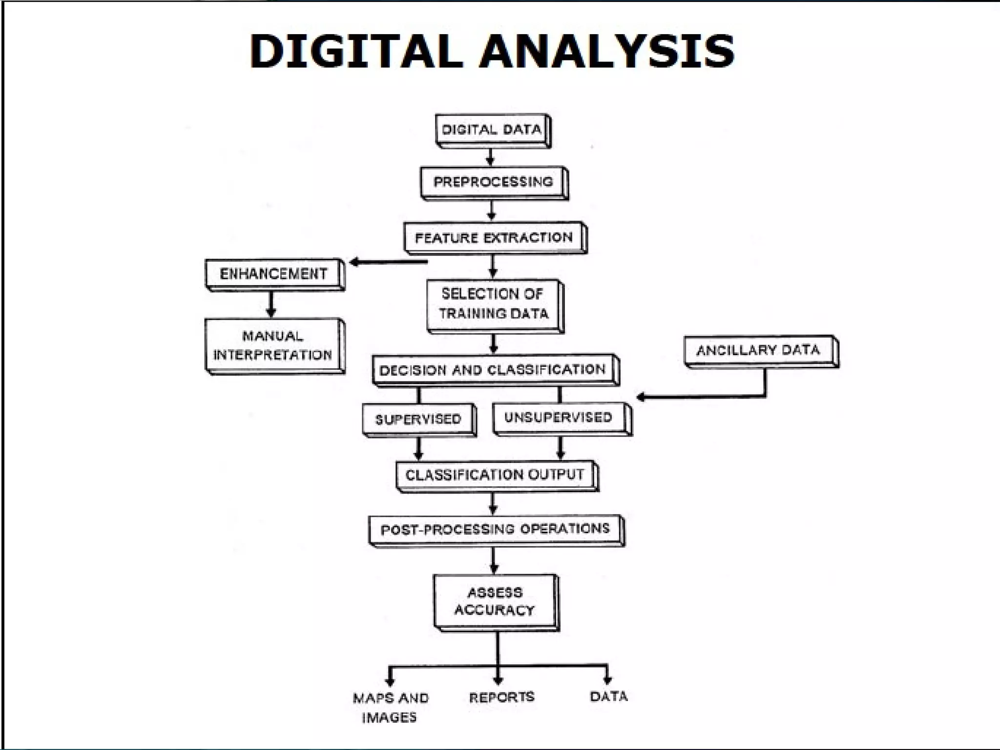 This document provides an introduction to digital image interpretation. It discusses what digital images are, how they can be displayed in color composites, and how surface features typically appear on true and false color composites. It also outlines the main steps in digital image processing, including preprocessing, enhancement, transformation, and classification. Preprocessing operations like radiometric and geometric corrections are described in detail. Methods for image registration, resampling, and spatial filtering are also explained. Spatial filters can be used for tasks like edge detection, image smoothing, and enhancing linear features. Examples demonstrate the effects of low-pass filtering for speckle removal and high-pass edge detection.