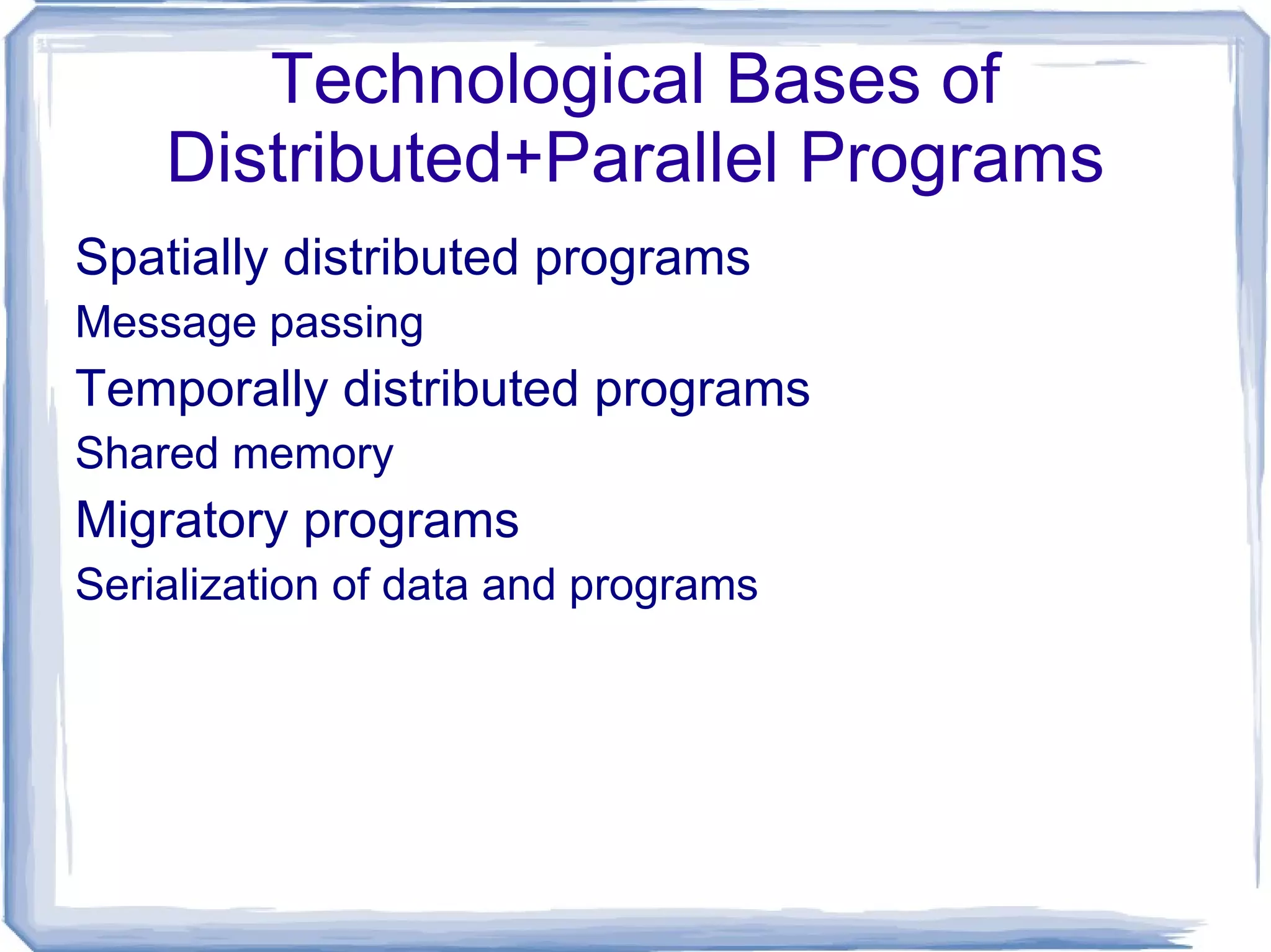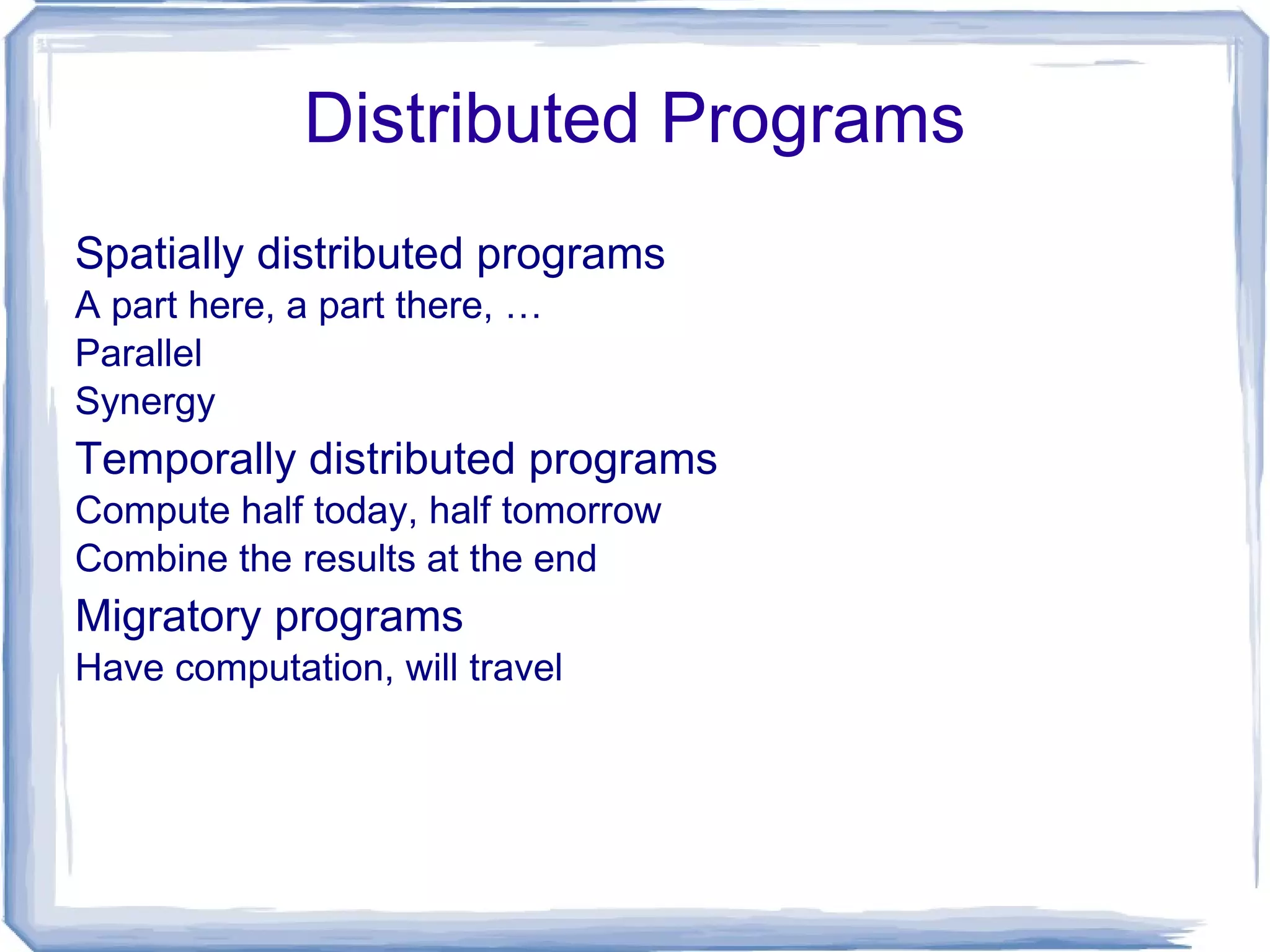 Distributed Computing Wikipedia: It deals with hardware and software systems containing more than one processing element or storage element, concurrent processes, or multiple programs, running under a loosely or tightly controlled regime