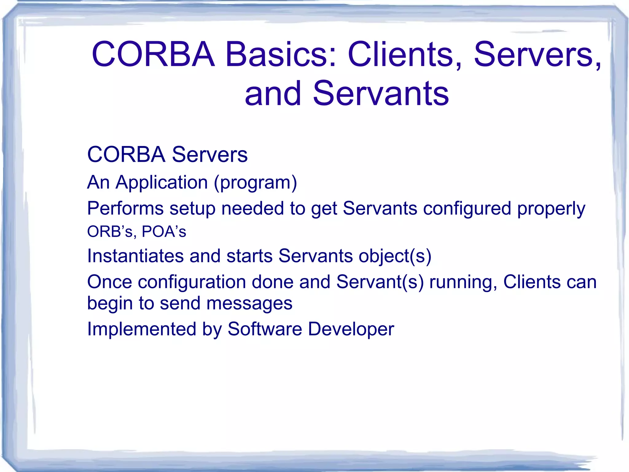 ORB’s and POA’sPOA: Portable Object Adapter A central CORBA goal: Programs using different ORB’s (provided by different ORB Vendors) can still communicate