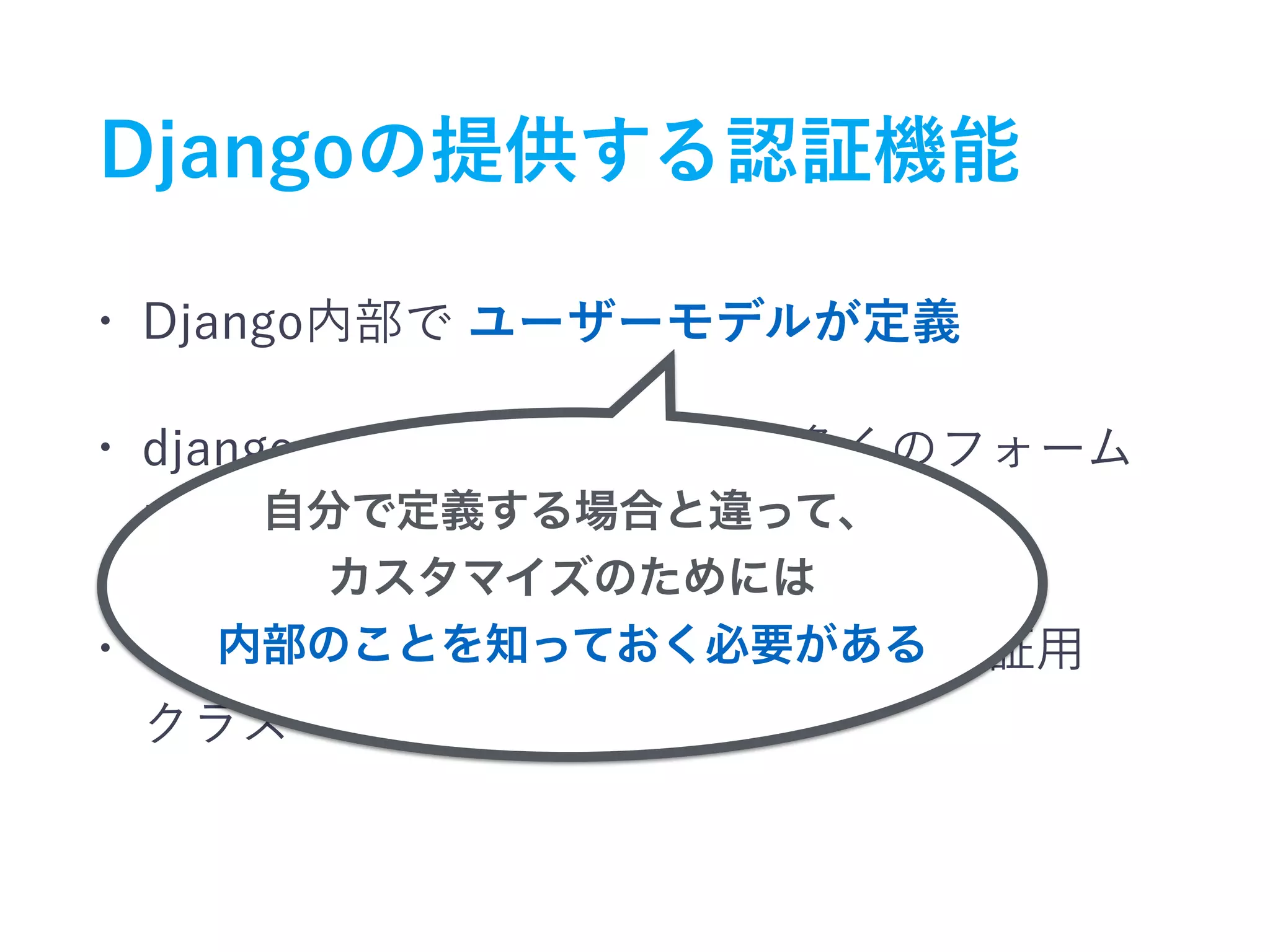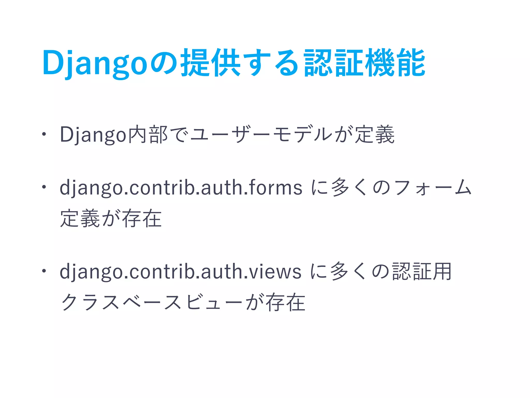 The document discusses Django's built-in authentication forms and view classes, detailing a custom email authentication backend implementation. It includes code snippets for user authentication and validation, highlighting the use of Django's user model and custom validators. Additionally, it references GitHub links for further examples and modifications related to the authentication process.