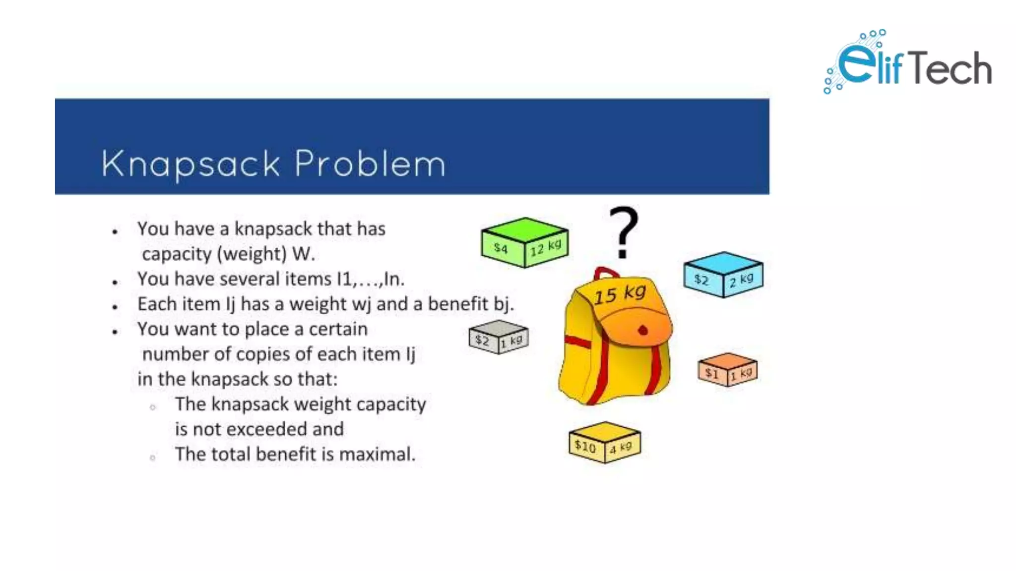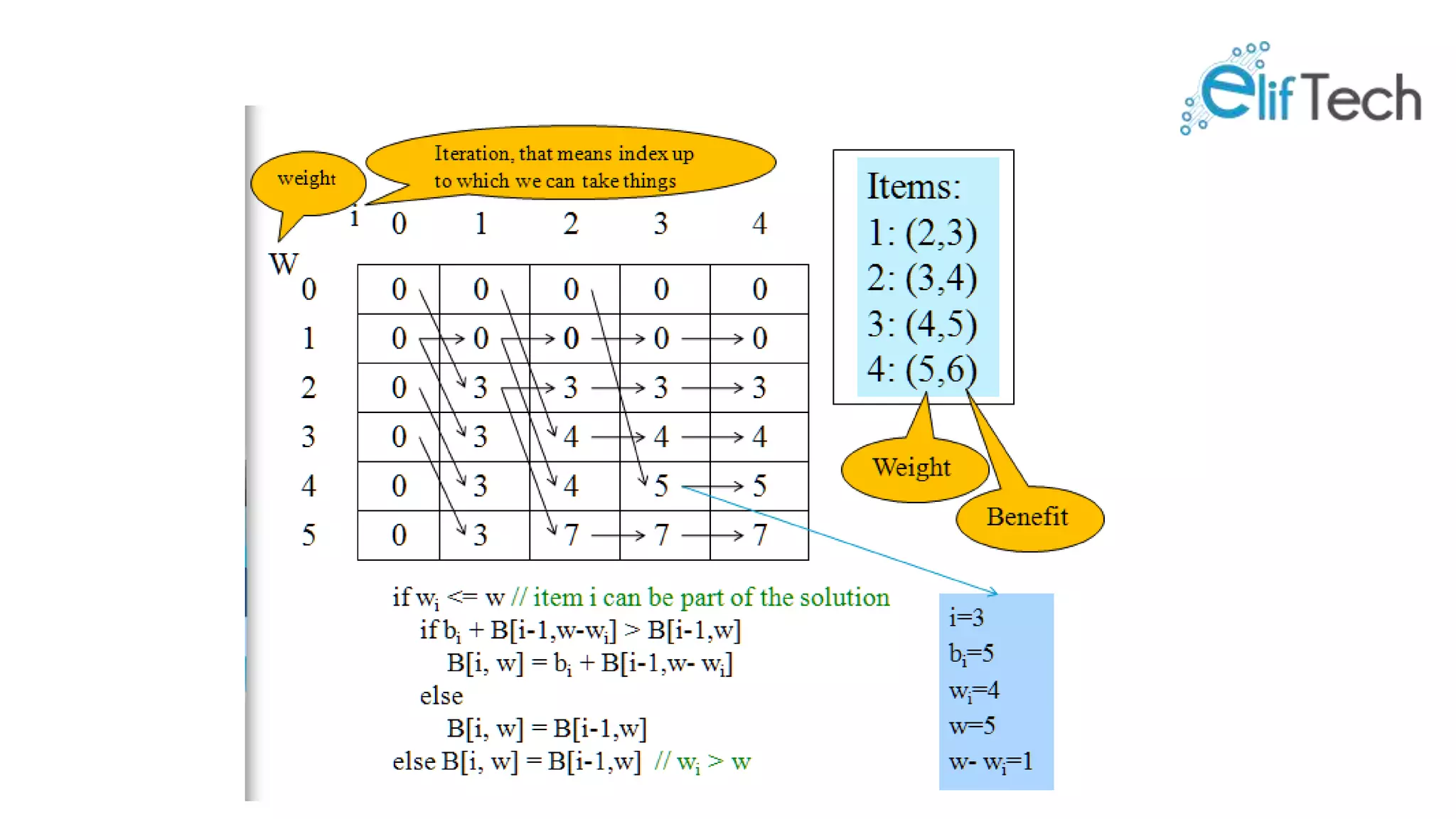 A simple solutionis to consider all subsets of items and calculate the total weight and value of all subsets. Consider the only subsets whose total weight is smaller than W. From all such subsets, pick the maximum value subset.