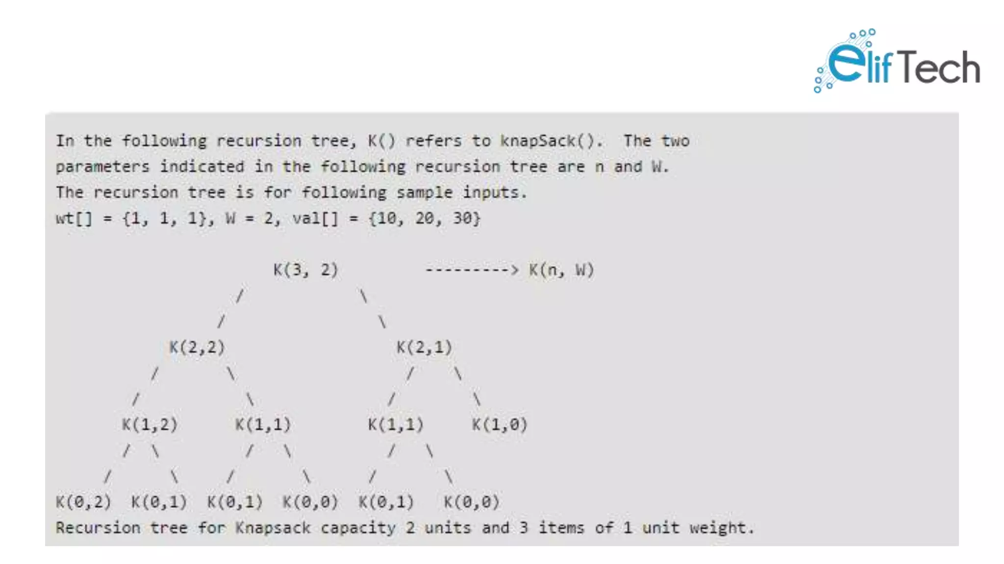 Optimal Substructure To considerall subsets of items, there can be two cases for every item: (1) the item is included in the optimal subset, (2) not included in the optimal set. Therefore, the maximum value that can be obtained from n items is max of following two values. 1) Maximum value obtained by n-1 items and W weight (excluding nth item). 2) Value of nth item plus maximum value obtained by n-1 items and W minus weight of the nth item (including nth item). If weight of nth item is greater than W, then the nth item cannot be included and case 1 is the only possibility.