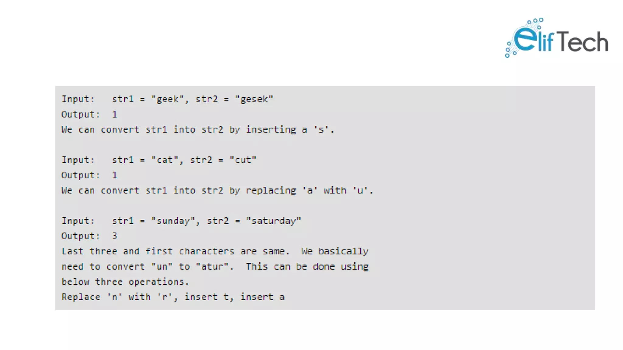 Edit Distance Given twostrings str1 and str2 and below operations that can performed on str1. Find minimum number of edits (operations) required to convert ‘str1’ into ‘str2’. Insert Remove Replace All of the above operations are of equal cost.