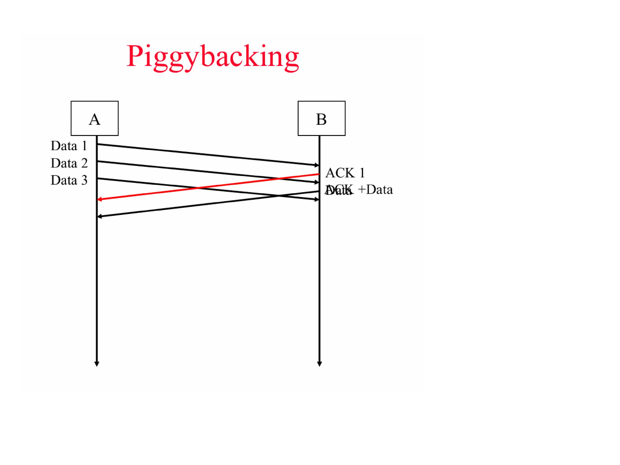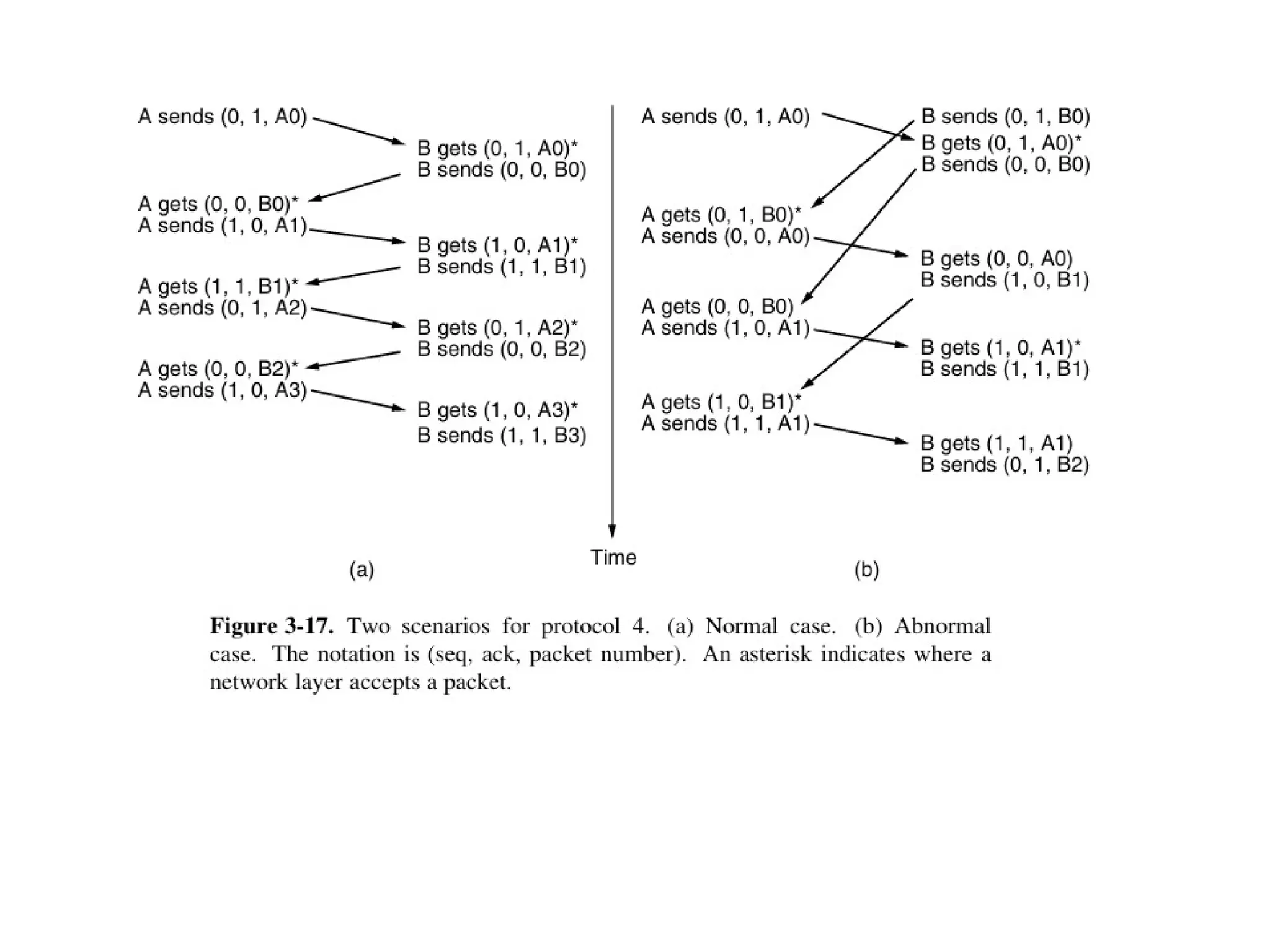 Sliding Window Protocols •Full duplex communication, i.e., same ckt is used to send data/ack in both directions. • Piggybacking: When data frame arrives, receiver (B) instead of sending an ack to A immediately, waits till it has a packet to send to (A) from its network layer. The ack is put in the frame header. Advantage: Better bandwidth utilization. Disadvantage: Waiting for packet could take for ever. Compromise wait a fixed time for packet to send otherwise send separate ack.