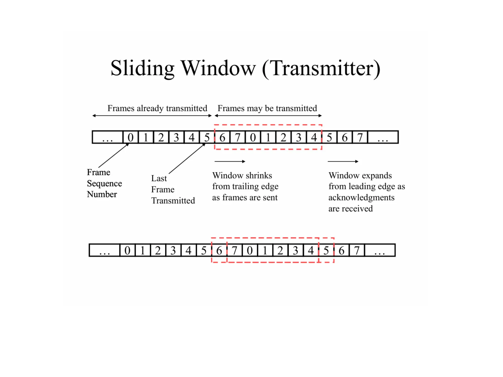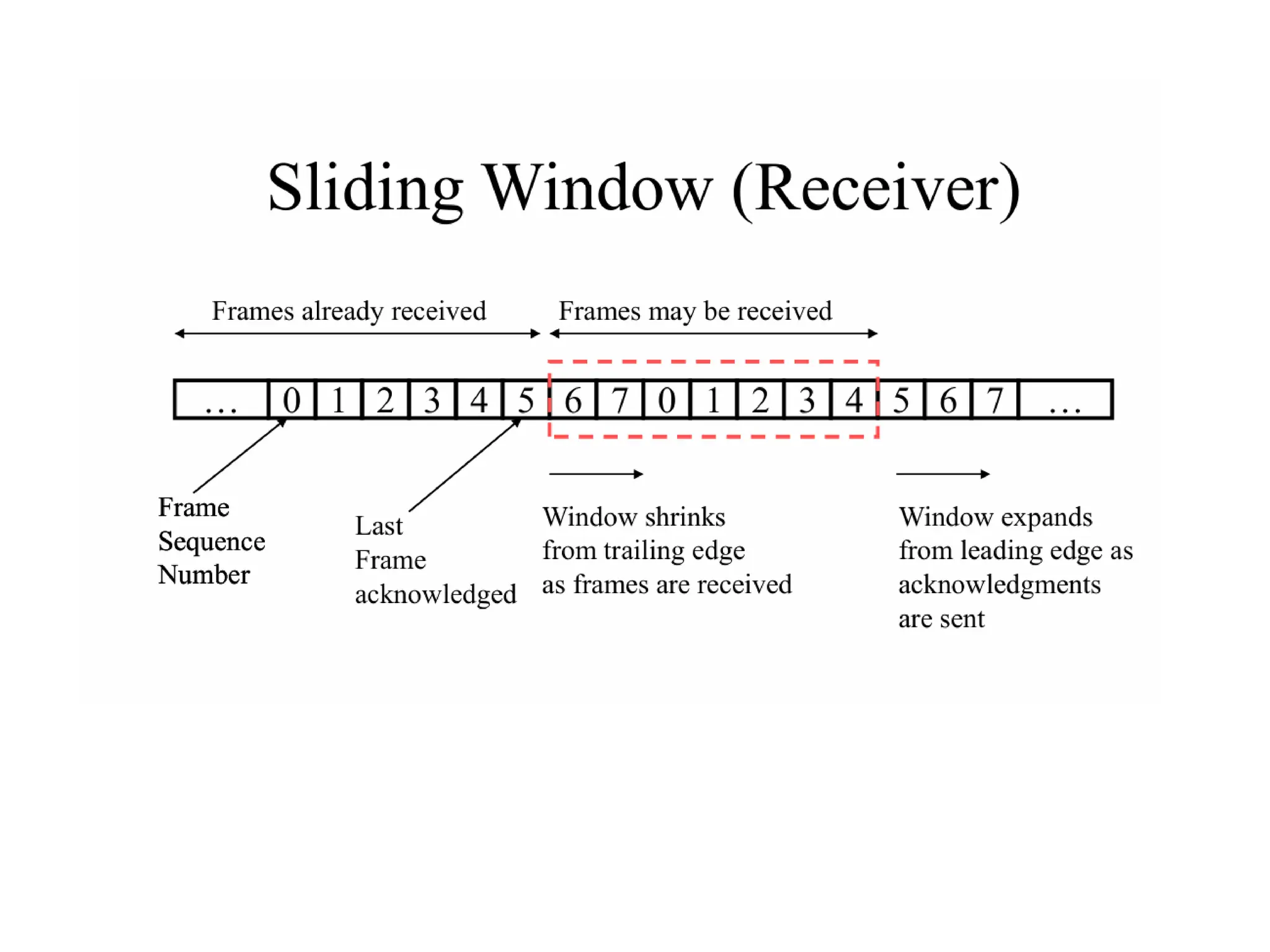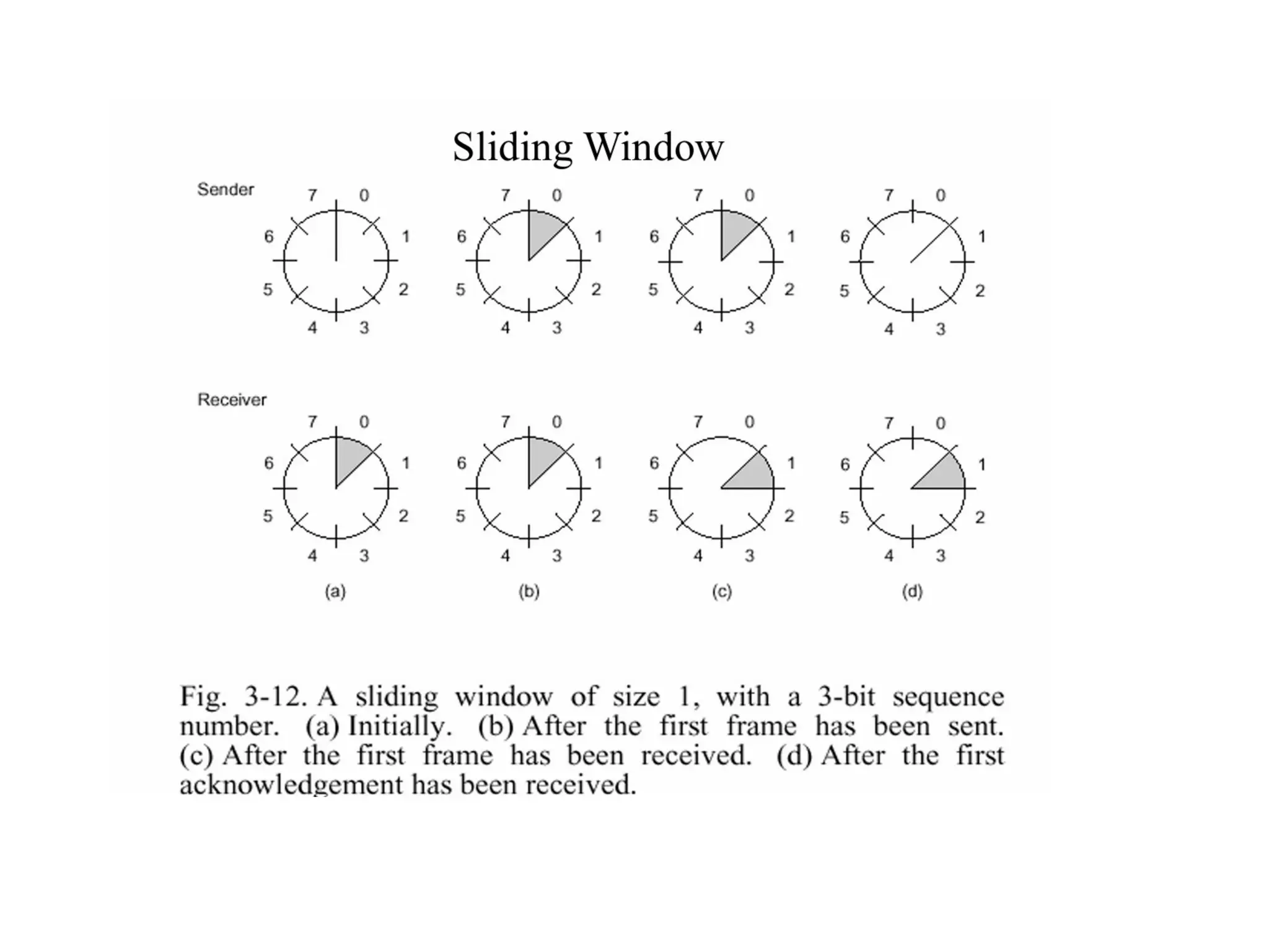 Sliding Window Protocols •RECEIVER: – HFA - NFE + 1 <= RWS. – When frame with sequence number s arrives, the receiver takes the following action. If s < NFE or s > HFA, then the frame is outside the receiver's window and so it is discarded. If NFE <= s <= HFA, then the frame is accepted. – An acknowledgment for s is sent if the following conditions are met: • s has not yet been acknowledged. • all frames in the range from NFE to s have been received.