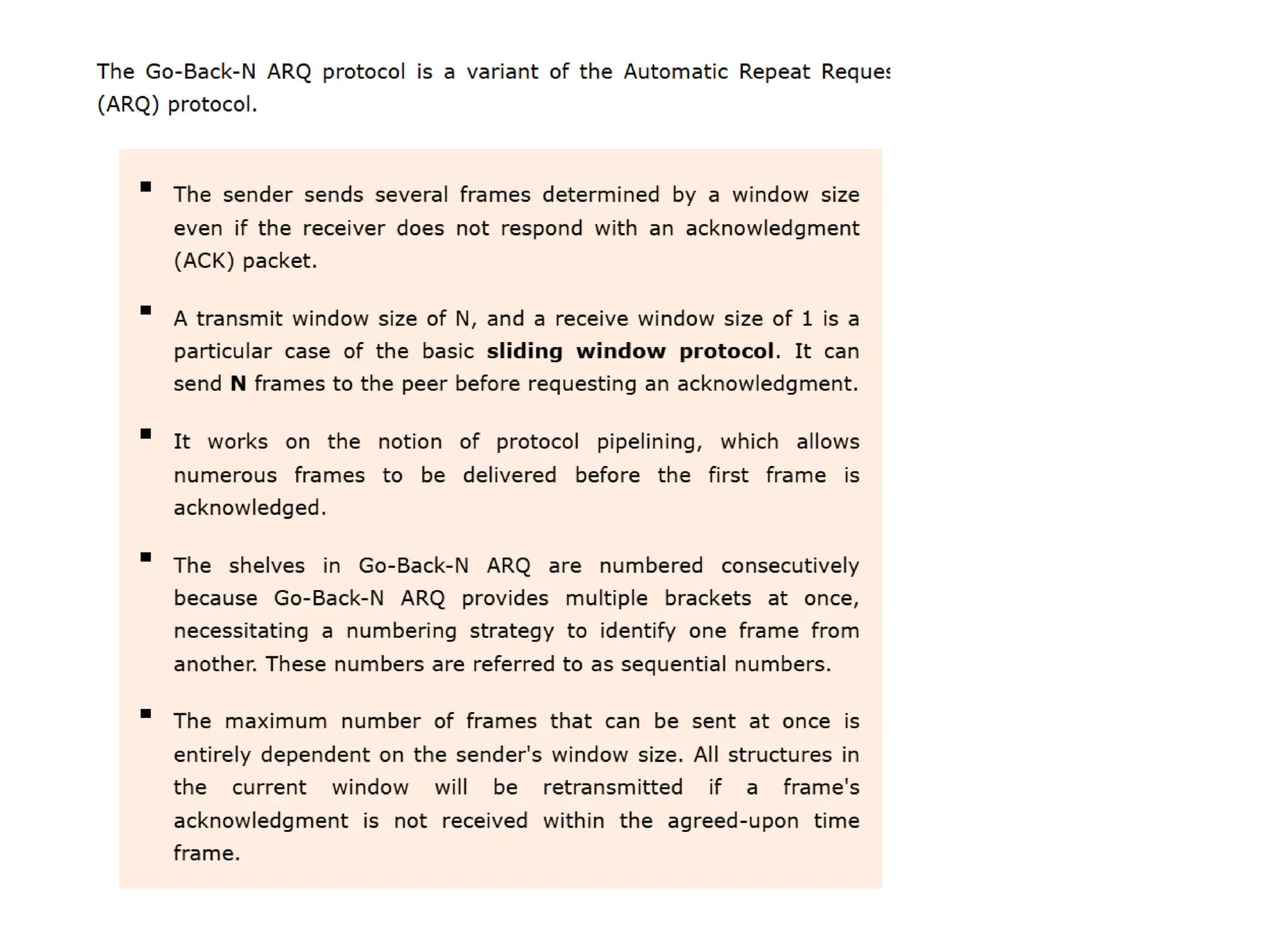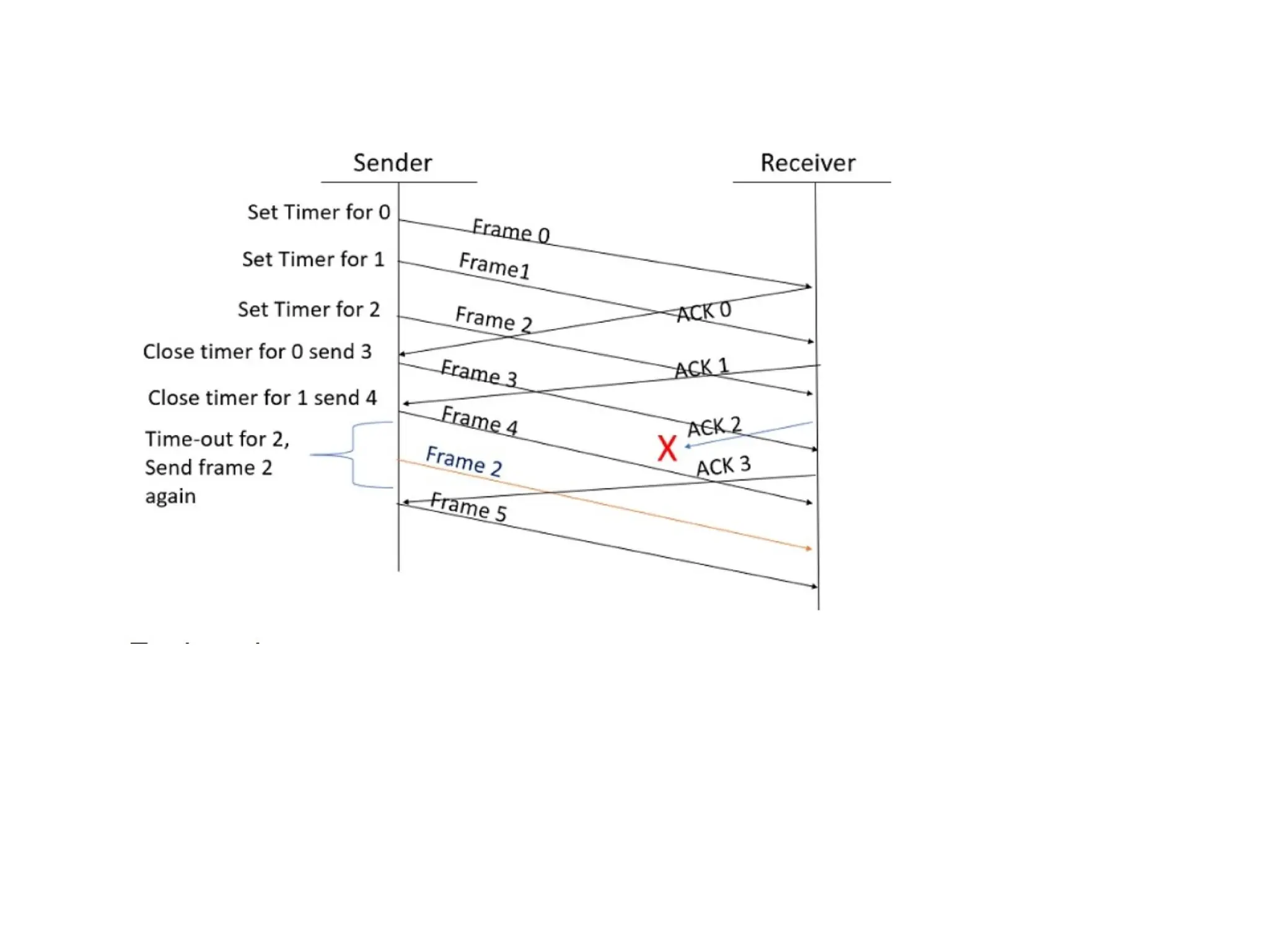 Step 1 Frame0 sends from sender to receiver and set timer. Step 2 Without waiting for acknowledgement from the receiver another frame, Frame1 is sent by sender by setting the timer for it. Step 3 In the same way frame2 is also sent to the receiver by setting the timer without waiting for previous acknowledgement. Step 4 Whenever sender receives the ACK0 from receiver, within the frame 0 timer then it is closed and sent to the next frame, frame 3. Step 5 whenever the sender receives the ACK1 from the receiver, within the frame 1 timer then it is closed and sent to the next frame, frame 4. Step 6 If the sender doesnt receive the ACK2 from the receiver within the time slot, it declares timeout for frame 2 and resends the frame 2 again, because it thought the frame2 may be lost or damaged.