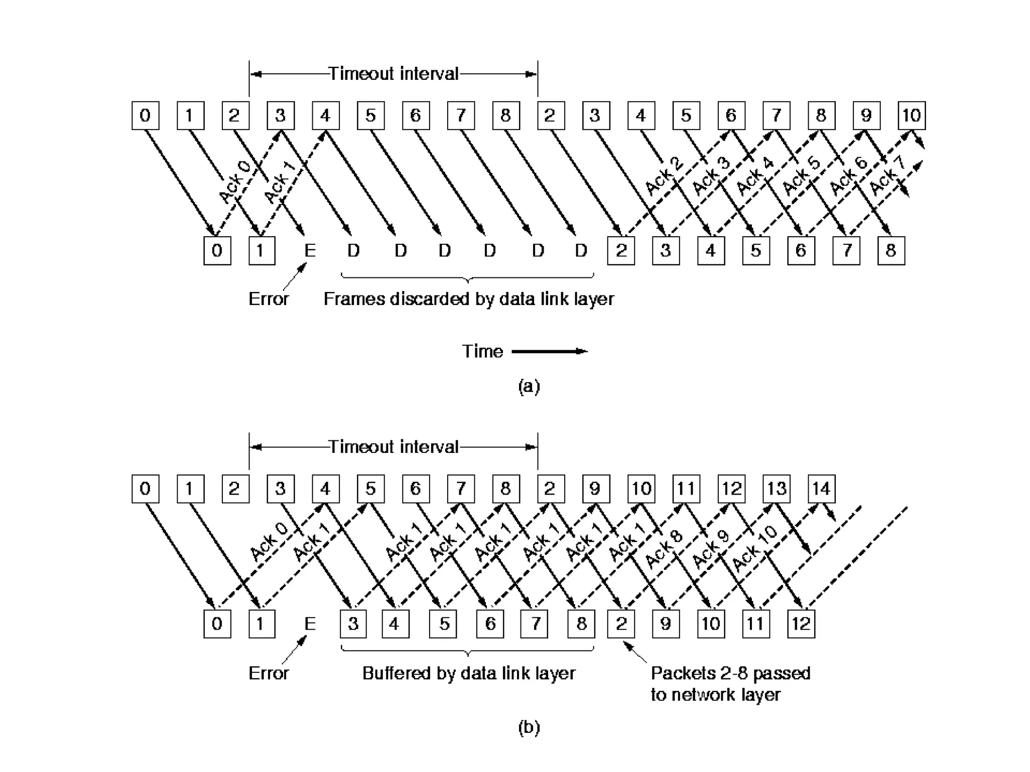 Go back n/selectiverepeat • Selective repeat : – Store all frames following the bad one. – When sender notices that something is wrong it only retransmits the bad frame. – This is like having a receiver window larger than 1 – Thus any frame within the window may be accepted and buffered until all the preceding ones have been passed to the network layer. – Could need large amounts of memory in DLL