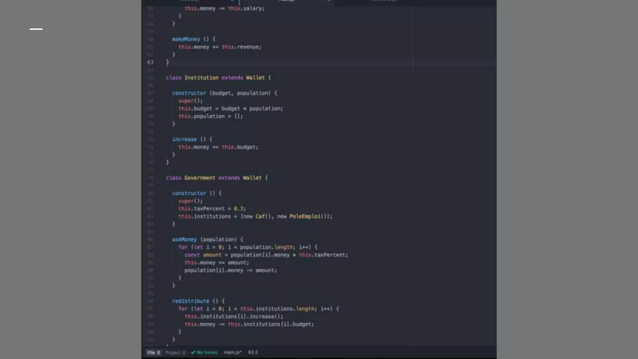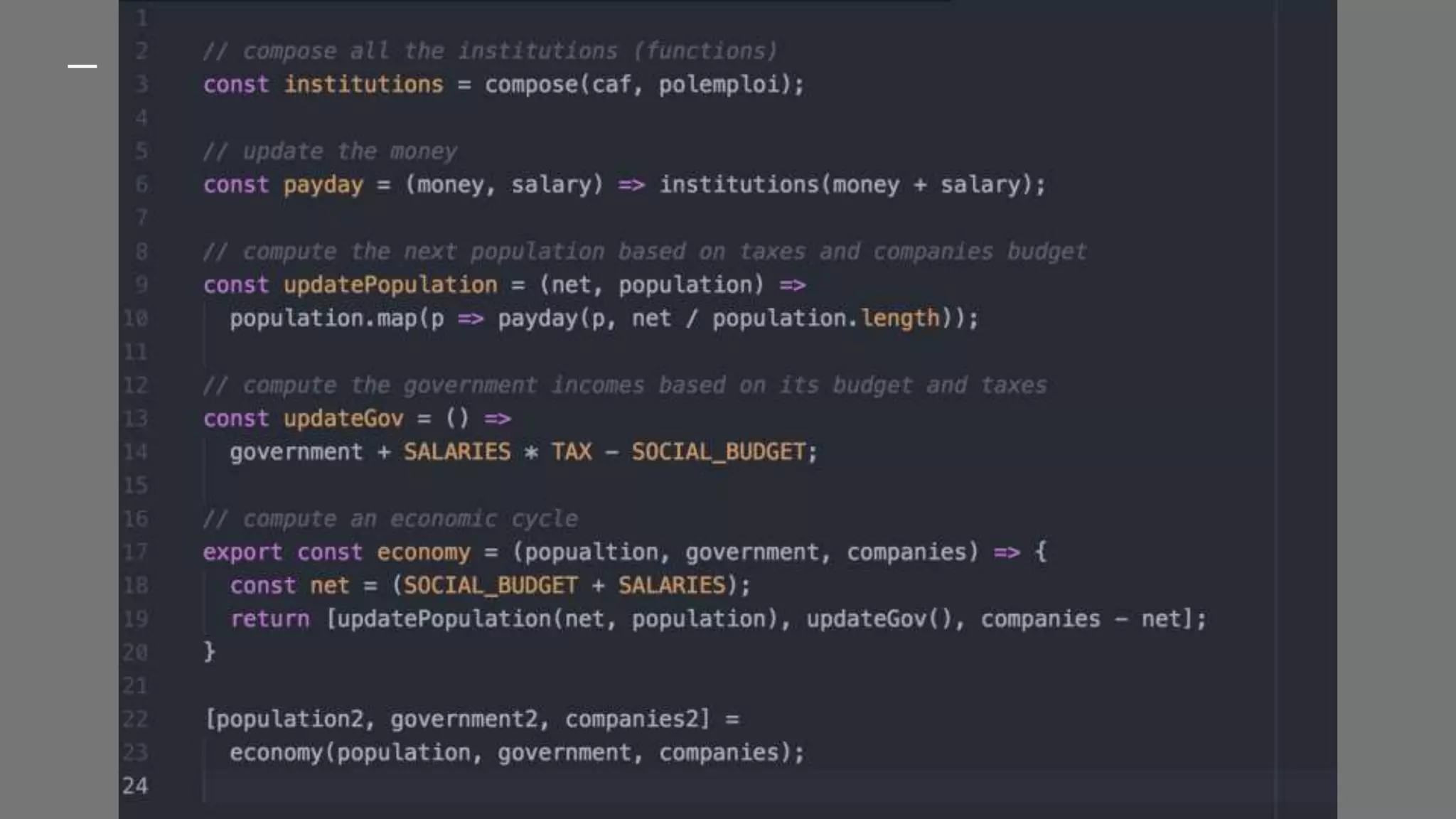 This document discusses modeling government institutions and distribution of funds functionally in code using ES6 features. It suggests modeling the relationships between companies, populations, and governments as pure functions that take in data and return new values, rather than using an object-oriented approach. Functional programming in ES6 allows defining functions as immutable data and using map, filter and reduce to transform data in a pure and testable way.