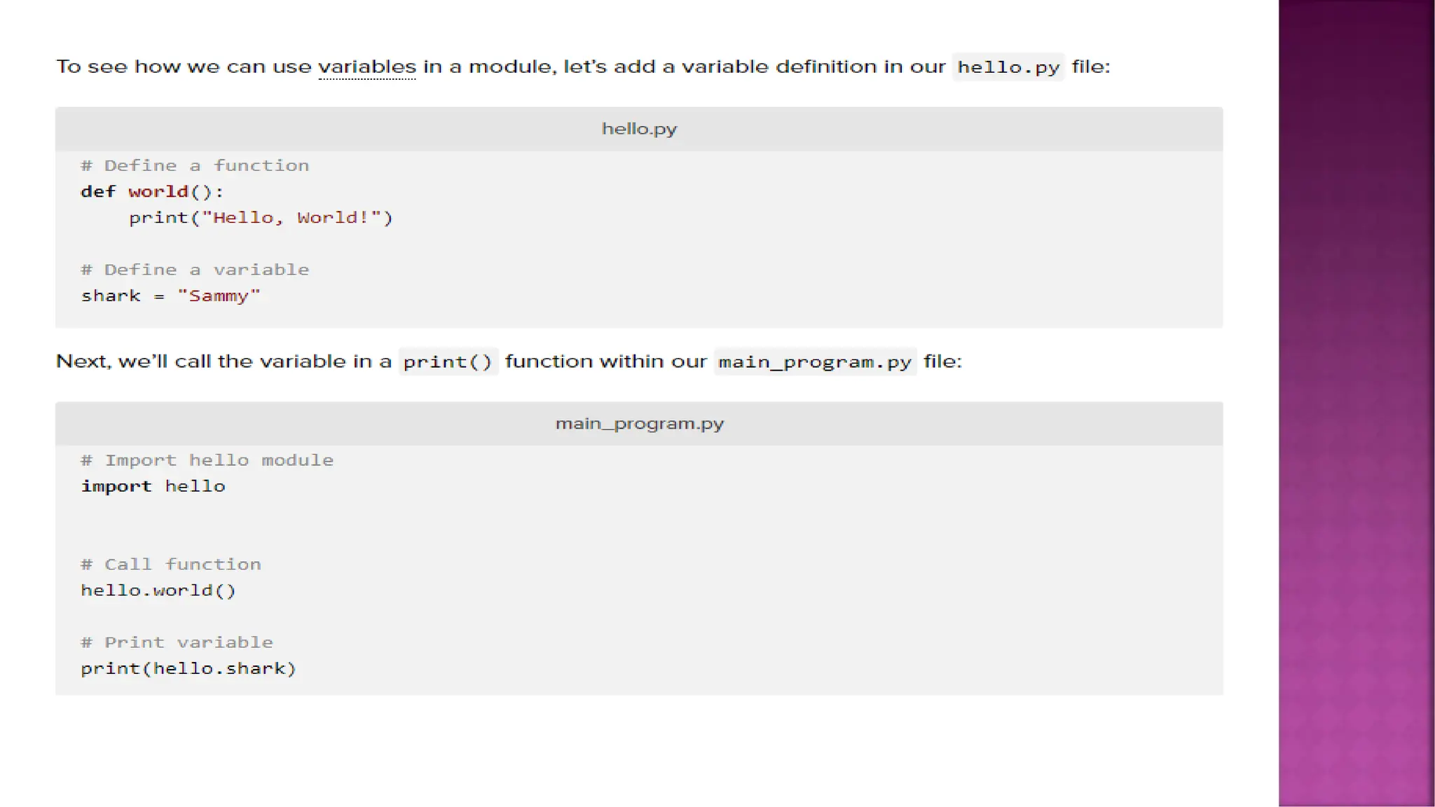 The document explains the concept of functions in Python, describing them as named sequences of statements that perform computations, and categorizing them into modules, built-in, and user-defined functions. It covers how to import modules, utilize dot notation to access specific functions, and create custom modules while emphasizing the importance of scopes and default arguments. Additionally, it provides examples for defining functions, managing variable scopes, and includes tasks for creating Python modules and functions.