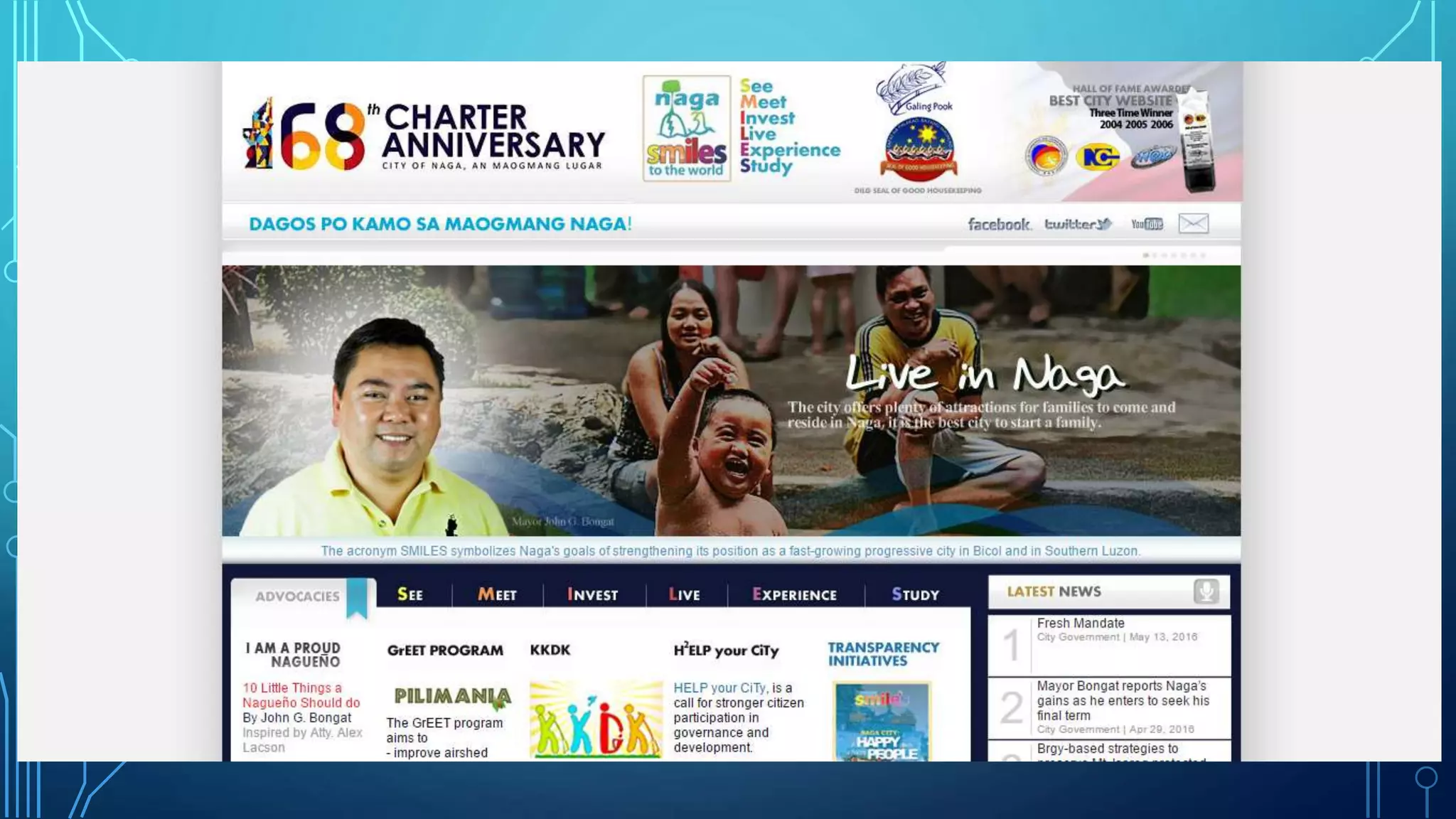 ASSIGNMENT • On aone whole sheet of paper, write an evaluation and description of a given website. • The website that you will evaluate will be: http://naga.gov.ph/ (The Official Website of City of Naga) • For your evaluation, you will evaluate and judge the overall components of the website with the following guide questions: • What are the best features and functionalities of the website? • Was the content being offered through the website, follows the proper web designing and planning? (Layout, Design, Structure and Overall Look) • What changes or additional features would you suggest for this website?