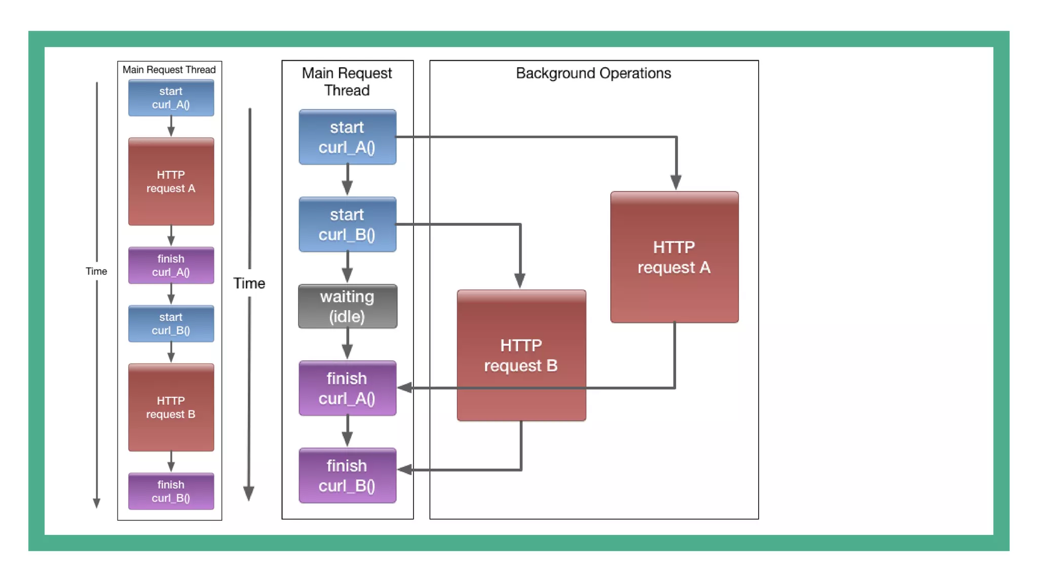 <?hh namespace HackUserDocumentationAsyncIntroExamplesCurl; async functioncurl_A(): Awaitable<string> { $x = await HHAsiocurl_exec("http://example.com/"); return $x; } async function curl_B(): Awaitable<string> { $y = await HHAsiocurl_exec("http://example.net/"); return $y; } async function async_curl(): Awaitable<void> { $start = microtime(true); list($a, $b) = await HHAsiov(array(curl_A(), curl_B())); $end = microtime(true); echo "Total time taken: " . strval($end - $start) . " seconds" . PHP_EOL; } HHAsiojoin(async_curl()); - 19.
