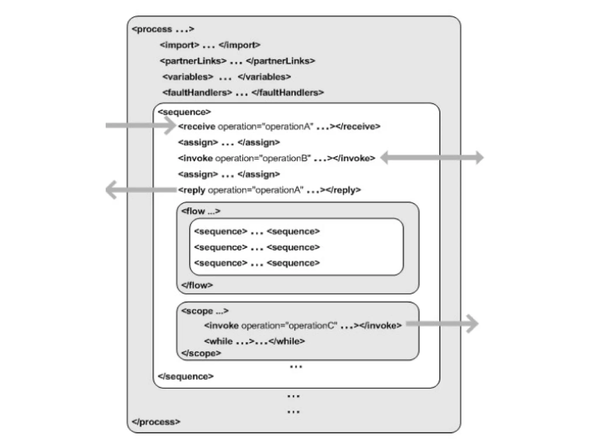 Structure of BPEL<process> <!– Definition and roles of process participants --> <partnerLinks> ... </partnerLinks> <!- Data/state used within the process --> <variables> ... </variables> <!- Properties that enable conversations --> <correlationSets> ... </correlationSets> <!- Exception handling --> <faultHandlers> ... </faultHandlers> <!- Error recovery – undoing actions --> <compensationHandlers> ... </compensationHandlers> <!- Concurrent events with process itself --> <eventHandlers> ... </eventHandlers> </process> Process Language