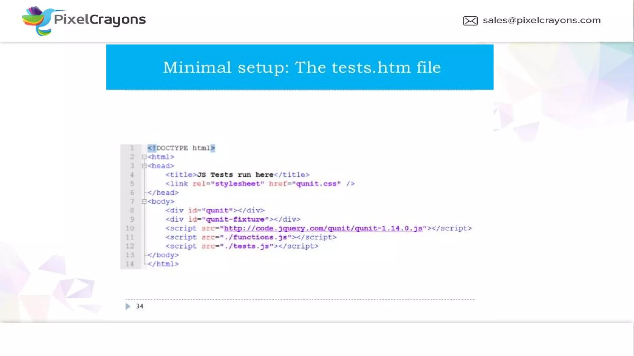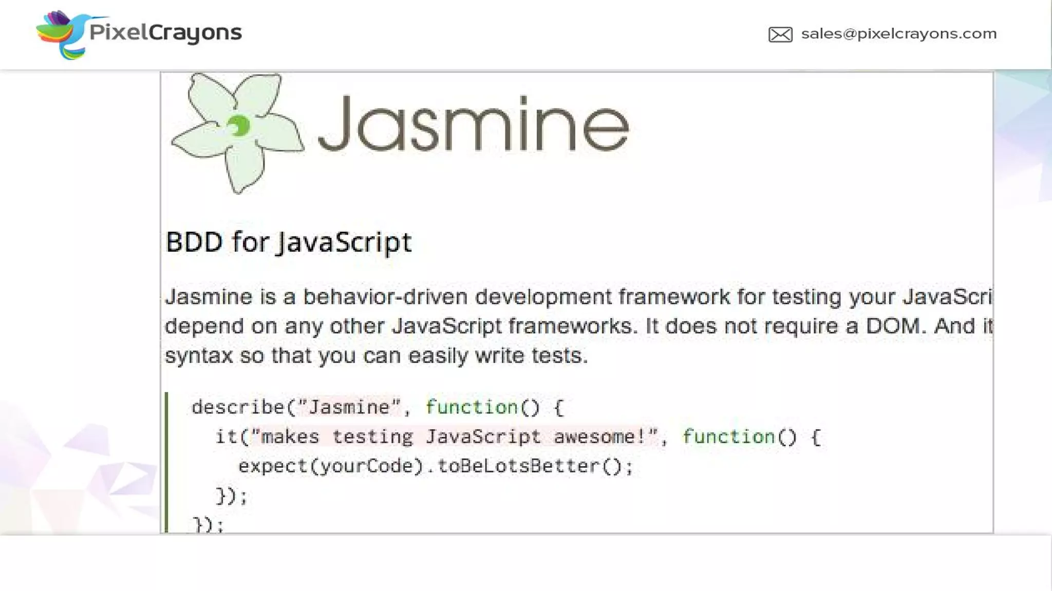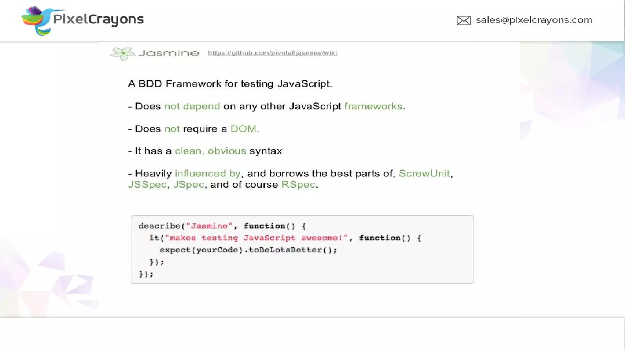 The document discusses various JavaScript testing tools, highlighting their features and benefits, such as Jasmine, Quinit, Mocha, Tape, and Karma. It emphasizes the advantages of using JavaScript for testing, including its free and open-source nature, as well as the supportive community. The document also briefly introduces PixelCrayons as a digital consulting and engineering firm providing solutions for various entities.