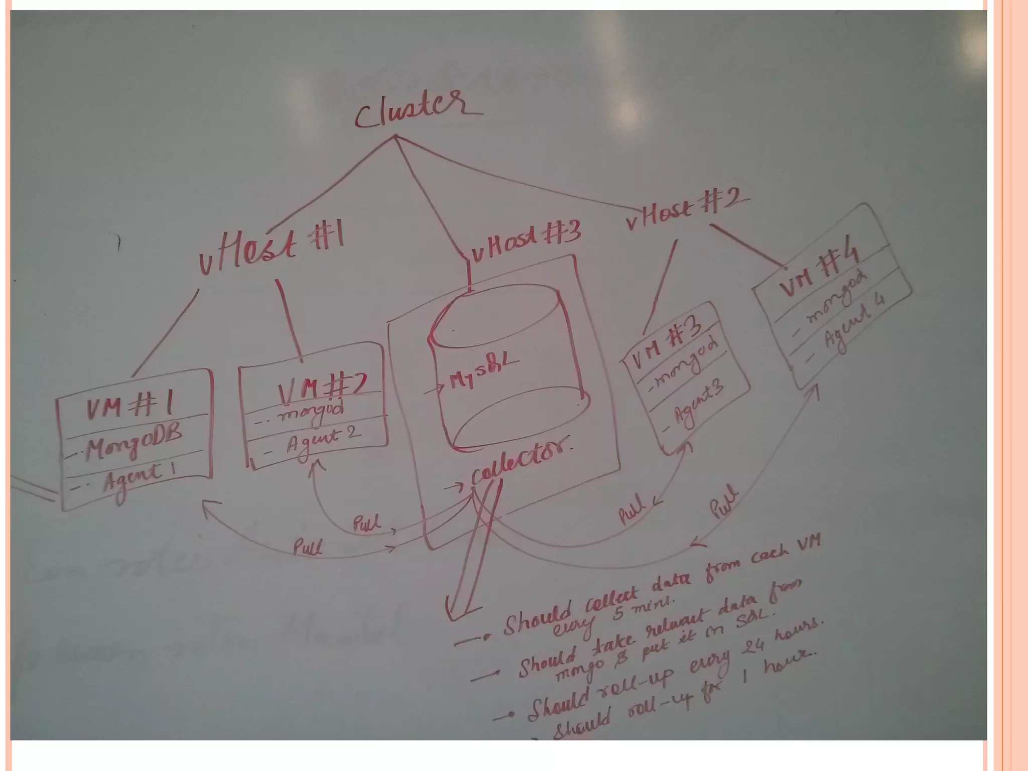 The document describes a project to develop a large-scale log collection framework for virtual machines. The framework includes agents that collect host and VM metrics, a collector that pulls data from local MongoDB stores and saves to a central MySQL database, and a visualization module using CanvasJS. The goals are to simulate DRS and DPM functionality through VM management, gather performance data, and build analysis tools.