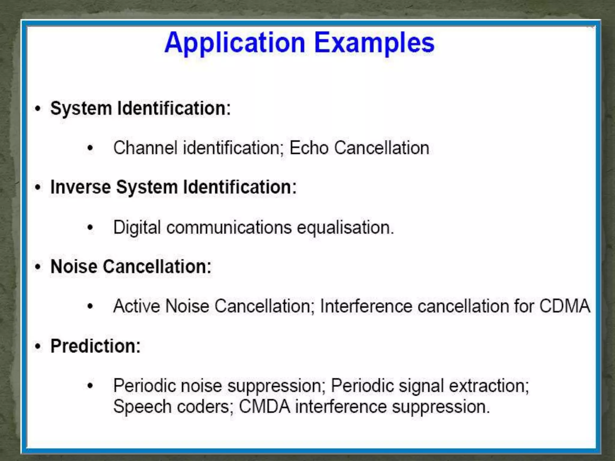 The document discusses the implementation and techniques involved in noise cancellation, focusing on the adaptive filter and the least mean square (LMS) algorithm. It explains the concept of noise, the principle behind noise cancellation, and the applications of these technologies in various fields. Additionally, it analyzes the advantages and operational aspects of the LMS algorithm, emphasizing its use in real-time adaptive filtering.