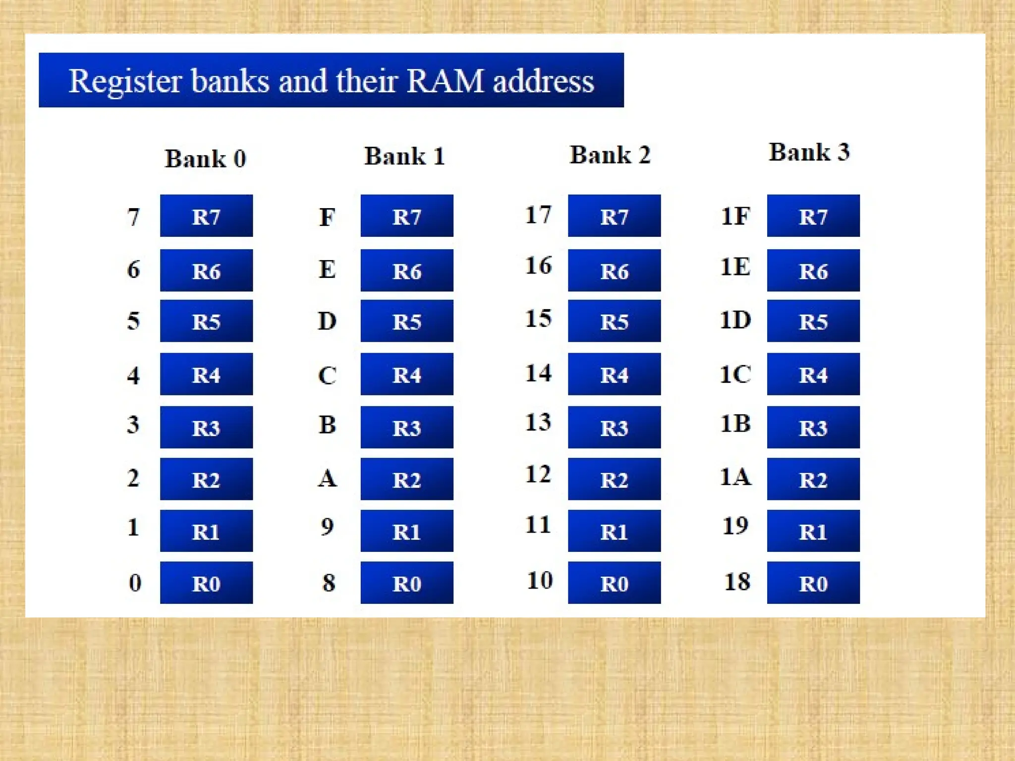 → Four RegisterBanks → There are four register banks, in each register bank there are eight 8 bit register available from R0 to R7 → By default Bank 0 is selected. For selecting banks we use RS0 and RS1 bit of PSW. → R0 to R7 registers are byte addressable means. If we want to set the bit 3 of R0 then we can’t use SETB R0.3 We use MOV R0, #08H; For changing single bit we can modify all the other bits of R0. → Locations 20H to 2FH is bit addressable RAM means each bit from 00H to FFH in this we can set or reset CF rather than changing whole byte. → Locations 30H to 7FH is used as scratch pad means we can use this space for data reading and writing or for data storage.