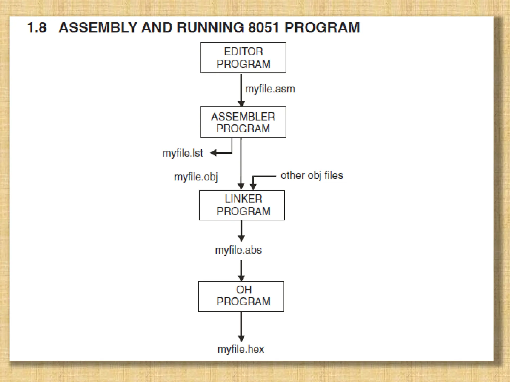 Steps: • Type yourprogram in editor of software widely used editors are notepad. • Save this file with file name . asm } depending on assembler or file name . src notepad produce ASCII file. • “ASM” source file contains program code assembler converts the instruction into machine code and produces “obj” file and “lst file” (object file and list file). → Linker program takes one or more object files and produces an absolute object file with extension “abs”. → “abs” file is used by 8051 trainer that have a monitor program. → “abs” file is fed into a program code called “OH” (object to Hex converter). Which create a file with extension “Hex” that is ready to burn into ROM → lst file contains all opcode and address as well as error that assembler detected.