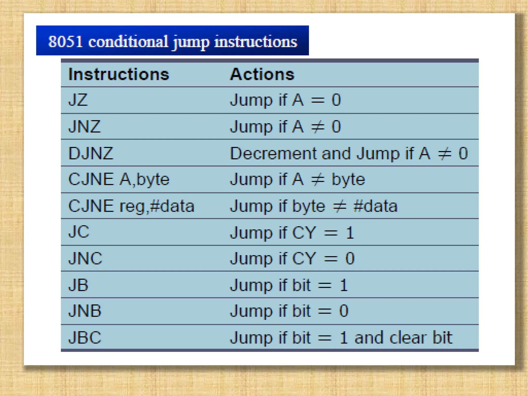 Jump onlyif a certain condition is met JNC label ;jump if no carry, CY=0 If CY = 0, the CPU starts to fetch and execute instruction from the address of the label If CY = 1, it will not jump but will execute the next instruction below JNC