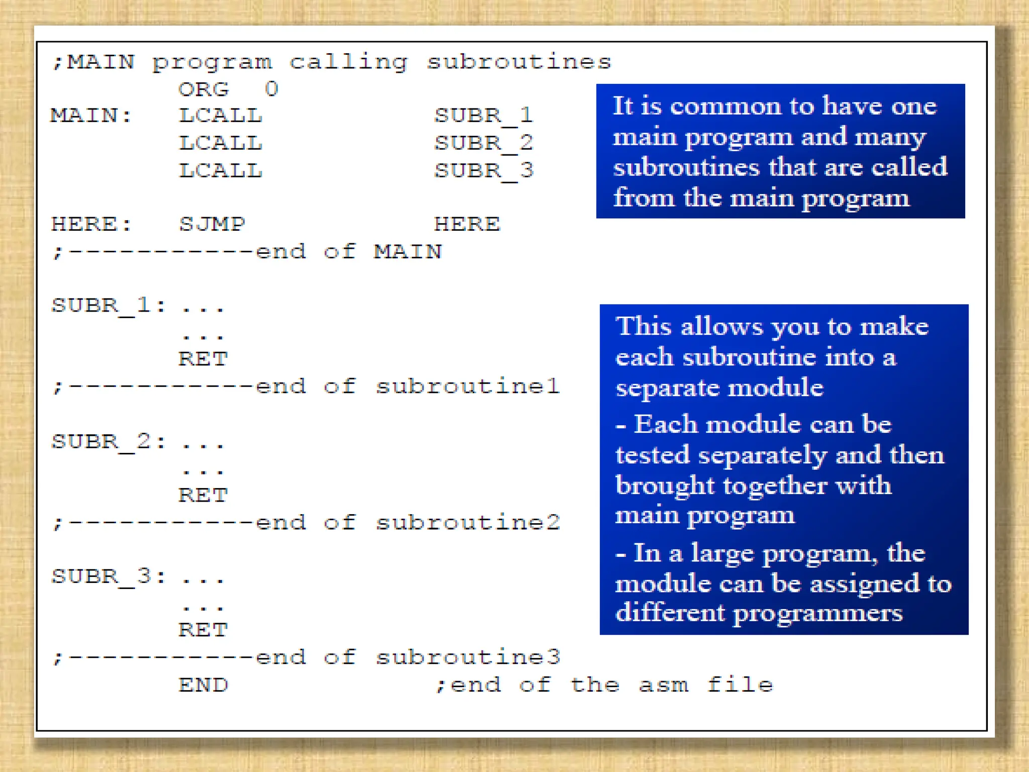 When asubroutine is called, control is transferred to that subroutine, the processor Saves on the stack the the address of the instruction immediately below the LCALL Begins to fetch instructions form the new location After finishing execution of the subroutine The instruction RET transfers control back to the caller Every subroutine needs RET as the last instruction