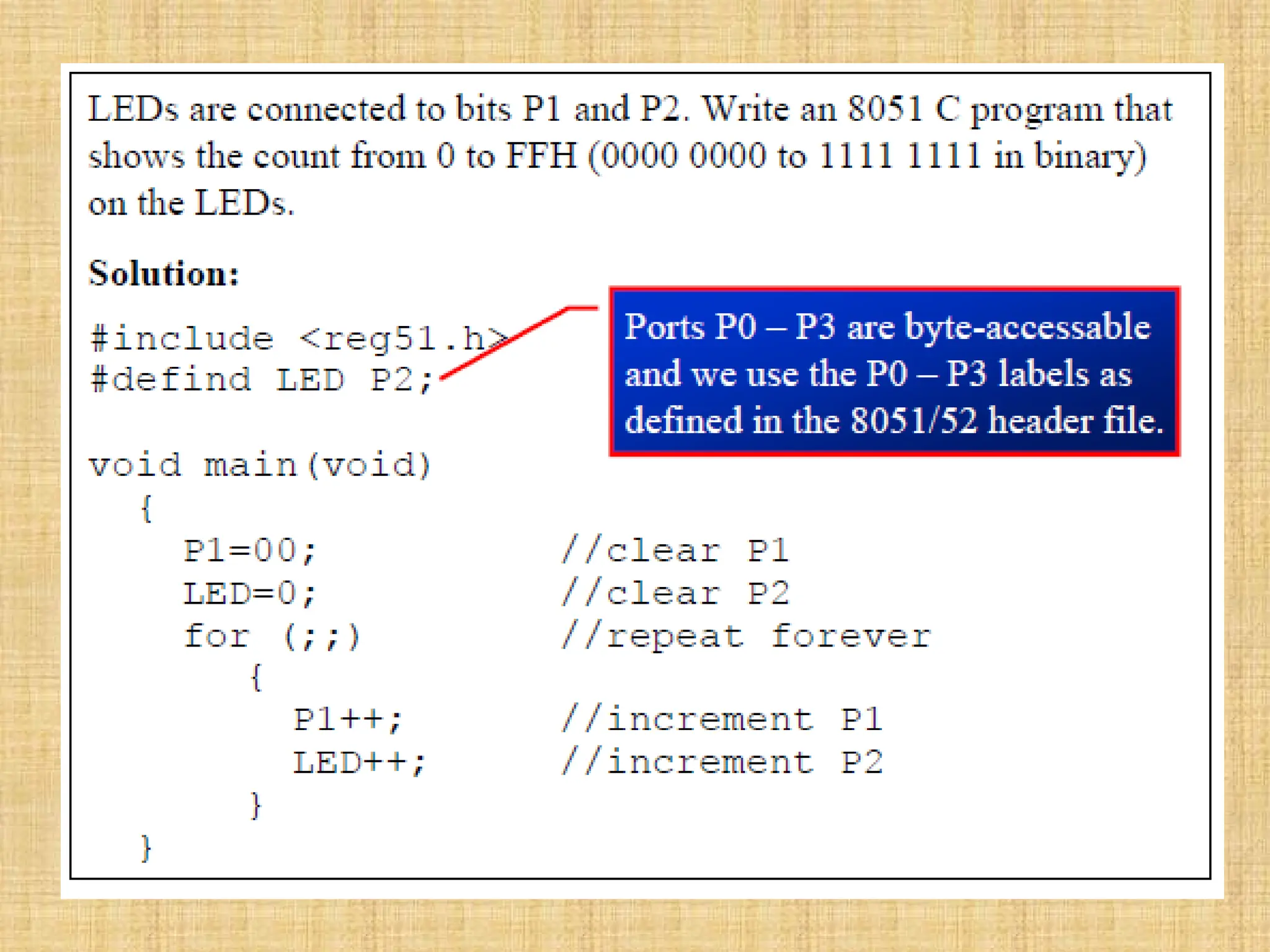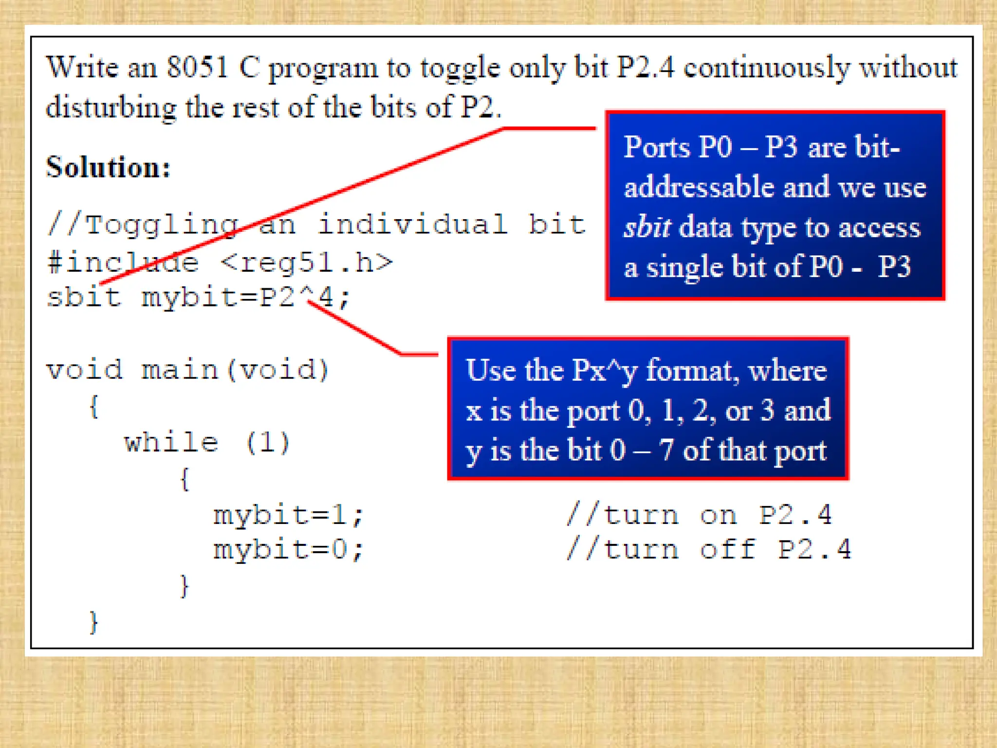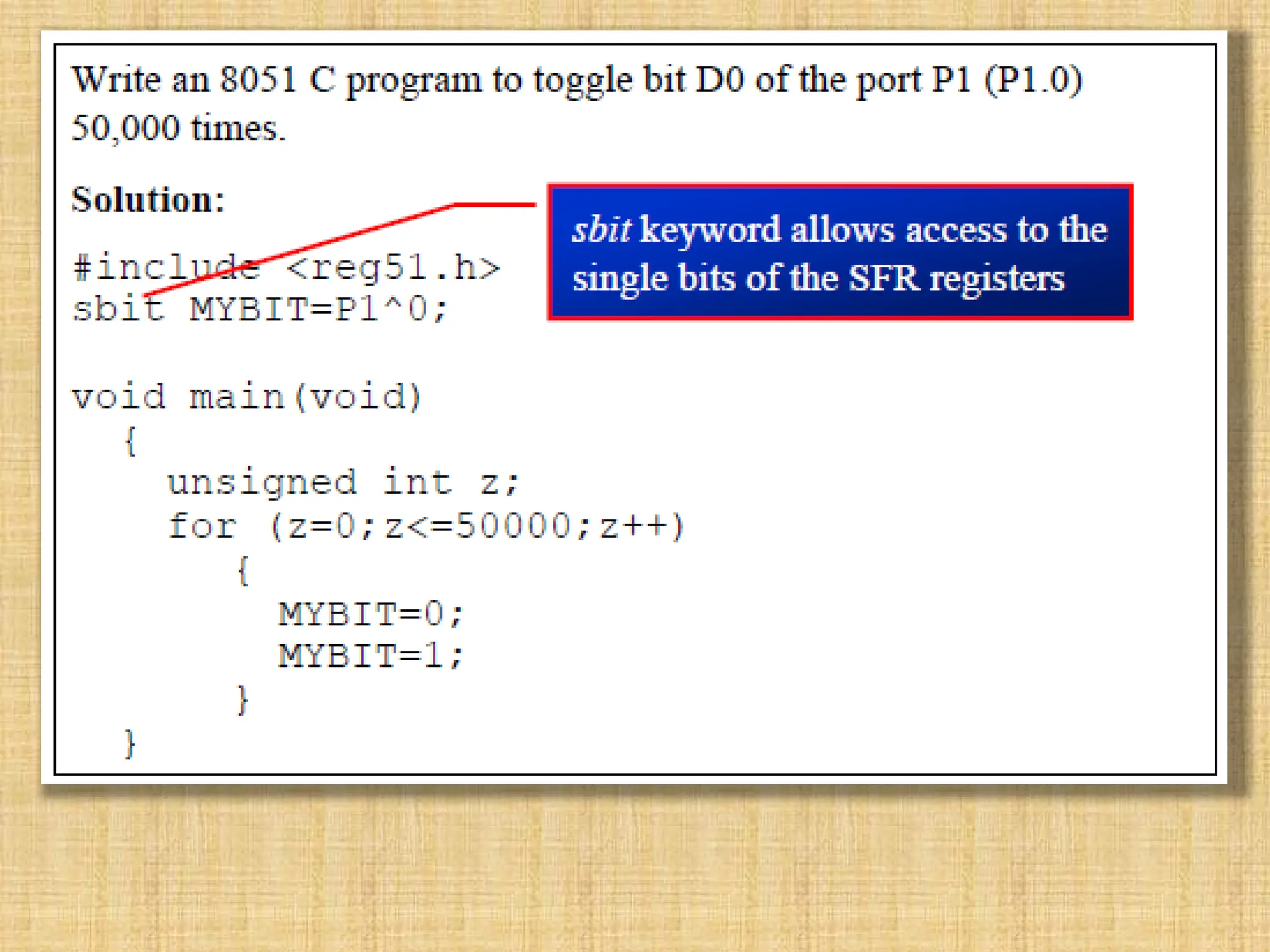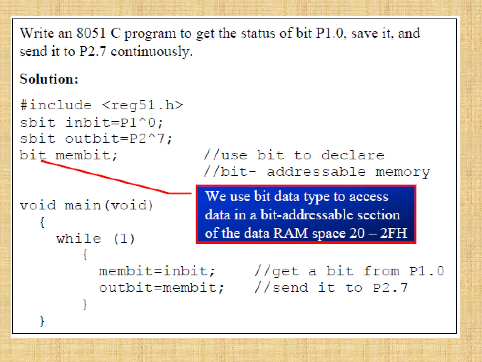 WHY PROGRAM 8051IN C Compilers produce hex files that is downloaded to ROM of microcontroller The size of hex file is the main concern Microcontrollers have limited on-chip ROM Code space for 8051 is limited to 64K bytes C programming is less time consuming, but has larger hex file size The reasons for writing programs in C It is easier and less time consuming to write in C than Assembly C is easier to modify and update You can use code available in function libraries C code is portable to other microcontroller with little of no modification DATA TYPES A good understanding of C data types for 8051 can help programmers to create smaller hex files Unsigned char Signed char Unsigned int Signed int Sbit (single bit) Bit and sfr