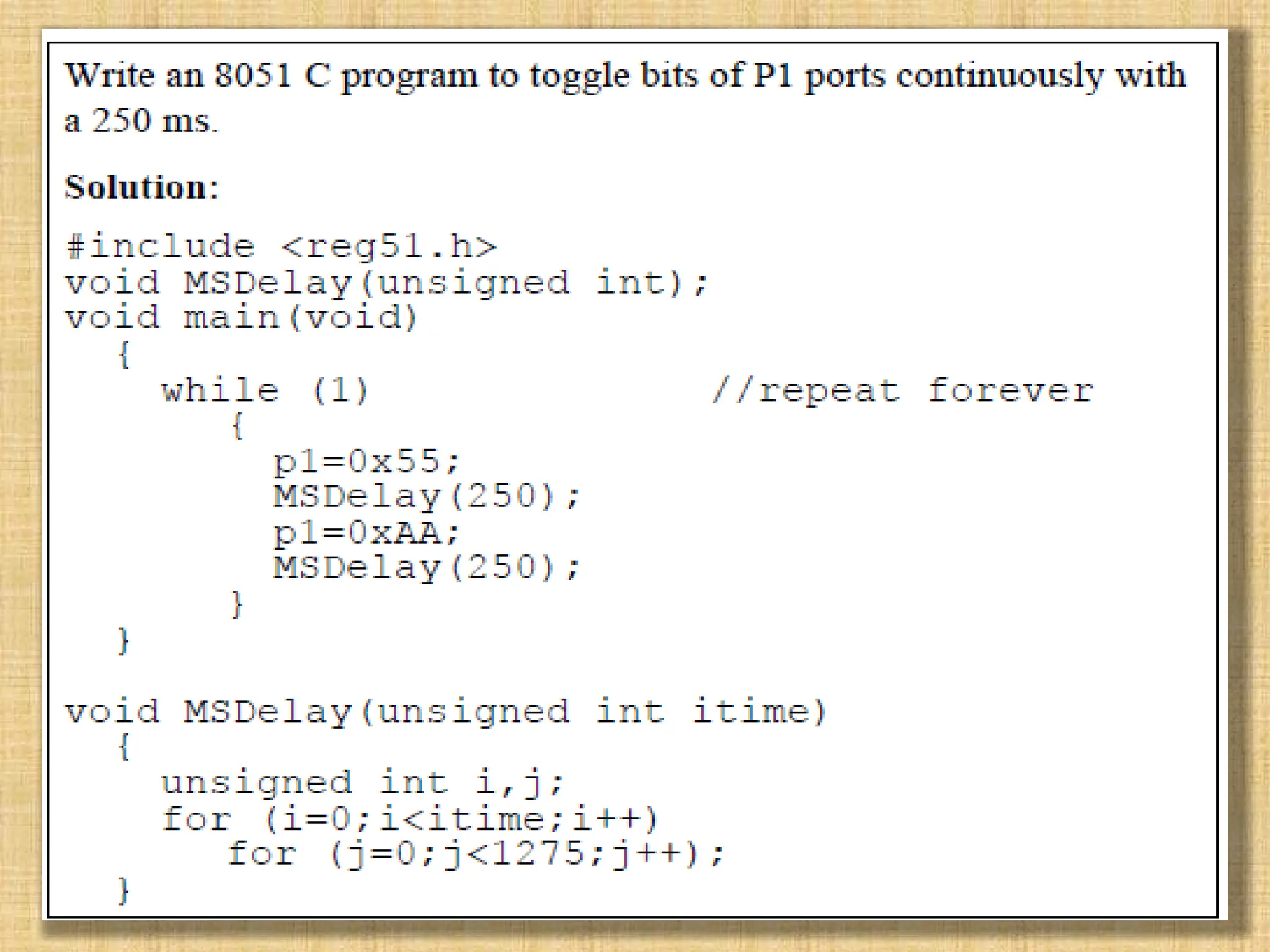 There aretwo ways to create a time delay in 8051 C Using the 8051 timer Using a simple for loop be mindful of three factors that can affect the accuracy of the delay The 8051 design – The number of machine cycle – The number of clock periods per machine cycle The crystal frequency connected to the X1 – X2 input pins Compiler choice – C compiler converts the C statements and functions to Assembly language instructions – Different compilers produce different code