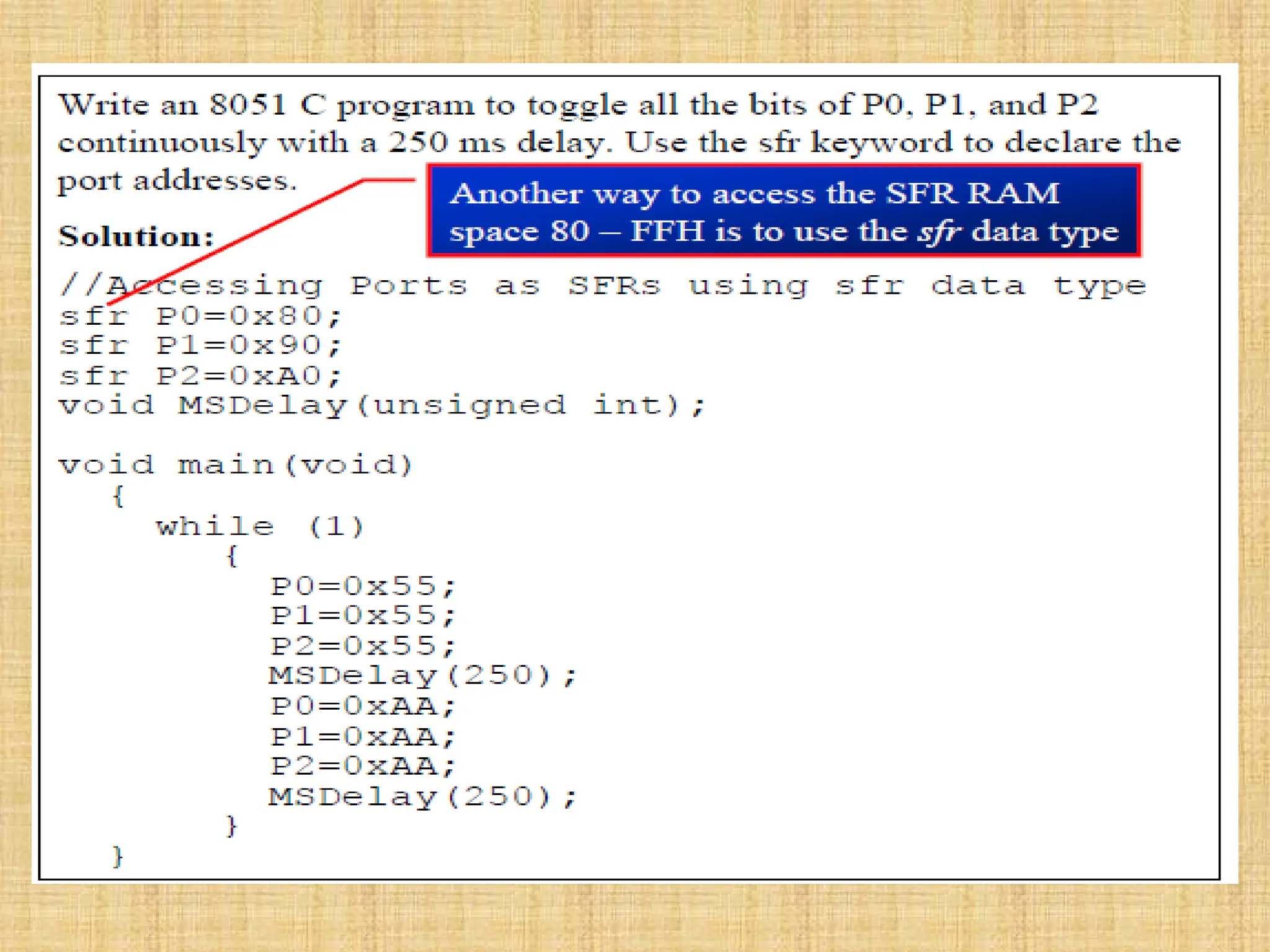 Byte Addressable SFRwith byte address SP – Stack printer – 81H DPTR – Data pointer 2 bytes DPL – Low byte – 82H DPH – High byte – 83H TMOD – Timer mode control – 89H TH0 – Timer 0 Higher order bytes – 8CH TL0 – Timer 0 Low order bytes – 8AH TH1 – Timer 1 High bytes = 80H TL1 – Timer 1 Low order byte = 86H SBUF – Serial data buffer = 99H PCON – Power control – 87H.
