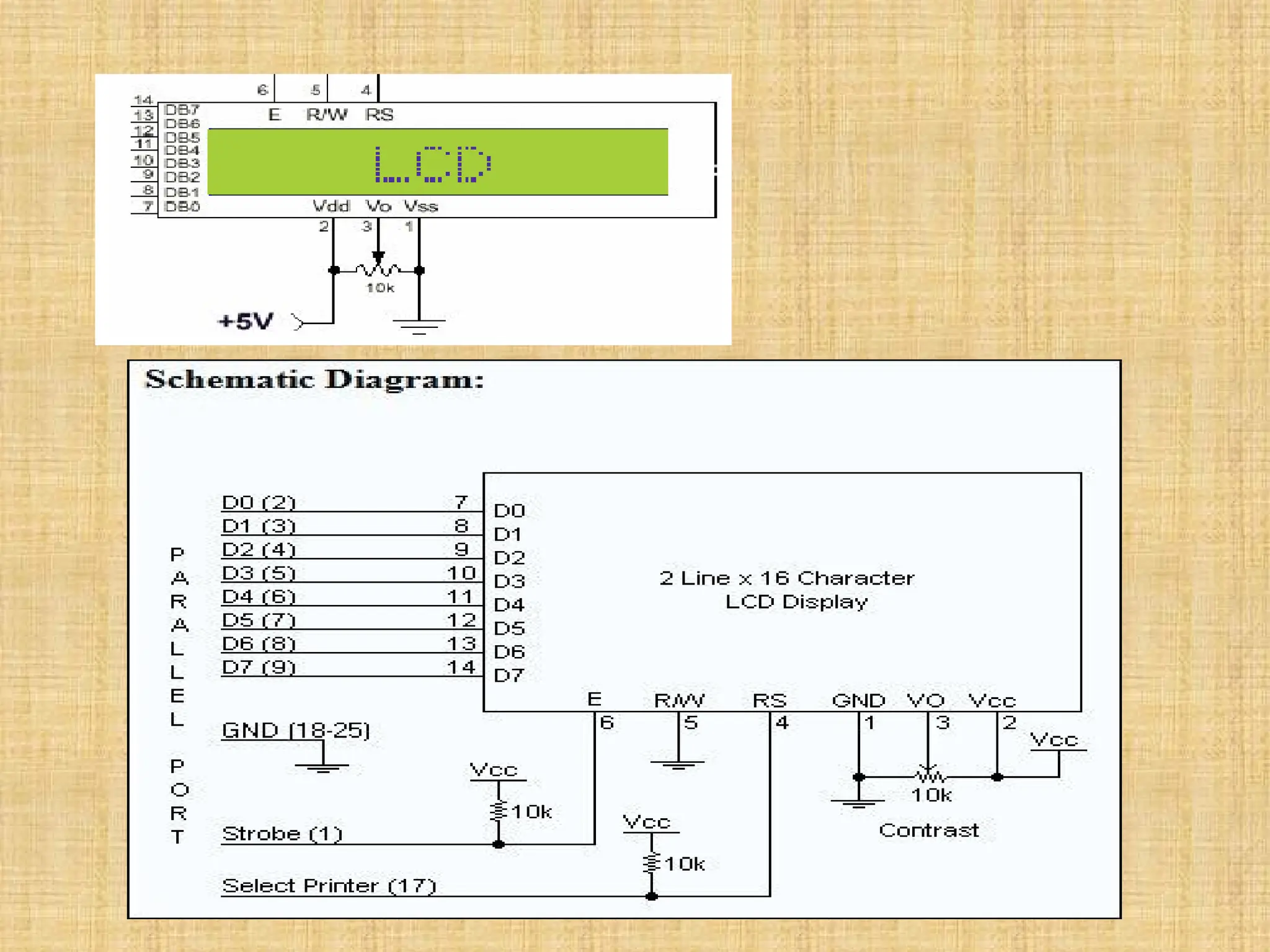 Above is thequite simple schematic. The LCD panel's Enable and Register Select is connected to the Control Port. The Control Port is an open collector / open drain output. While most Parallel Ports have internal pull-up resistors, there are a few which don't. Therefore by incorporating the two 10K external pull up resistors, the circuit is more portable for a wider range of computers, some of which may have no internal pull up resistors. We make no effort to place the Data bus into reverse direction. Therefore we hard wire the R/W line of the LCD panel, into write mode. This will cause no bus conflicts on the data lines. As a result we cannot read back the LCD's internal Busy Flag which tells us if the LCD has accepted and finished processing the last instruction. This problem is overcome by inserting known delays into our program. The 10k Potentiometer controls the contrast of the LCD panel. Nothing fancy here. As with all the examples, I've left the power supply out. You can use a bench power supply set to 5v or use a onboard +5 regulator. Remember a few de-coupling capacitors, especially if you have trouble with the circuit working properly.