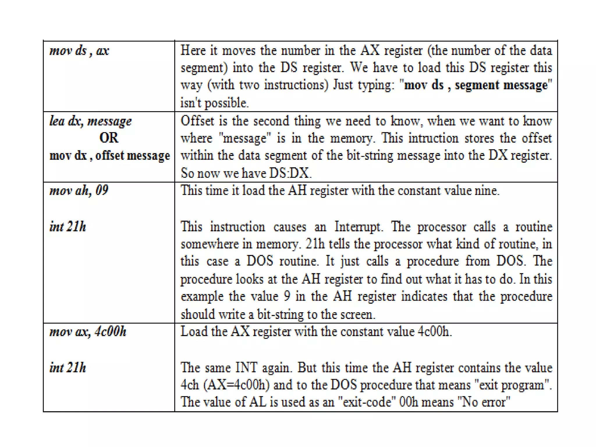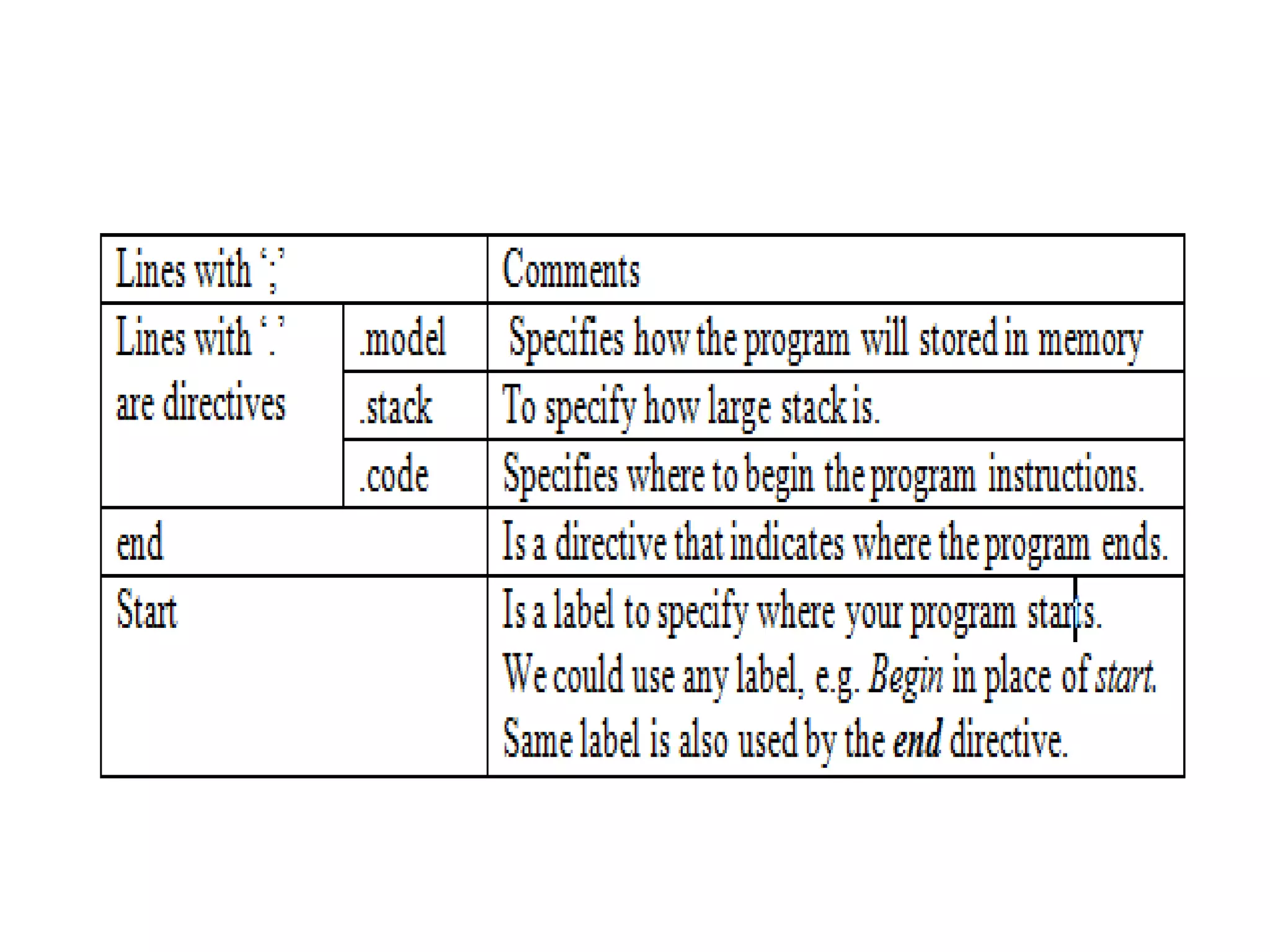 This document provides an overview of assembly language programming concepts for the 8086 processor. It discusses variables which are stored in registers, assignment using MOV instructions, input/output using INT 21h to call operating system functions and pass parameters in registers, and complete program examples that demonstrate displaying characters, reading input, and terminating programs. It also provides sample programs and exercises for students to practice core concepts like loops, conditional jumps, arithmetic operations on numbers in various formats.