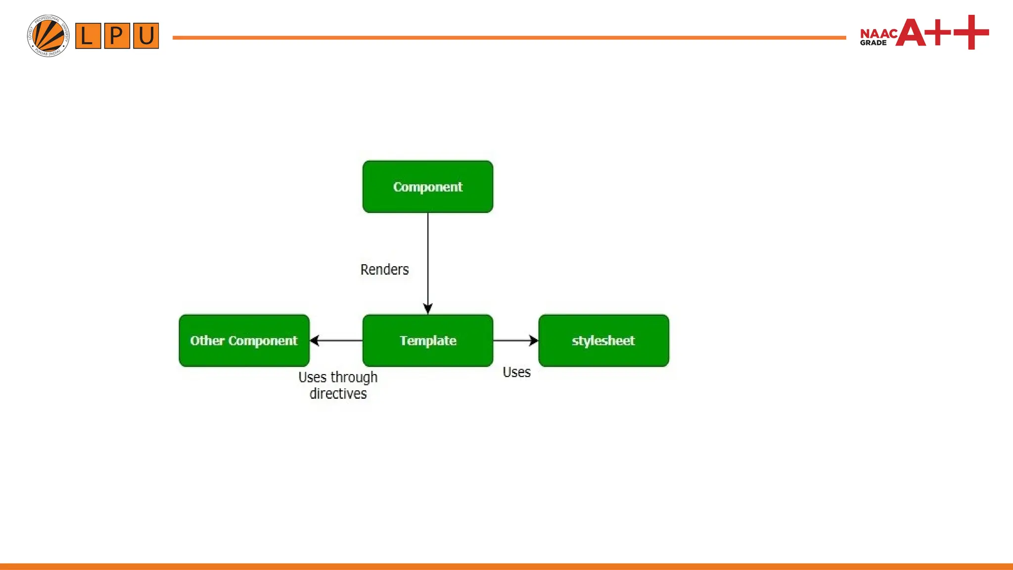 Component The core ofthe Angular framework architecture is Angular Component. Angular Component is the building block of every Angular application. Every angular application is made up of one more Angular Component. It is basically a plain JavaScript/Typescript class along with a HTML template and an associated name. The HTML template can access the data from its corresponding JavaScript/Typescript class. Component's HTML template may include other component using its selectors value (name). The Angular Component may have an optional CSS Styles associated it and the HTML template may access the CSS Styles as well.