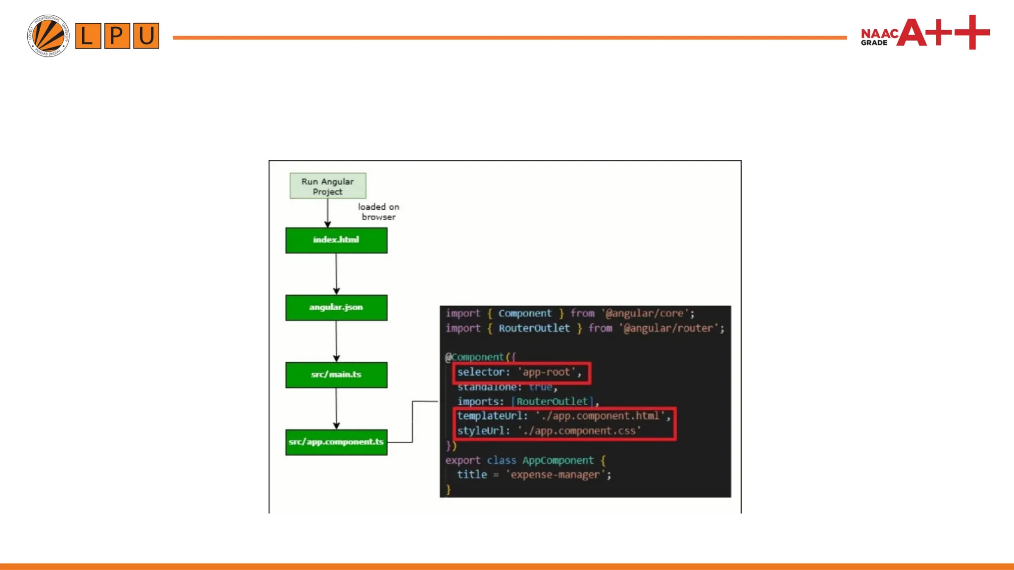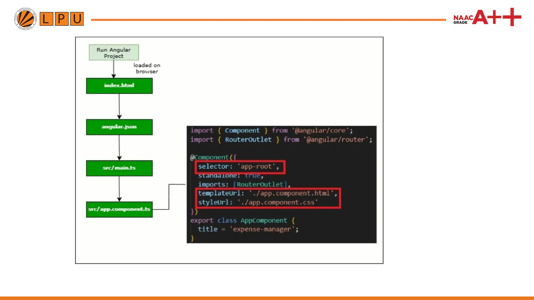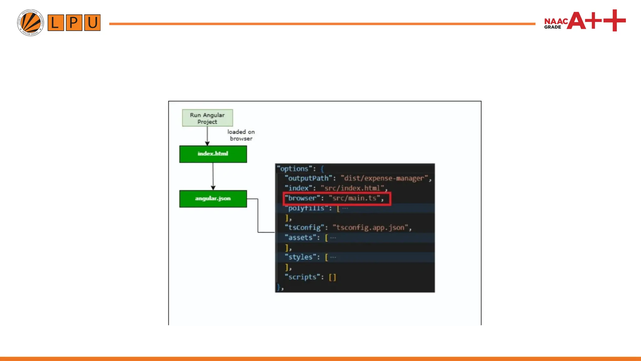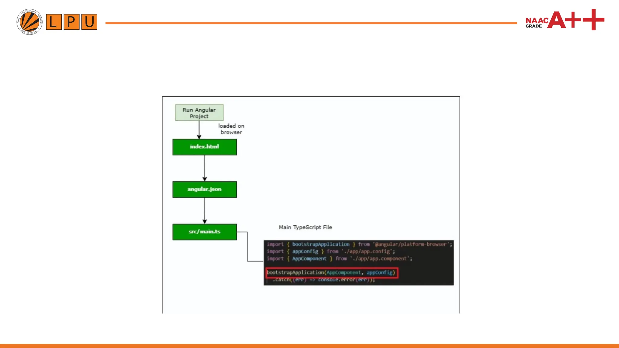 When we runan Angular application, index.html is the first file that is loaded on the browser. Then, browser looks for the main TypeScript file, i.e. src/main.ts which is the entry point of Angular application. Now, this file bootstraps the AppComponent (src/app.component.ts), the root component of every Angular application.