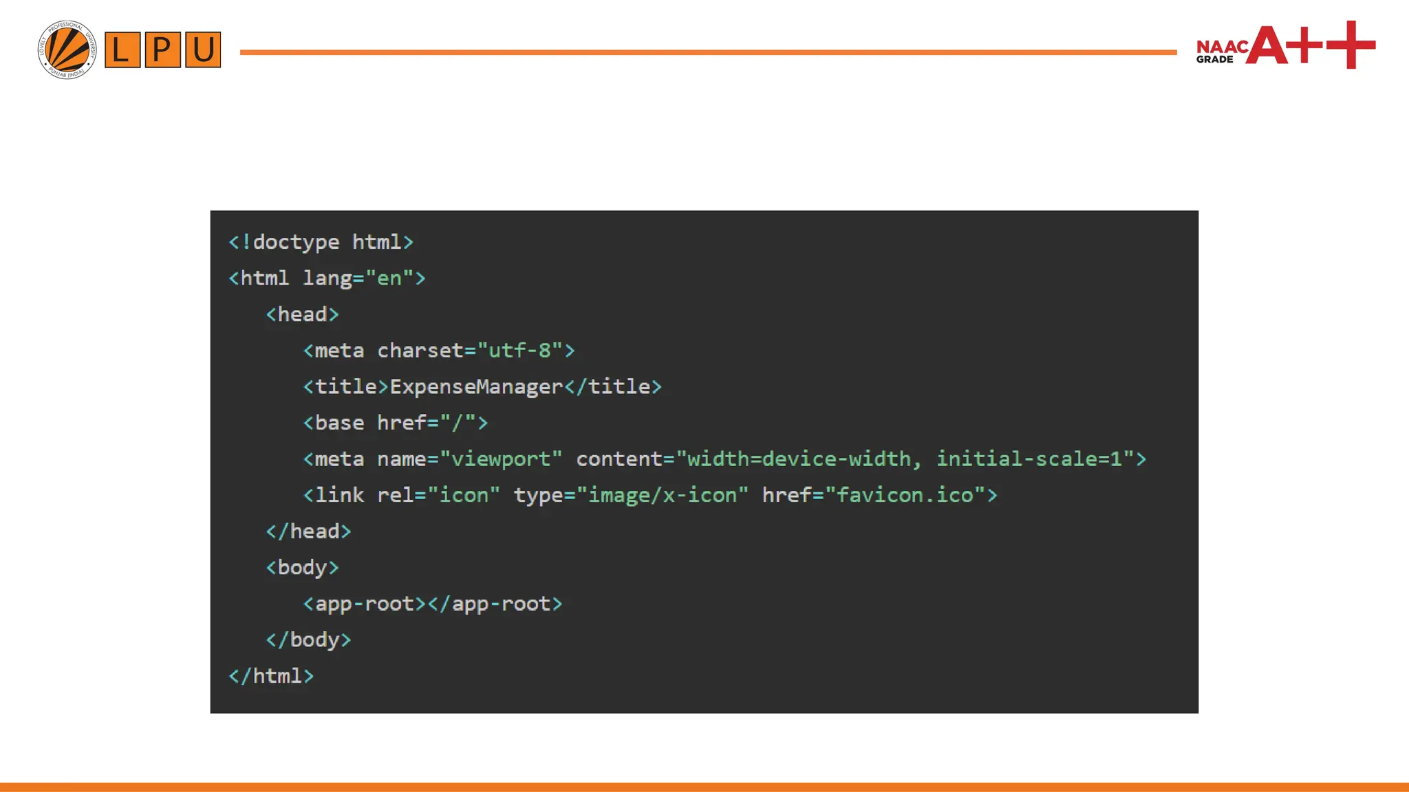 To show theview of this component, the app-root selector is used by root document, i.e. src/index.html of the Angular application as shown below −