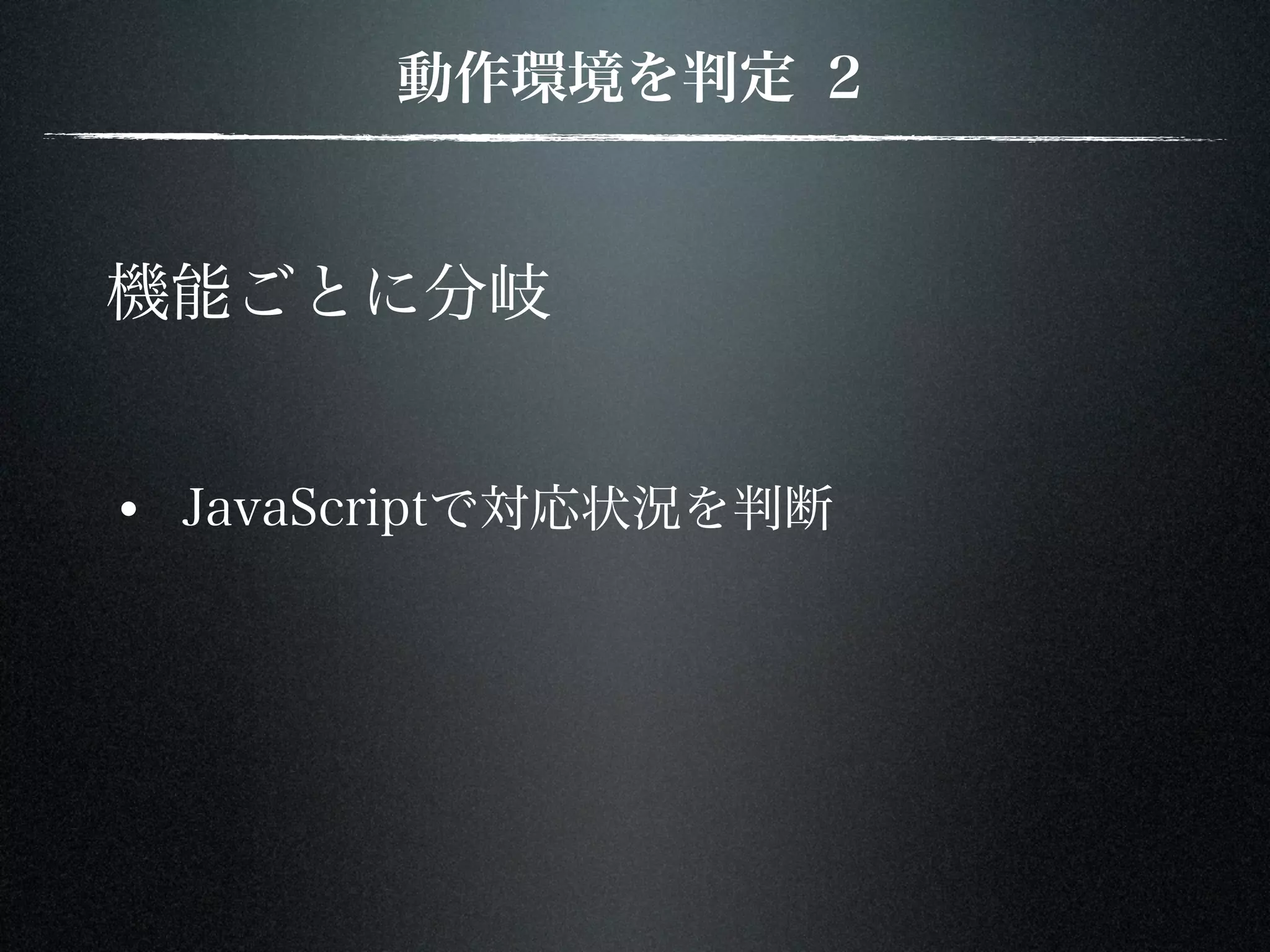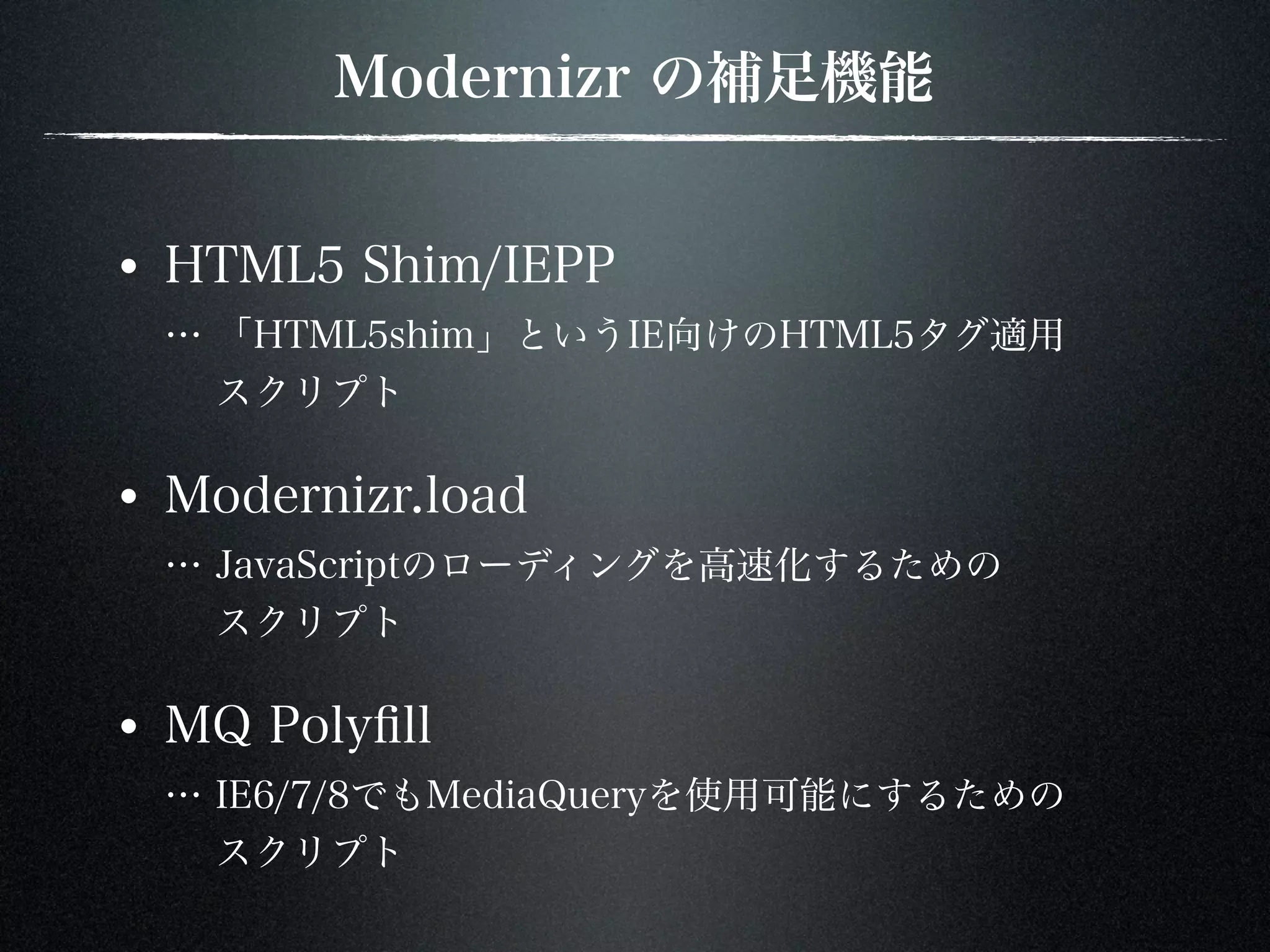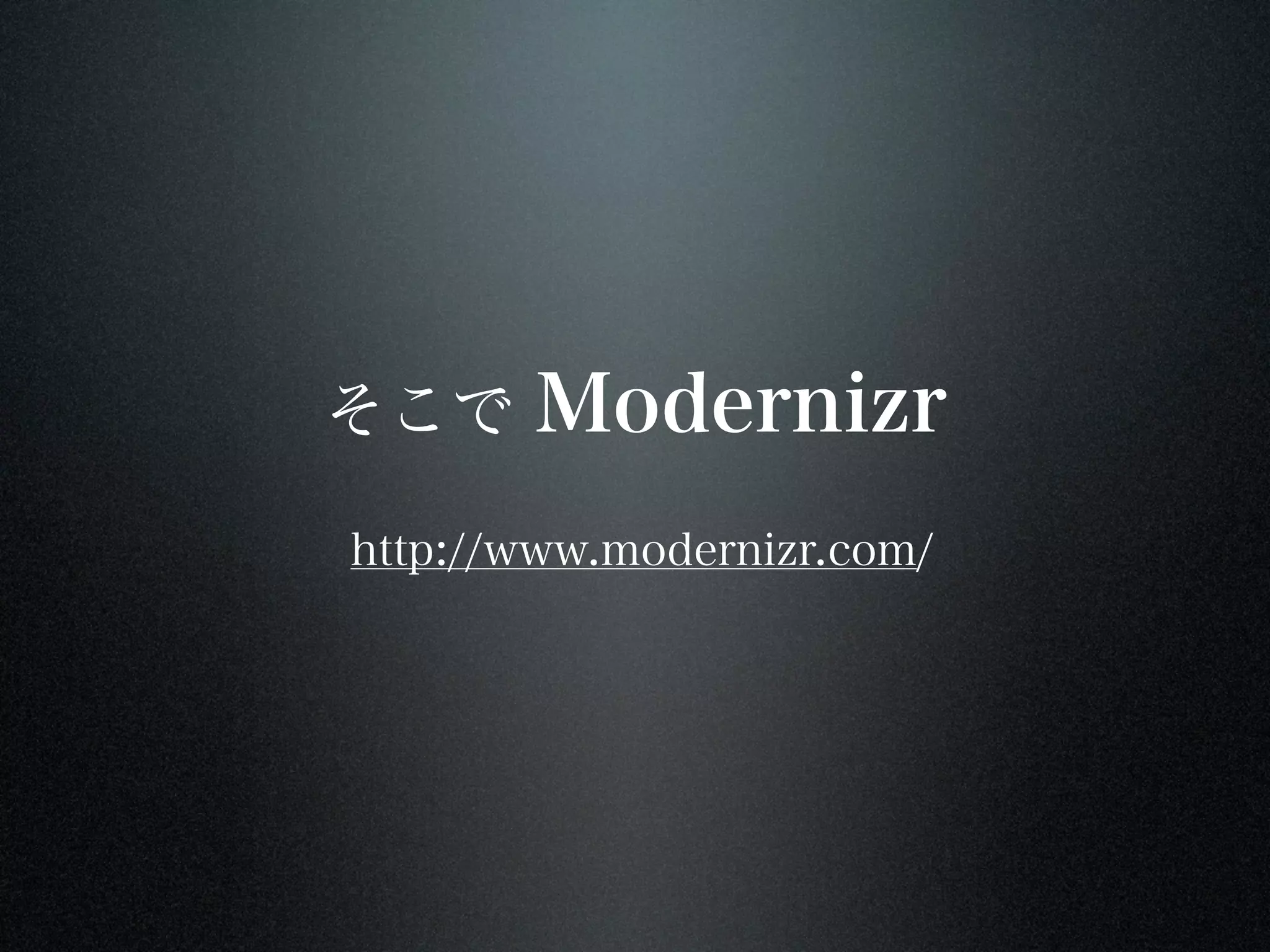<!DOCTYPE html> <html lang="ja"> ! <head> ! ! <meta charset="UTF-8" /> ! ! <script src="prettyprint.js"></script> ! ! <script src="modernizr.js"></script> ! </head> ! <body> ! ! <div id="debug"></div> ! ! <script> ! ! ! var info = prettyPrint(Modernizr); ! ! ! document.getElementById("debug").appendChild(info); ! ! </script> ! </body> </html> - 21.