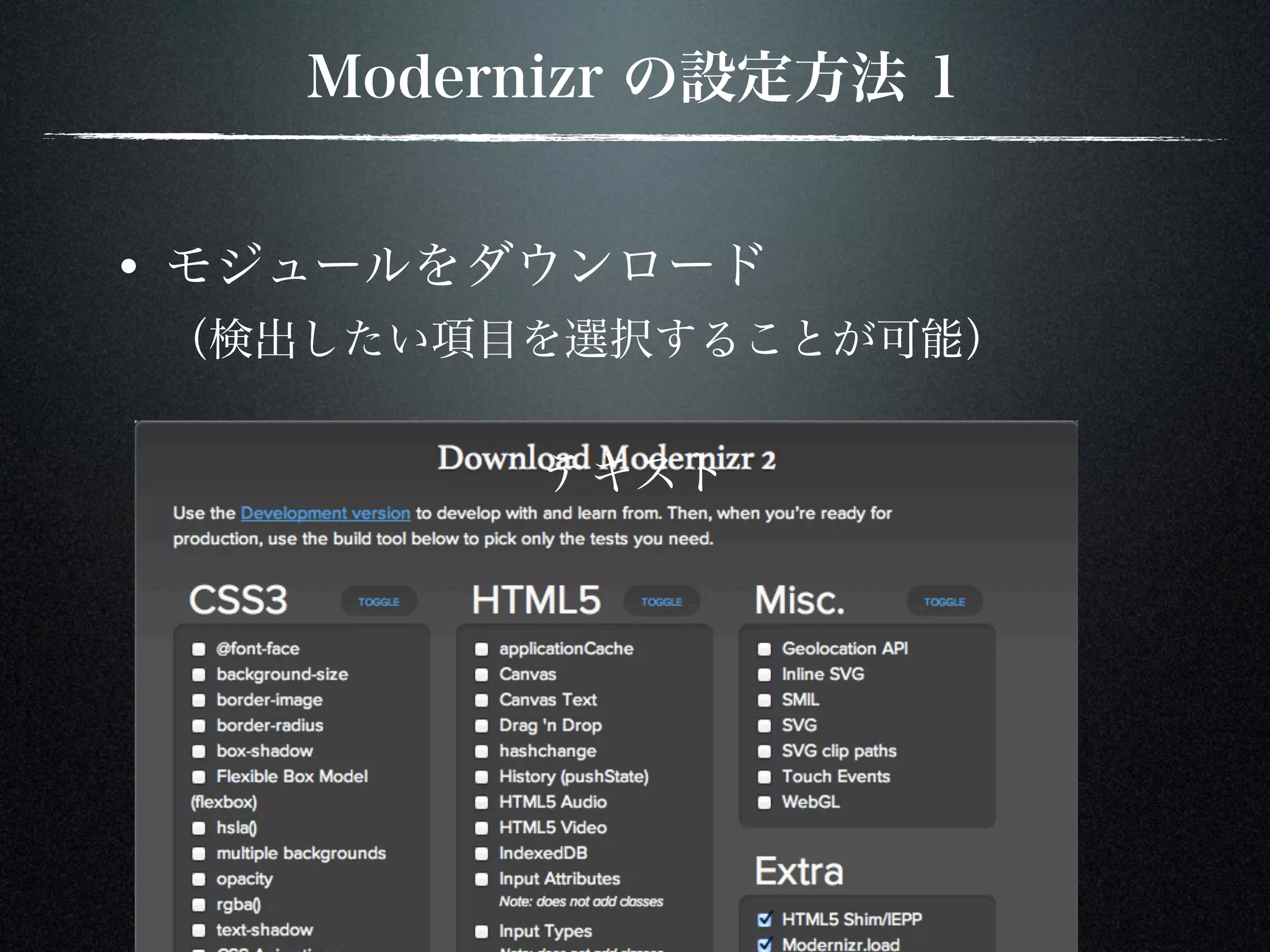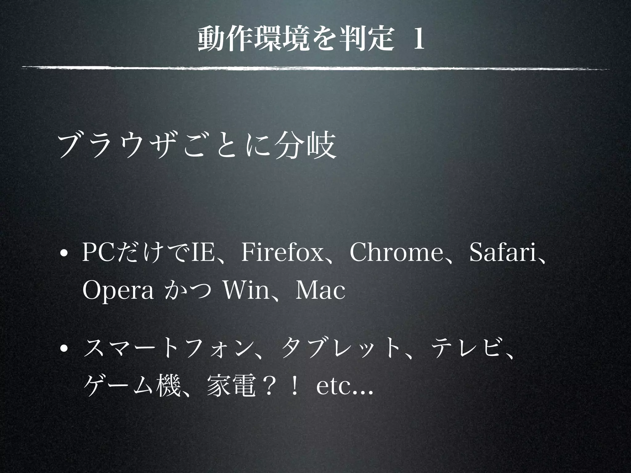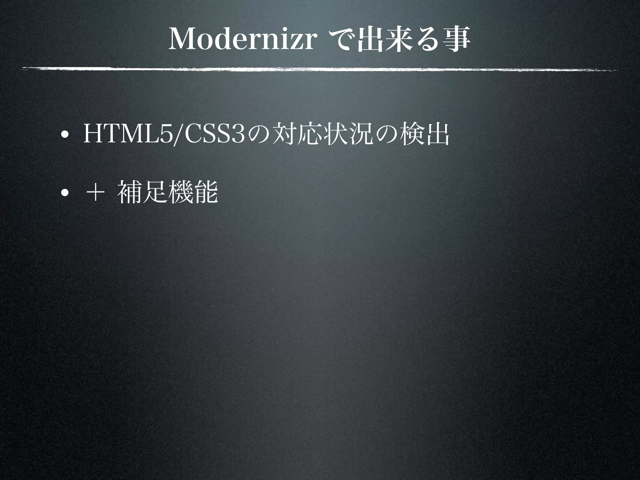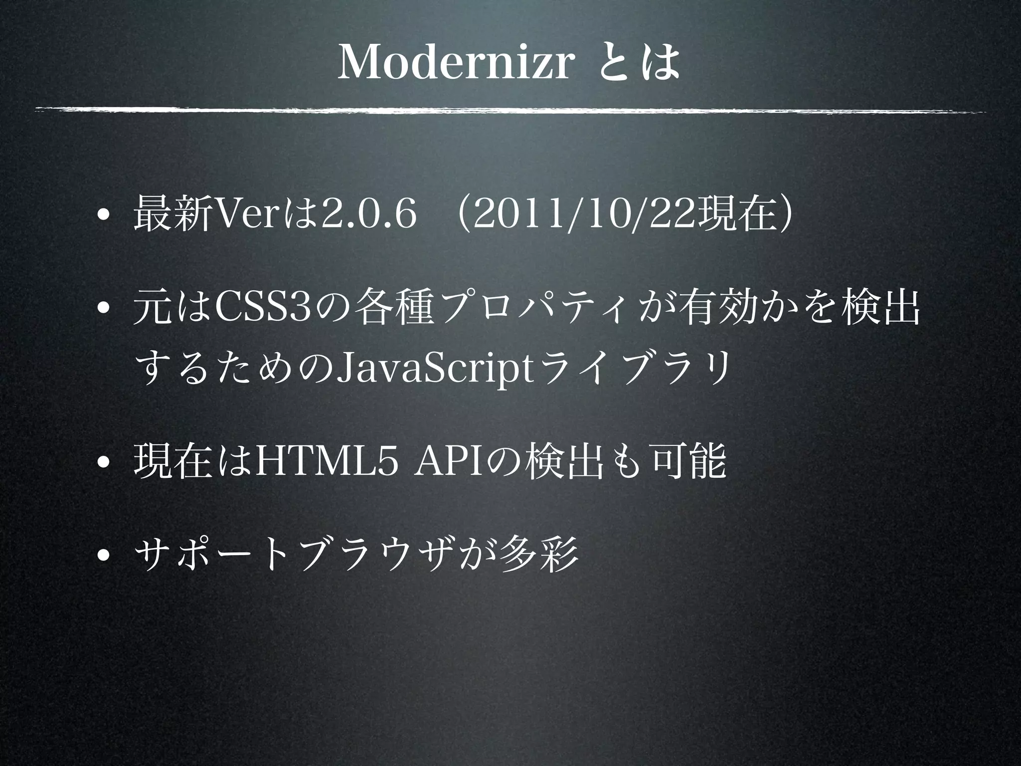 <!DOCTYPE html> <html lang="ja"> ! <head> ! ! <meta charset="UTF-8" /> ! ! <script src="prettyprint.js"></script> ! ! <script src="modernizr.js"></script> ! </head> ! <body> ! ! <div id="debug"></div> ! ! <script> ! ! ! var info = prettyPrint(Modernizr); ! ! ! document.getElementById("debug").appendChild(info); ! ! </script> ! </body> </html> - 21.