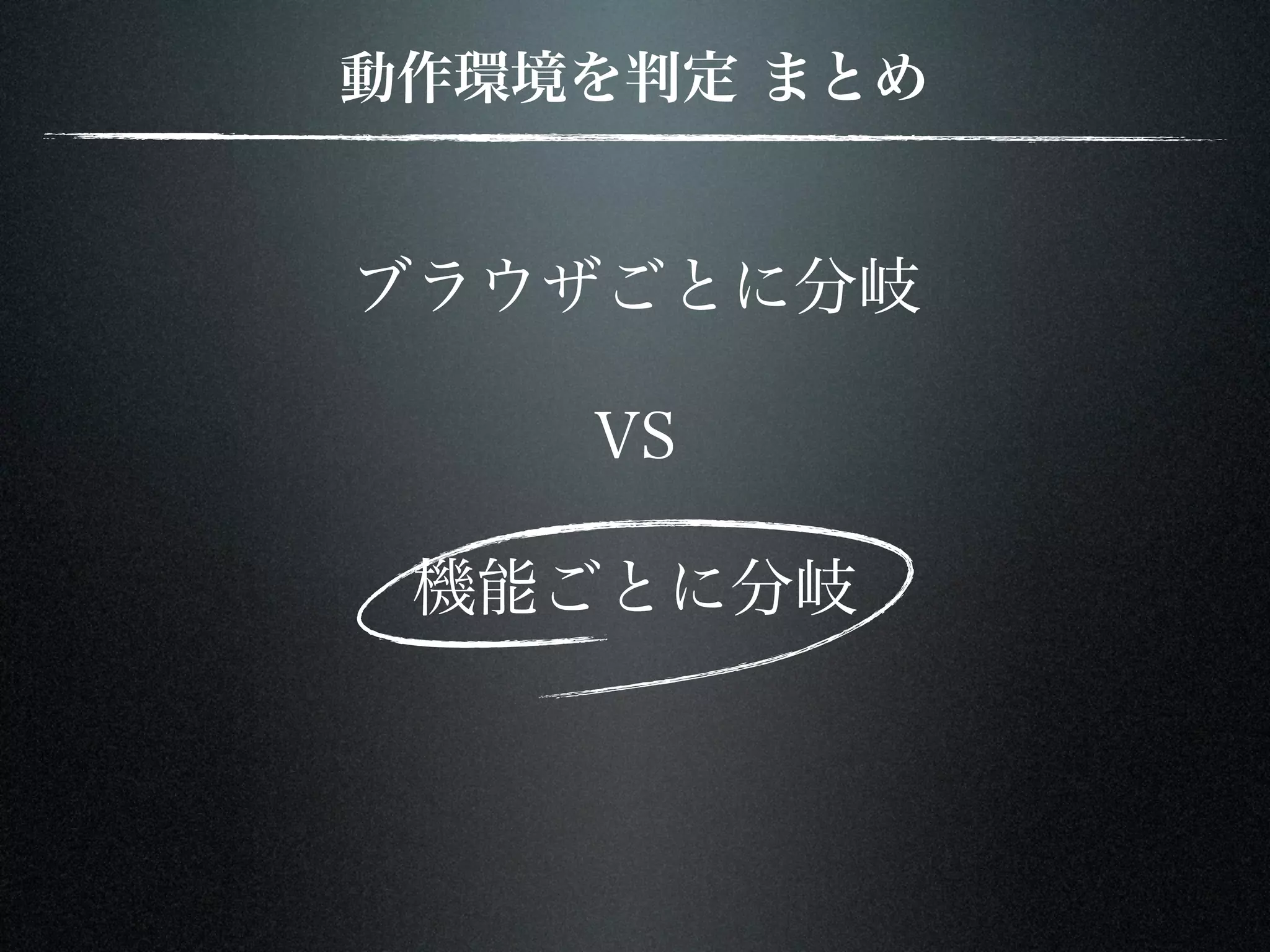 var evt ={}; if (Modernizr.touch) { ! evt.down = "touchstart"; ! evt.move = "touchmove"; ! evt.up = "touchend"; } else { ! evt.down = "mousedown"; ! evt.move = "mousemove"; ! evt.up = "mouseup"; } document.getElementById("hogehoge").addEventListener(evt.up, function(e) { ! alert(" "); }, false); - 25.