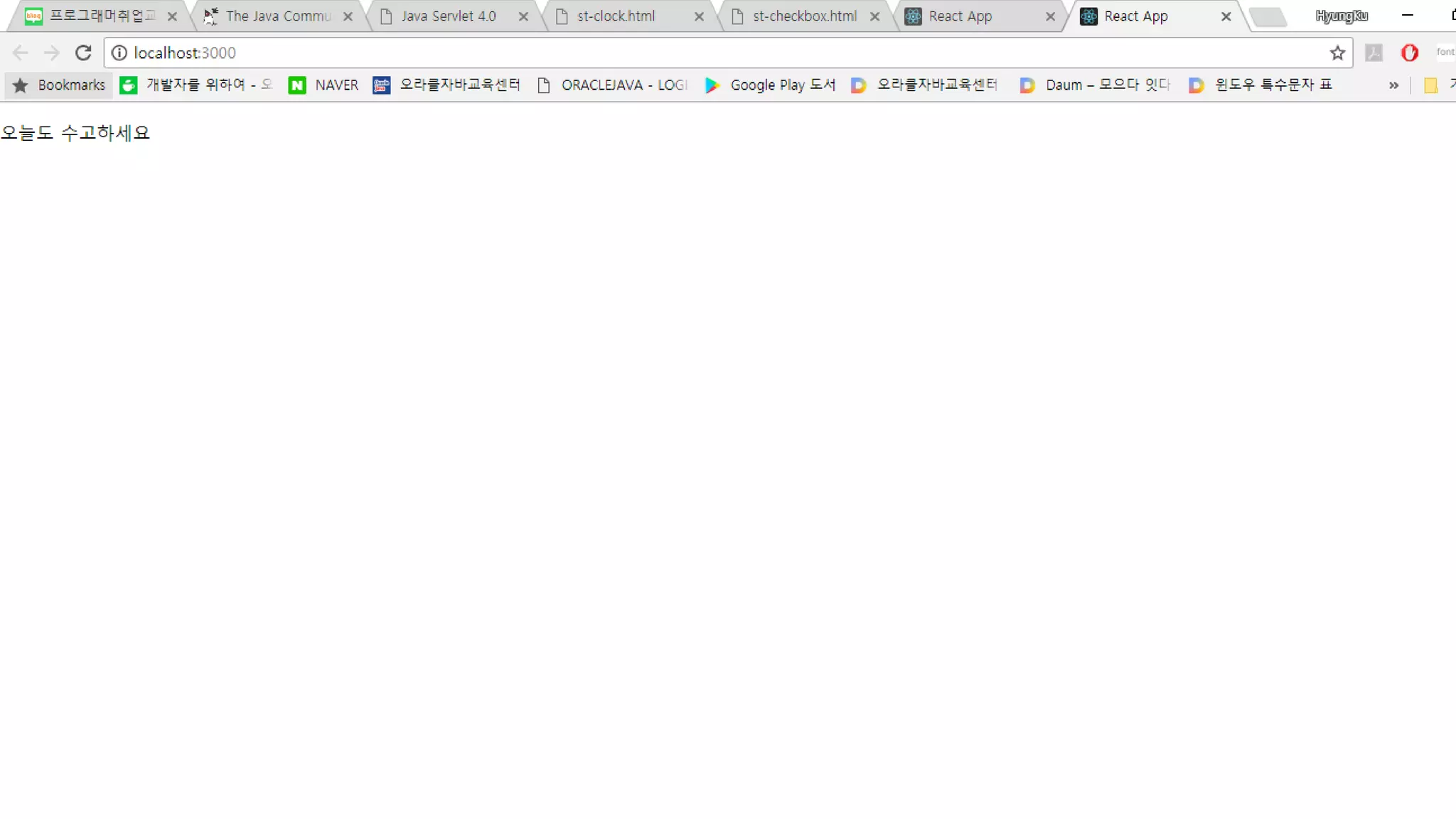 함수의 사용 // 인사말을취득해서 DOM에 설정 --- (※4) const root = document.querySelector('#disp') const msg = getGreeting() ReactDOM.render(msg, root) // 인사를 하는 함수 --- (※5) function getGreeting () { // 랜덤한 값을 취득 const r = Math.floor(Math.random() * 3) // 값에 해당하는 메시지 리턴 if (r == 0) return <p>수고하세요</p> if (r == 1) return <p>안녕하세요</p> if (r == 2) return <p>좋은 하루 되세요</p> }
