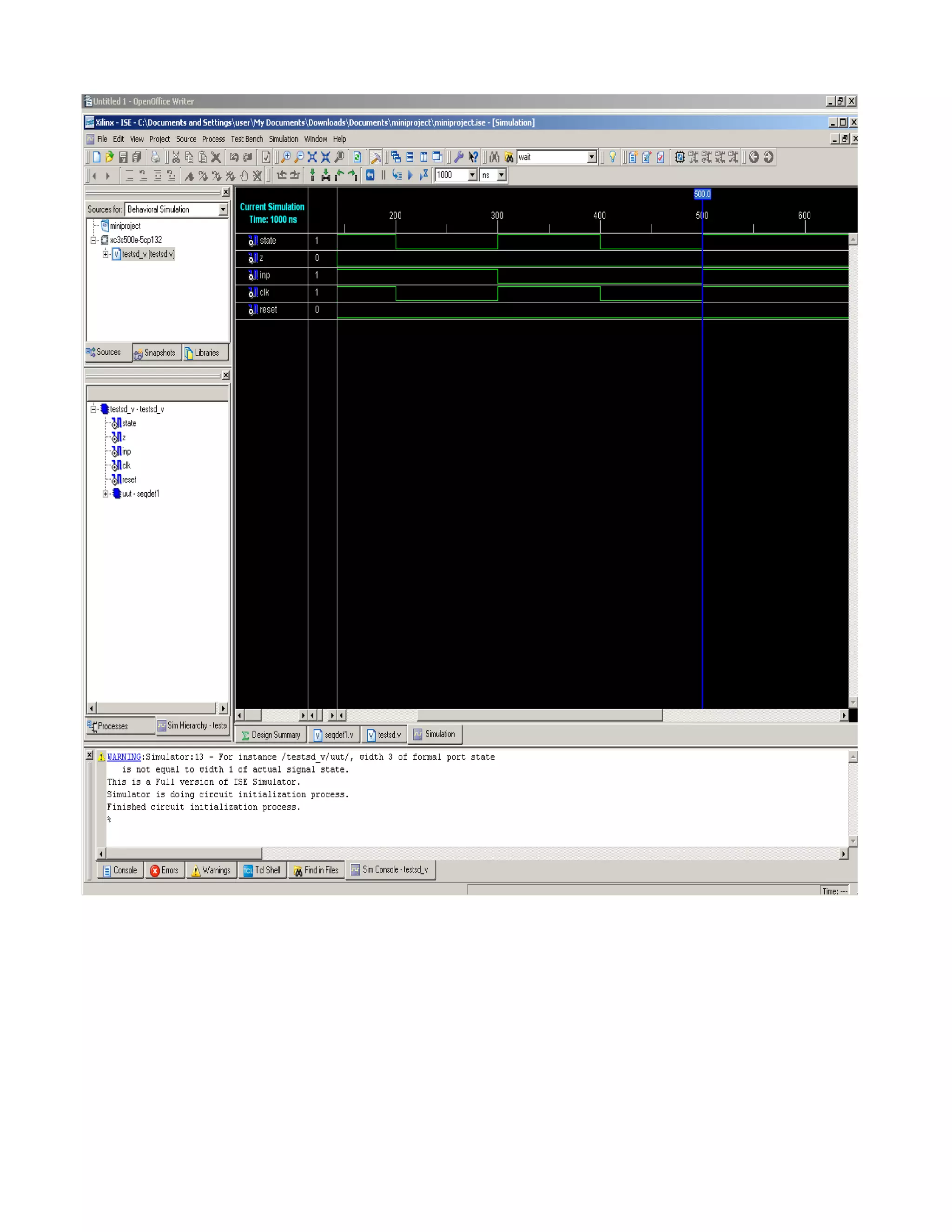 This document describes an experiment to implement a sequence detector using behavioral modeling. The sequence detector will output a 1 when it detects the input sequence of 11011. It includes the state transition diagram for detecting the 1011 sequence and the Verilog code for the sequence detector module. The code defines the different states like s0, s1, etc. and uses case statements to transition between the states based on the current input and update the output. The learning outcome is understanding how to detect a sequence step-by-step and learning Xilinx software commands.