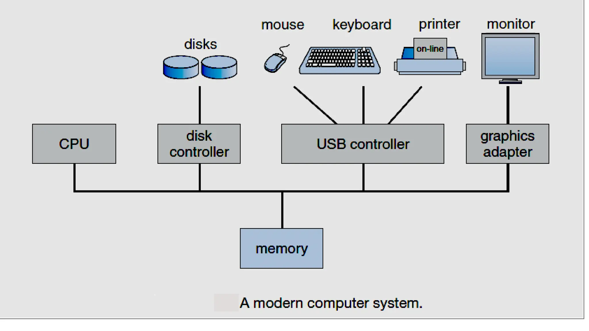 Computer-System Operation •CPU (Oneor More) Performs logical and mathematical calculations. •Device Controllers Manage specific devices (e.g., disk drives, audio devices). •Common Bus Facilitates access to shared memory.