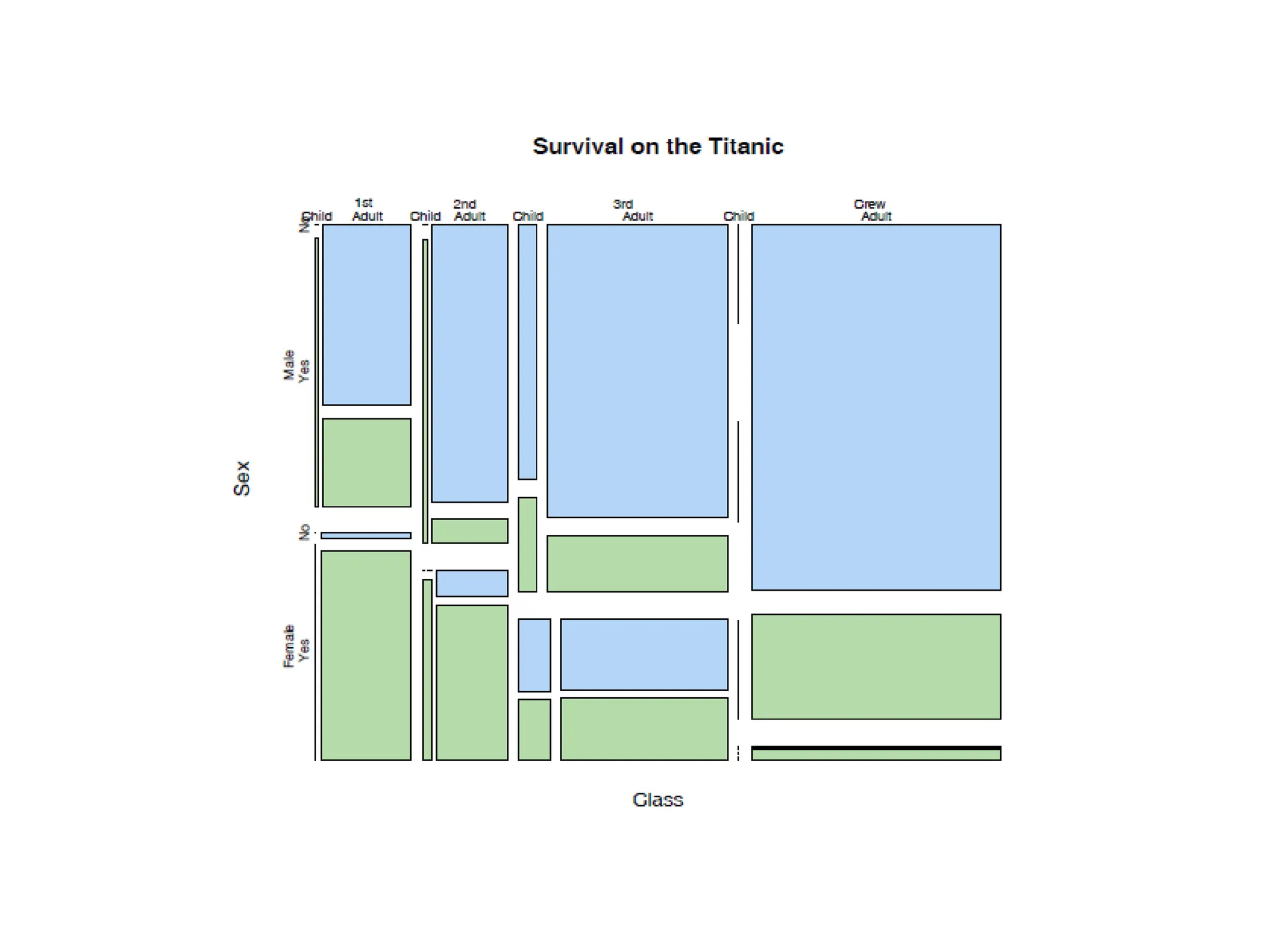 • Most implementationsof the mosaic plot offer as a default a small margin around each cell to make the graph easier to read. •This plot shows you that males were the majority of the deaths and the minority of the survivors. •As a general recommendation, variables that represent an exposure or treatment status should usually represent the first split and variables that represent an outcome should represent the second split.