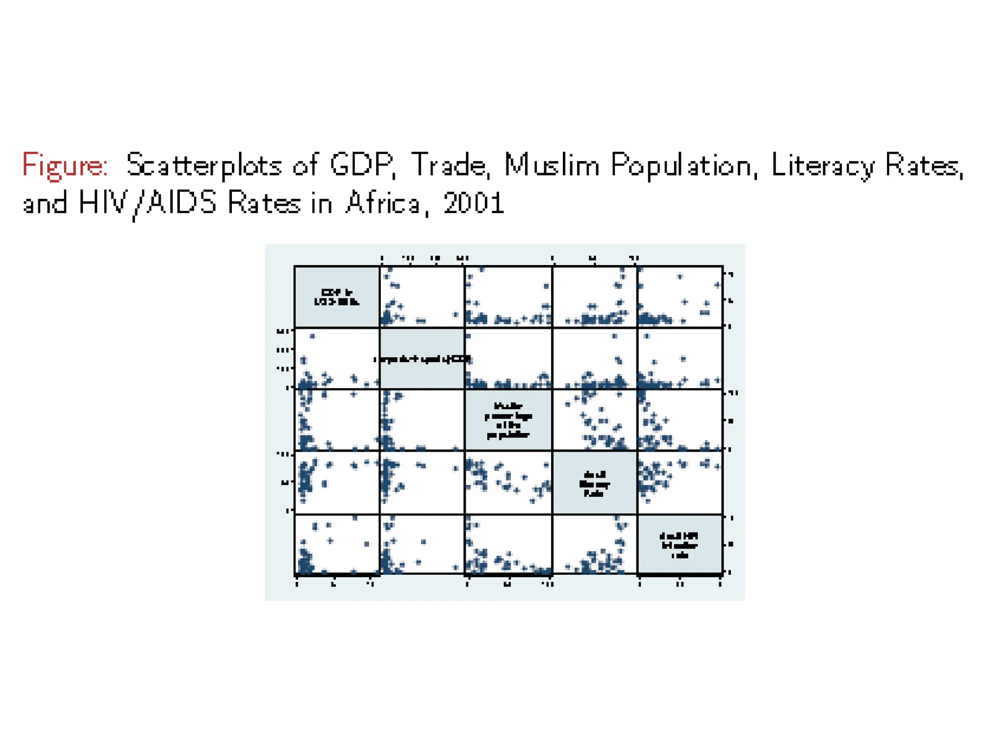 LOTS OF VARIABLES •Things become much harder when we have four or more variables. You might decide to dichotomize or discretize one or more of your variables. • Suppose we want to know whether the relationship between the Muslim percentage of the population and HIV rates is moderated by the presence of civil wars and country size. • We could divide the countries into big and small and produce a four-way scatterplot.