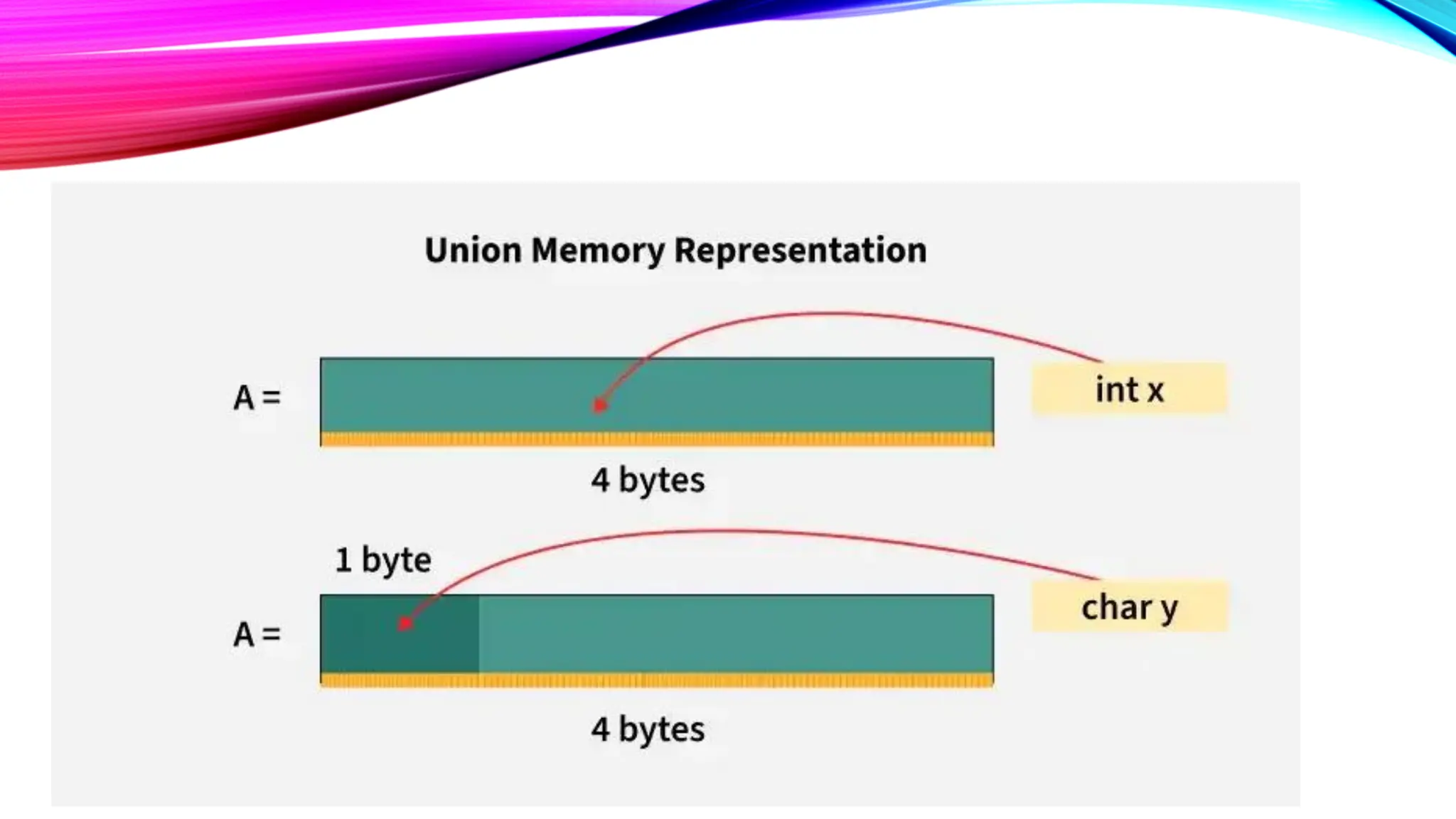 union A { int i; floatf; char s[20]; }; int main() { union A a; a.i = 10; printf("data.i = %d ", a.i); a.f = 220.5; printf("data.f = %.2f ", a.f); strcpy(a.s, "GfG"); printf("data.s = %s ", a.s); }